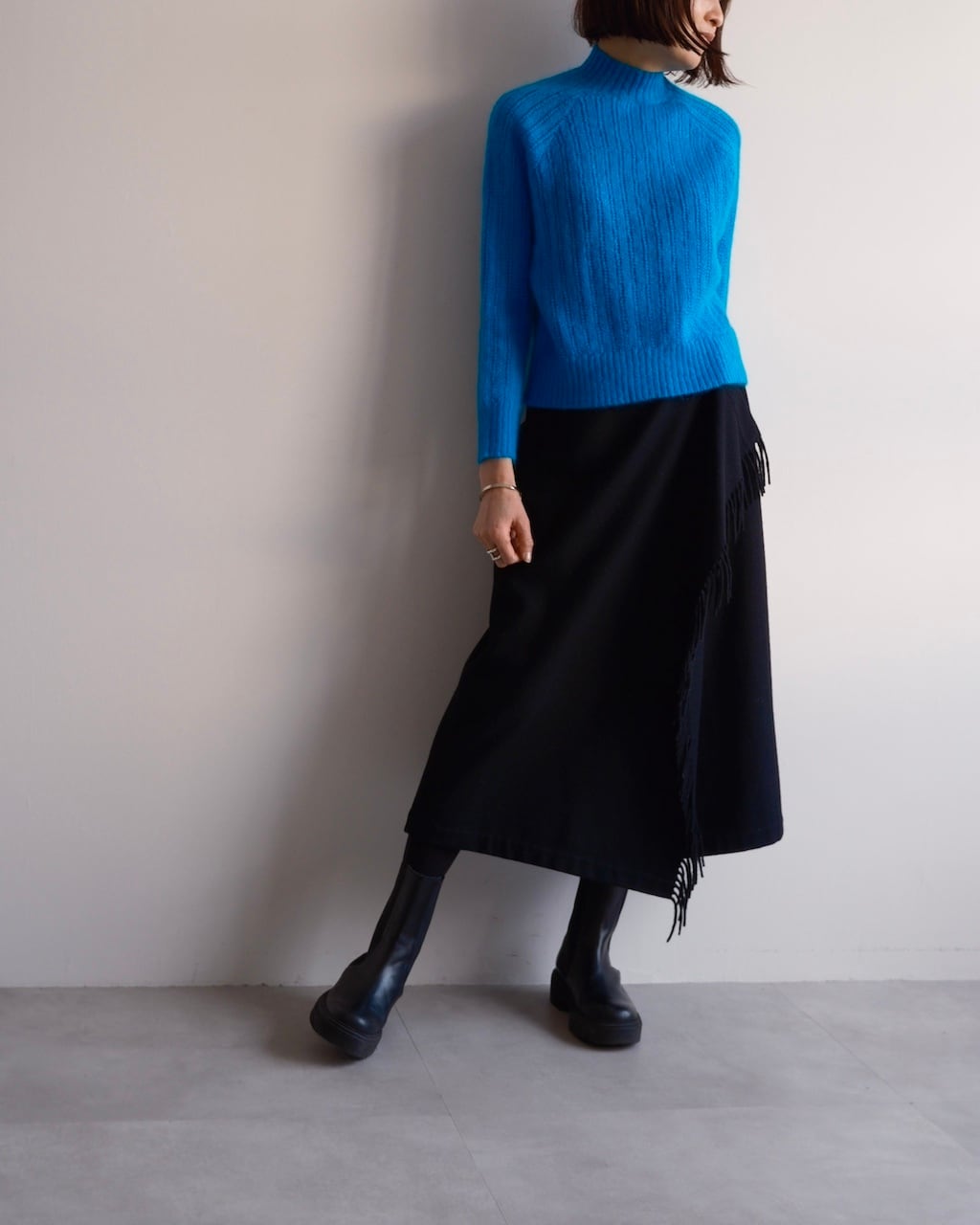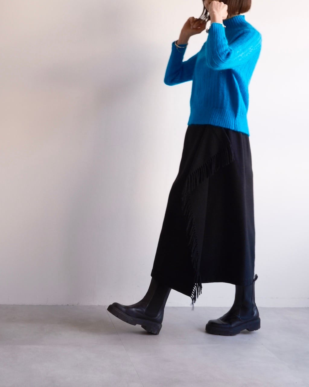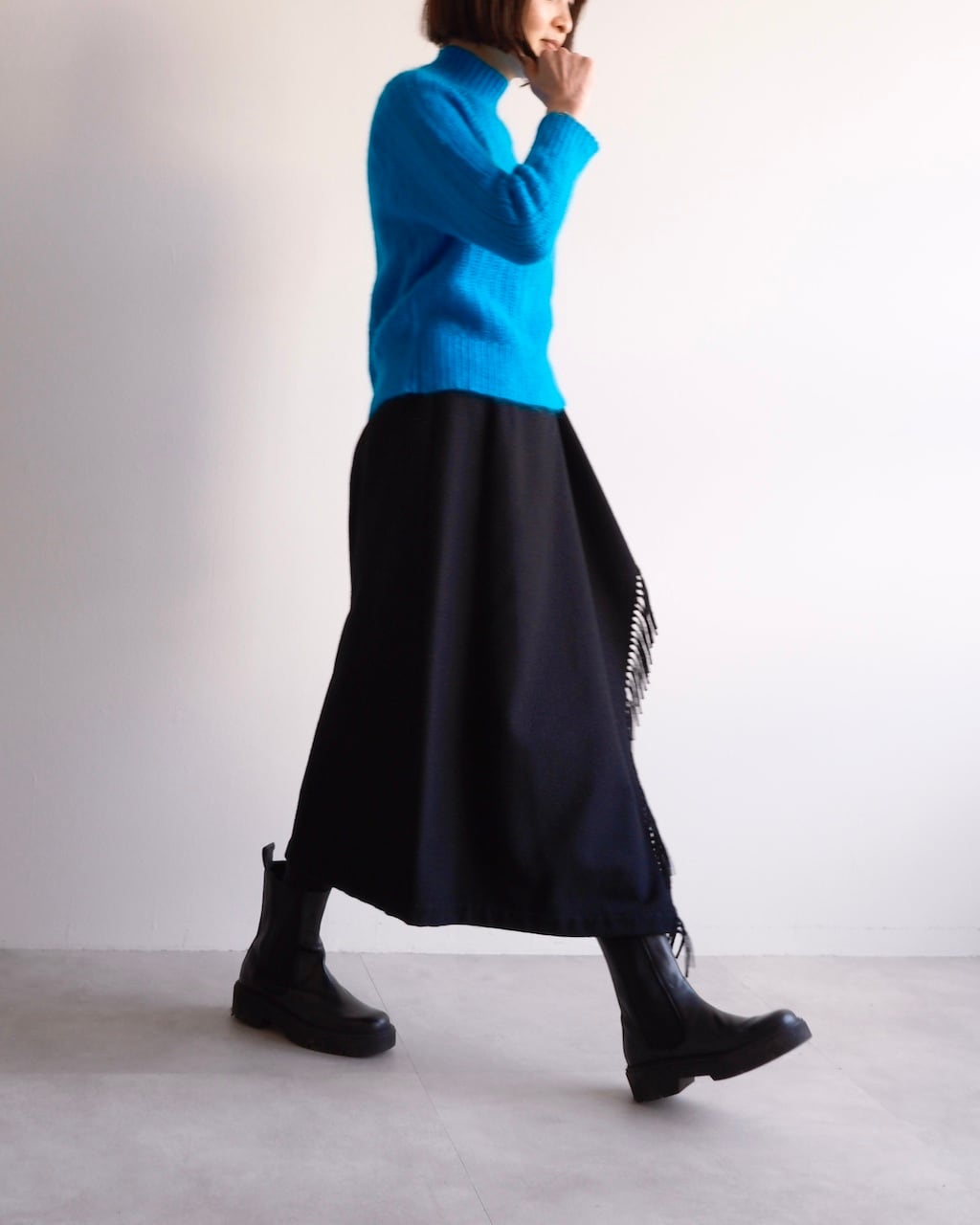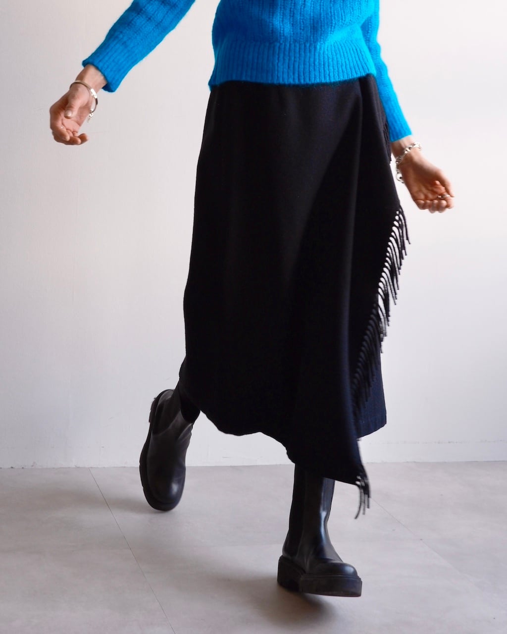 斜めに配されたフリンジが歩くたびに控えめなリズムを描き、COMME des GARÇONSらしいバランス感覚が感じられるデザインです。