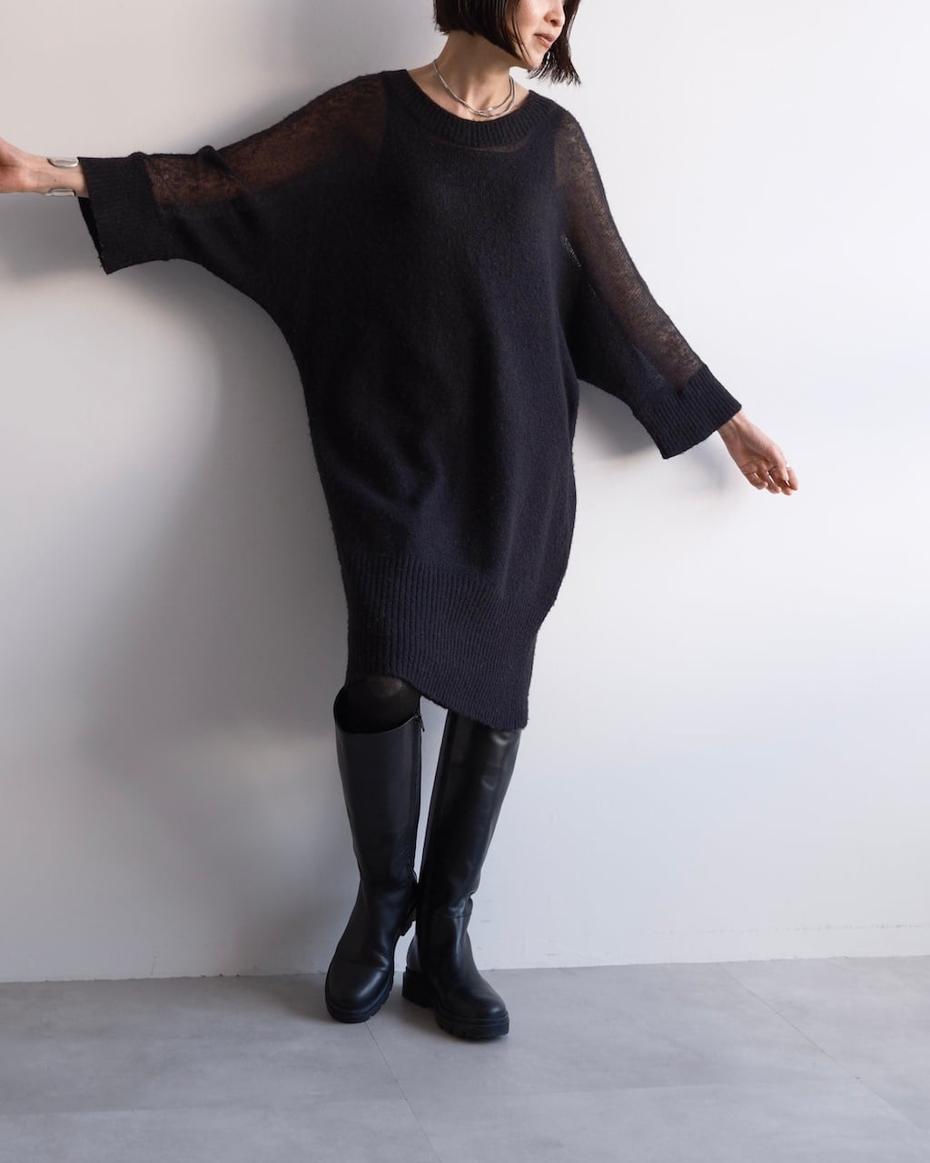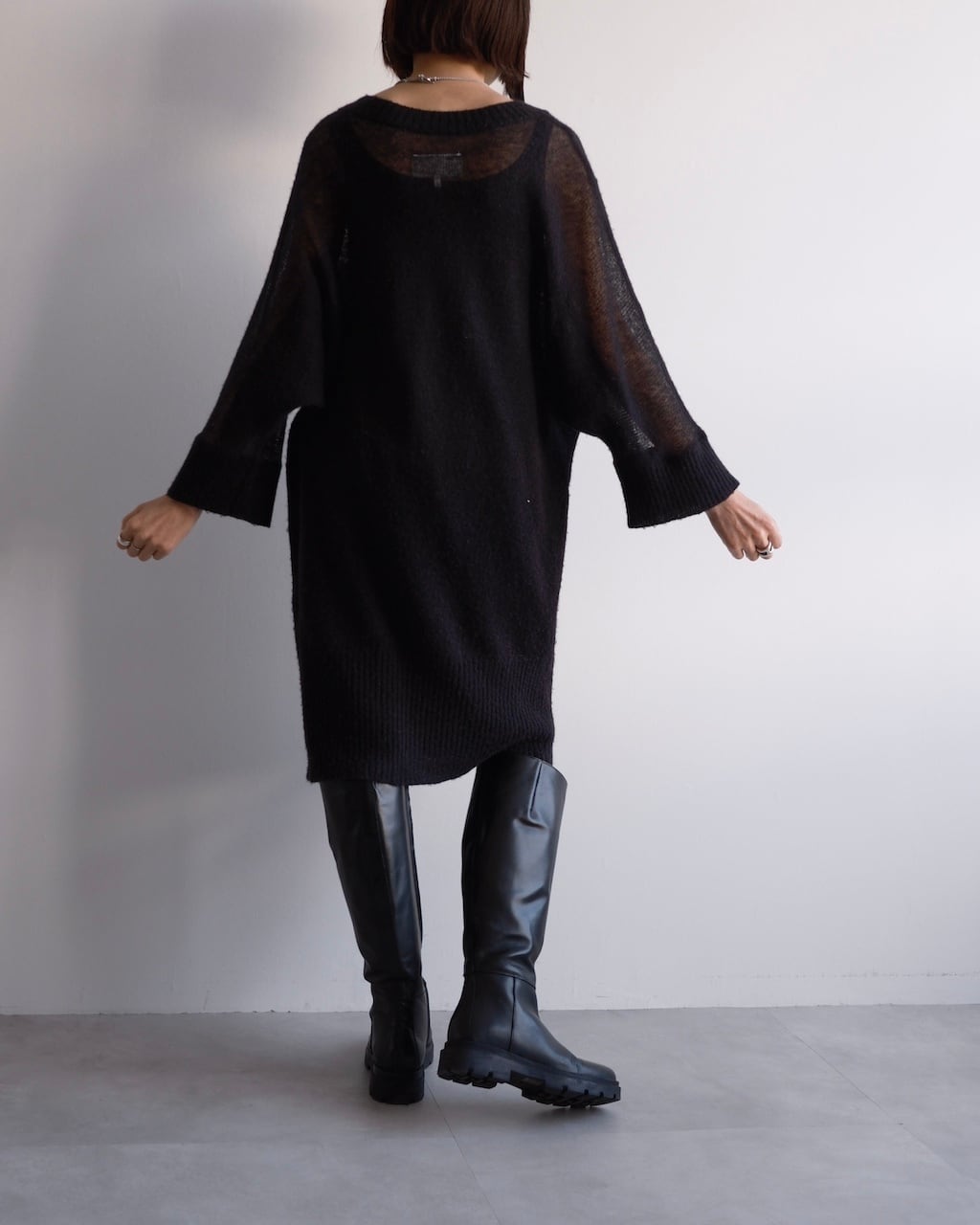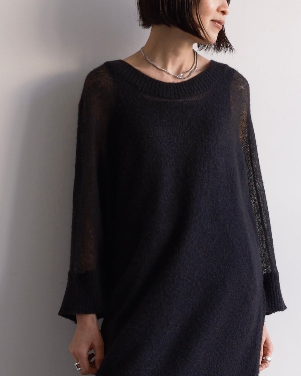 透け感とニットの分量感のバランスが印象的なニットドレス。