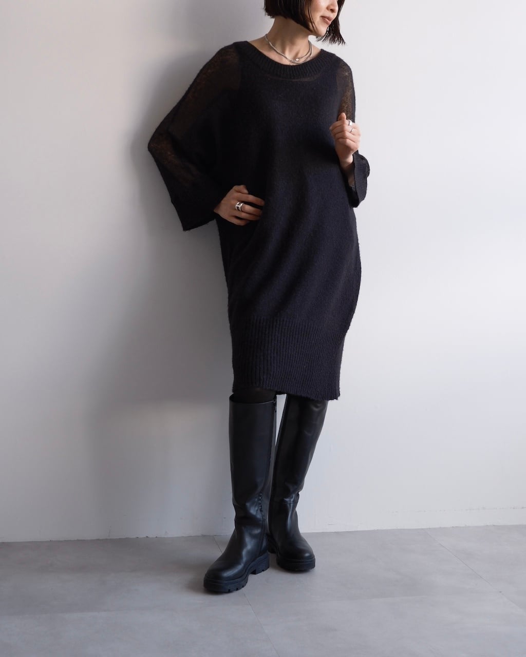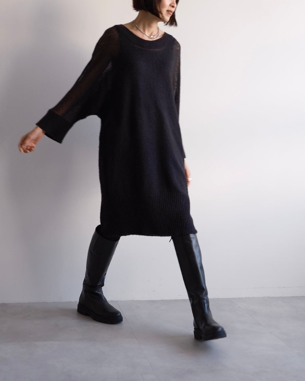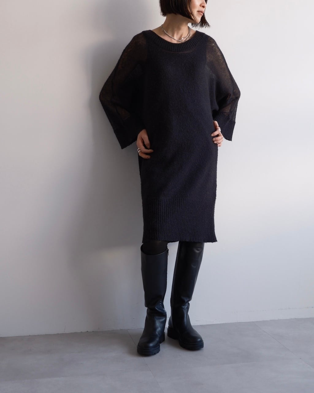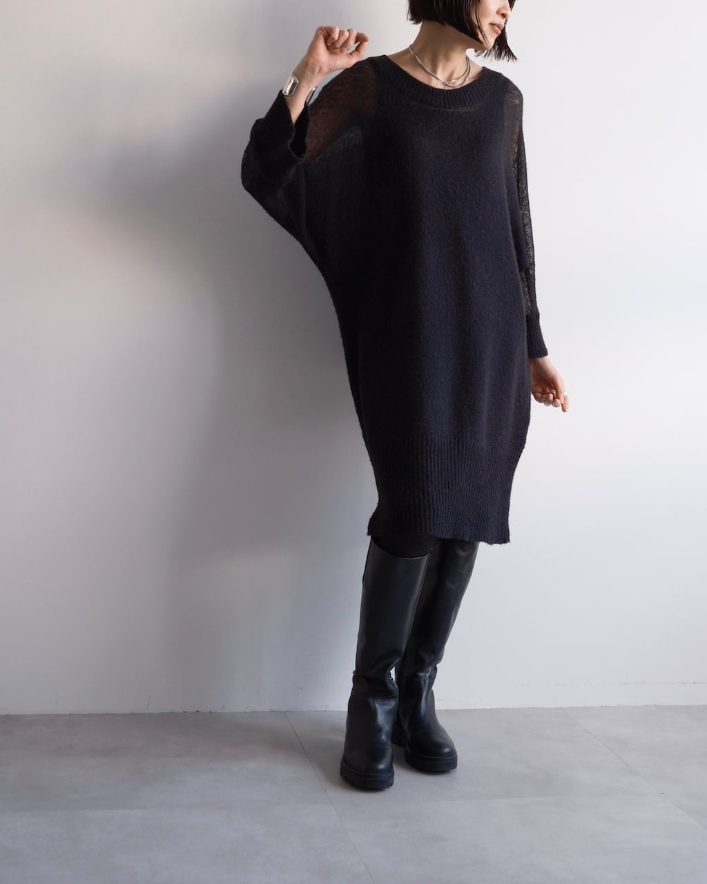 透け感とニットの分量感のバランスが印象的なニットドレス。
