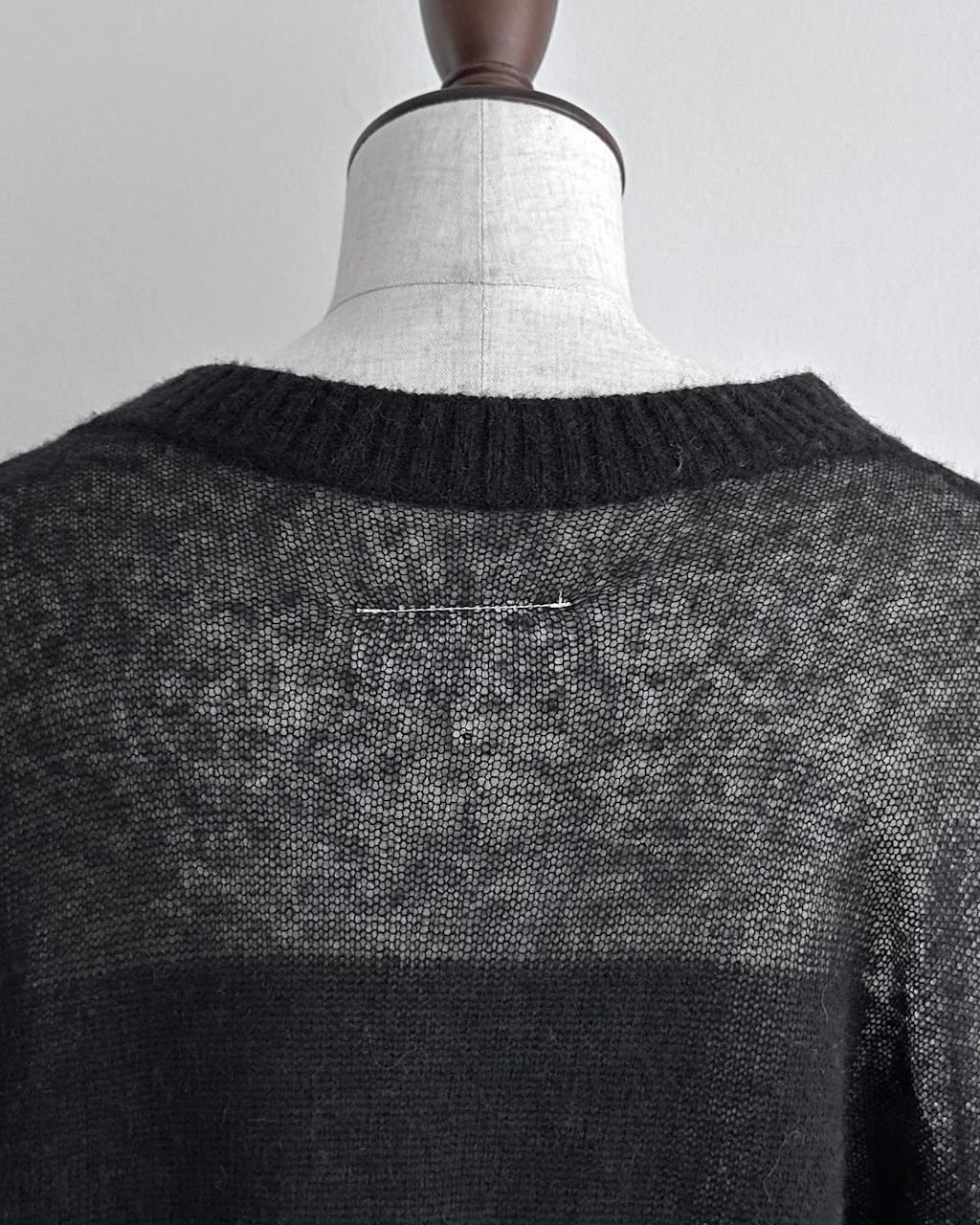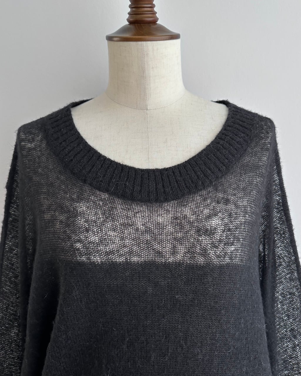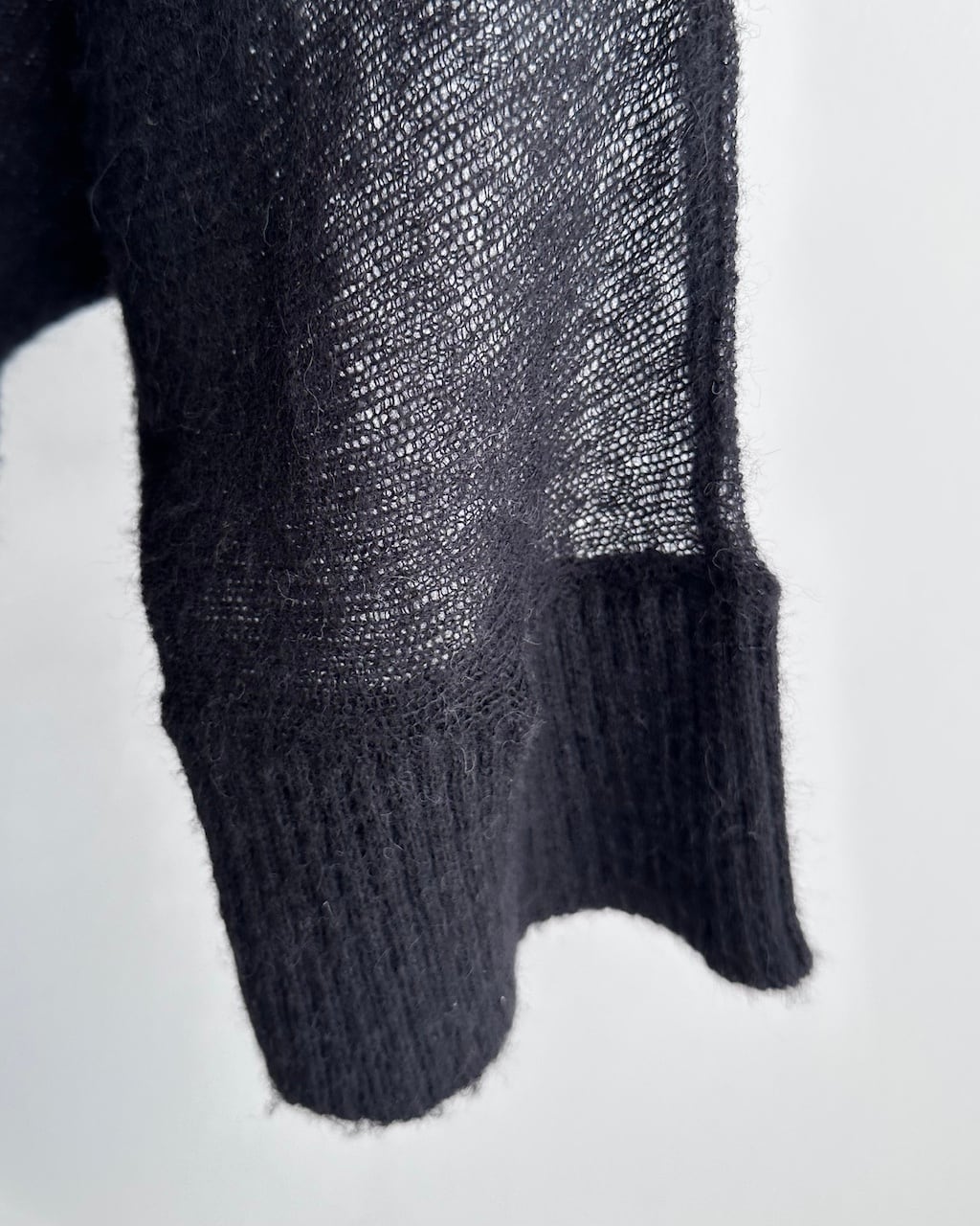 ボディとスリーブで編み地の表情を切り替え、上身頃から袖にかけては透け感のある繊細な編み、身頃下部と裾、ネックラインにはリブを配したデザインが特徴です。