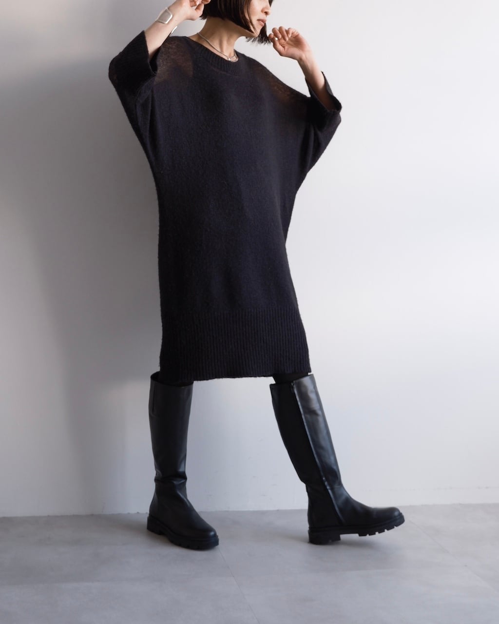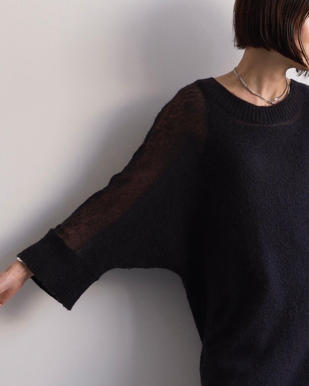 ゆったりとした身幅とドルマンスリーブのシルエットにより、体のラインを拾いすぎず、自然な落ち感のある佇まいに。