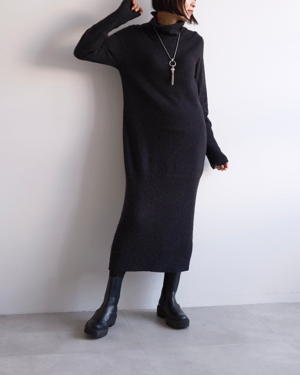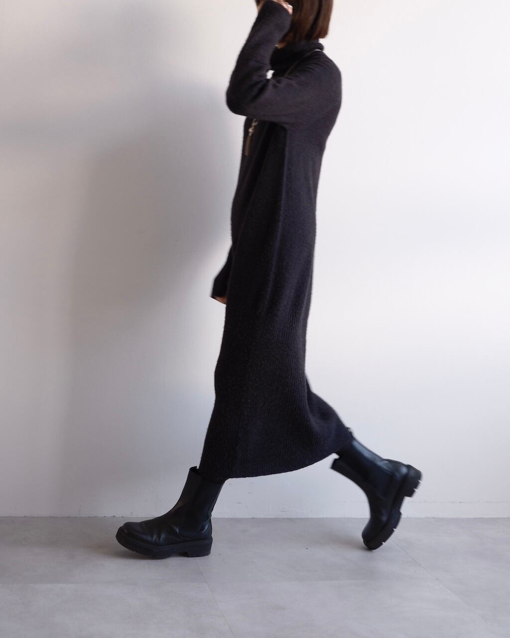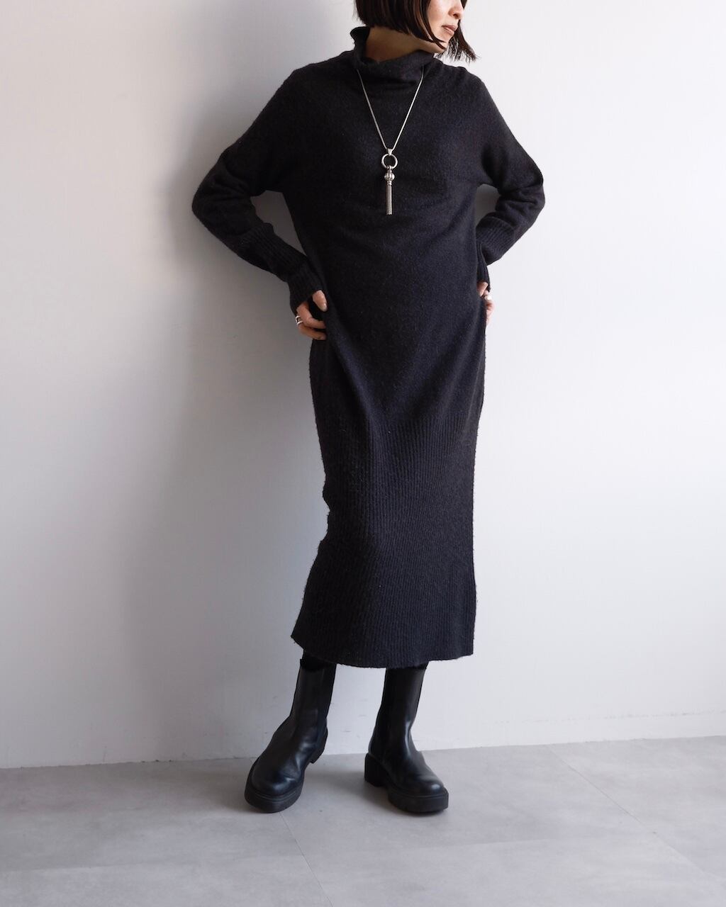 長めの着丈ながら重さを感じにくく、一枚でスタイリングが完成します。