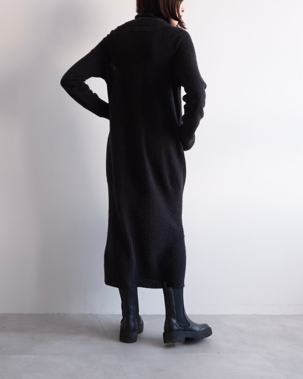 軽やかな編み地と、縦にすっと落ちるシルエットが印象的な一着。