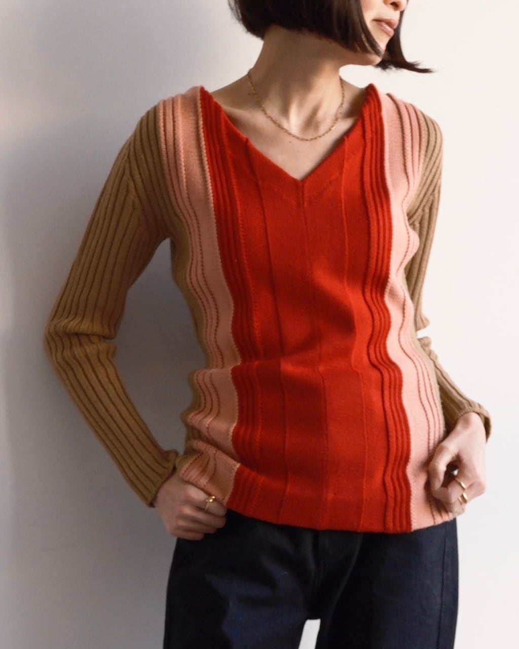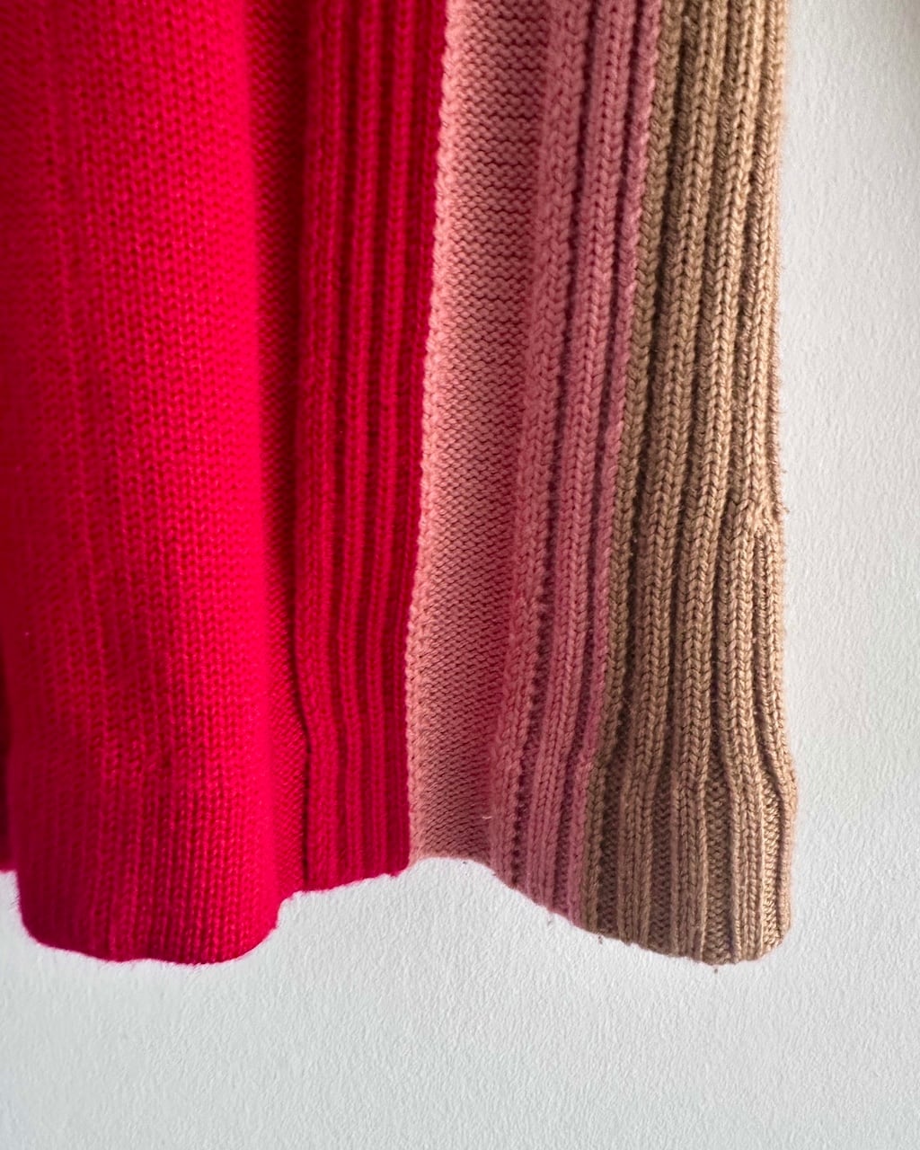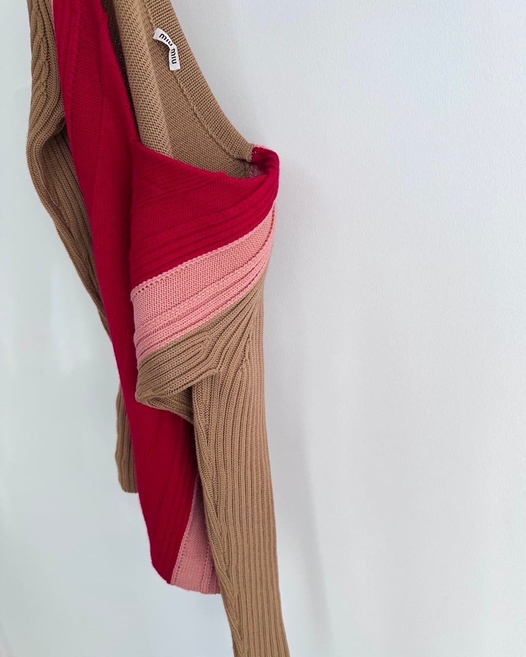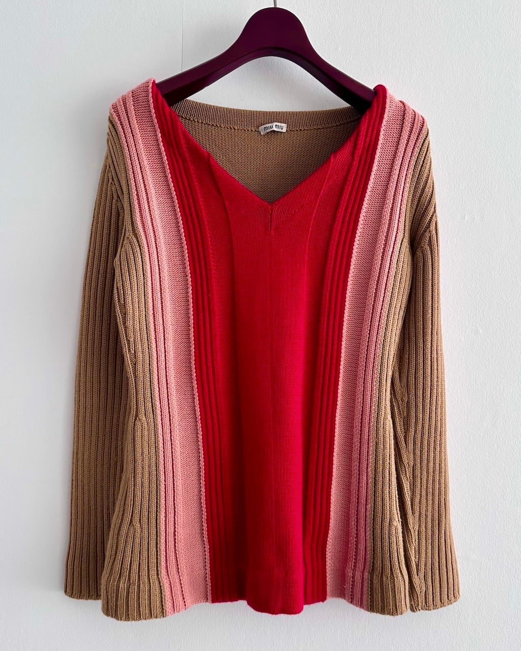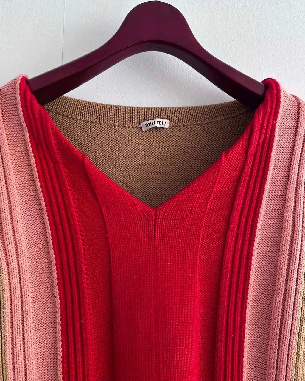 鮮やかなレッドを中心に、ピンク、キャメルベージュのカラーブロックが印象的なMIUMIUのVネックニットトップ。