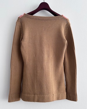 MIUMIUらしい色使いと、クラフト感のある編み立てが共存した、日常にさりげなく個性を添えてくれるニットです。
