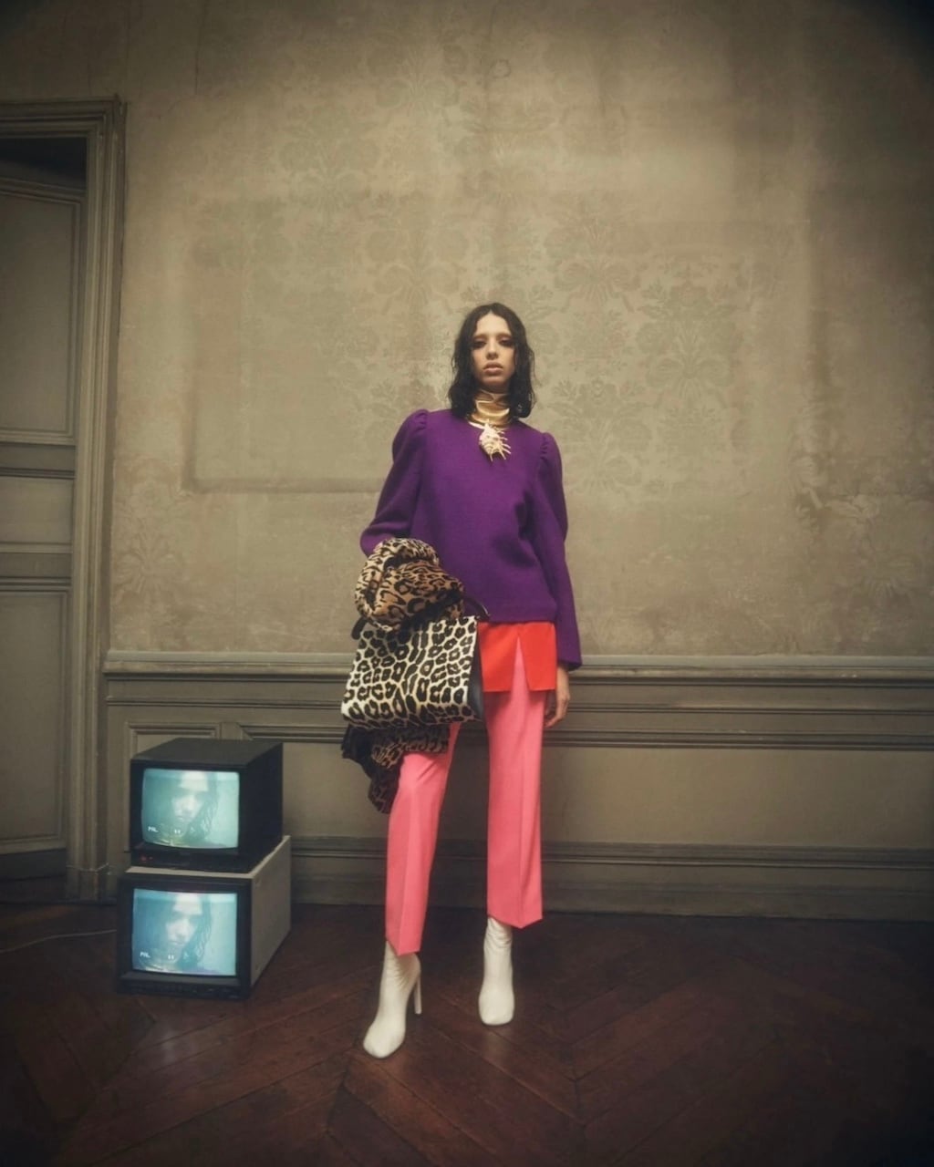 クラシックなテーラリングを基盤に、強い色彩や質感の対比を用いたスタイリングが印象的だったシーズンの中で、本アイテムもコレクションを象徴する一本として登場しています。
