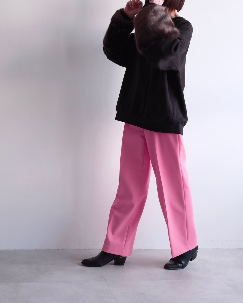 端正な腰まわりからまっすぐ落ちるストレートシルエットで、色の強さがありながらも品よく着用できる一本です。