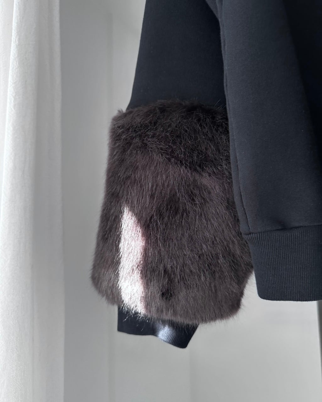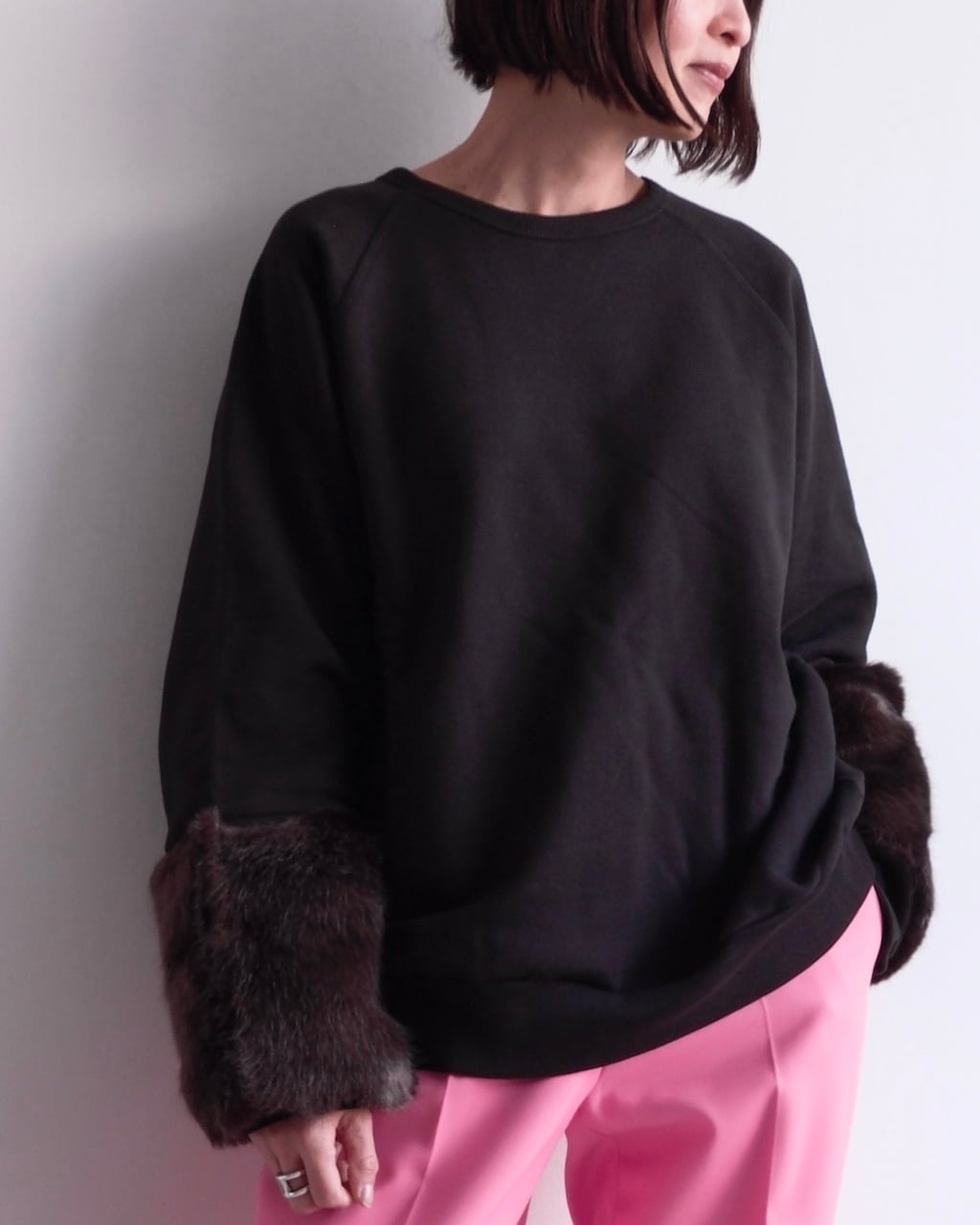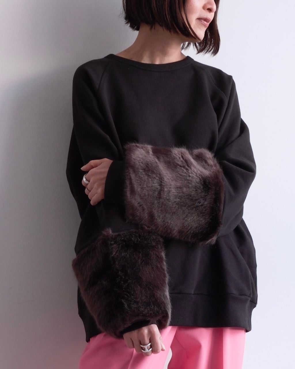 カジュアルなスウェット素材とファーという異なる要素を組み合わせることで、装いにコントラストが生まれます。