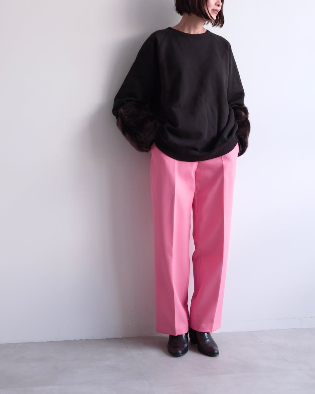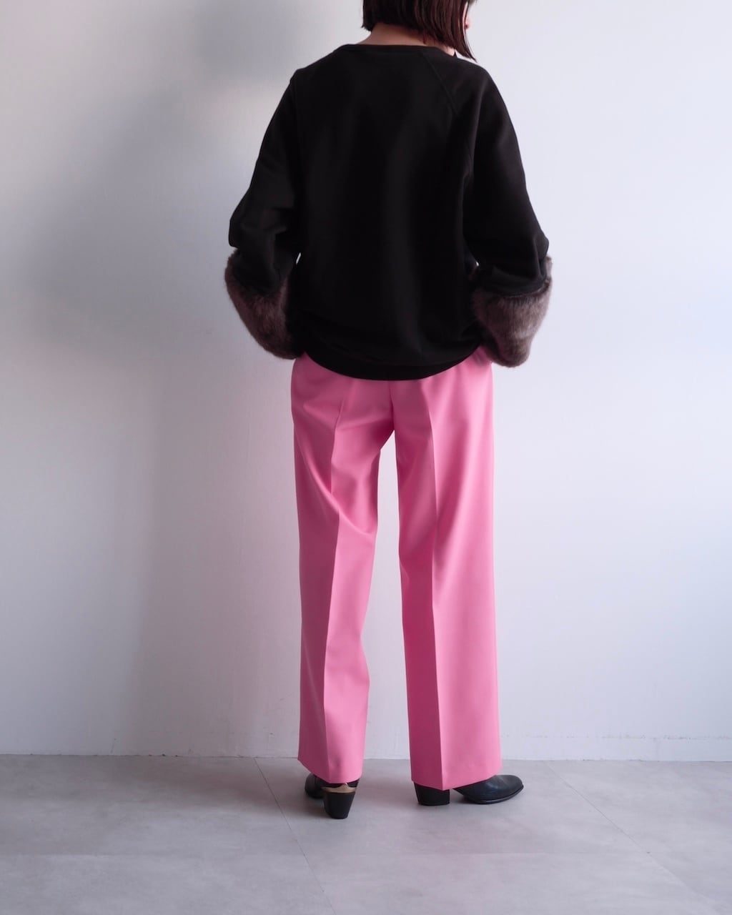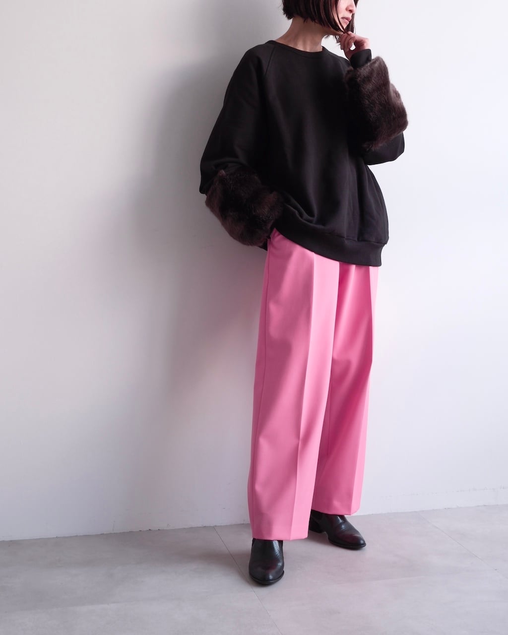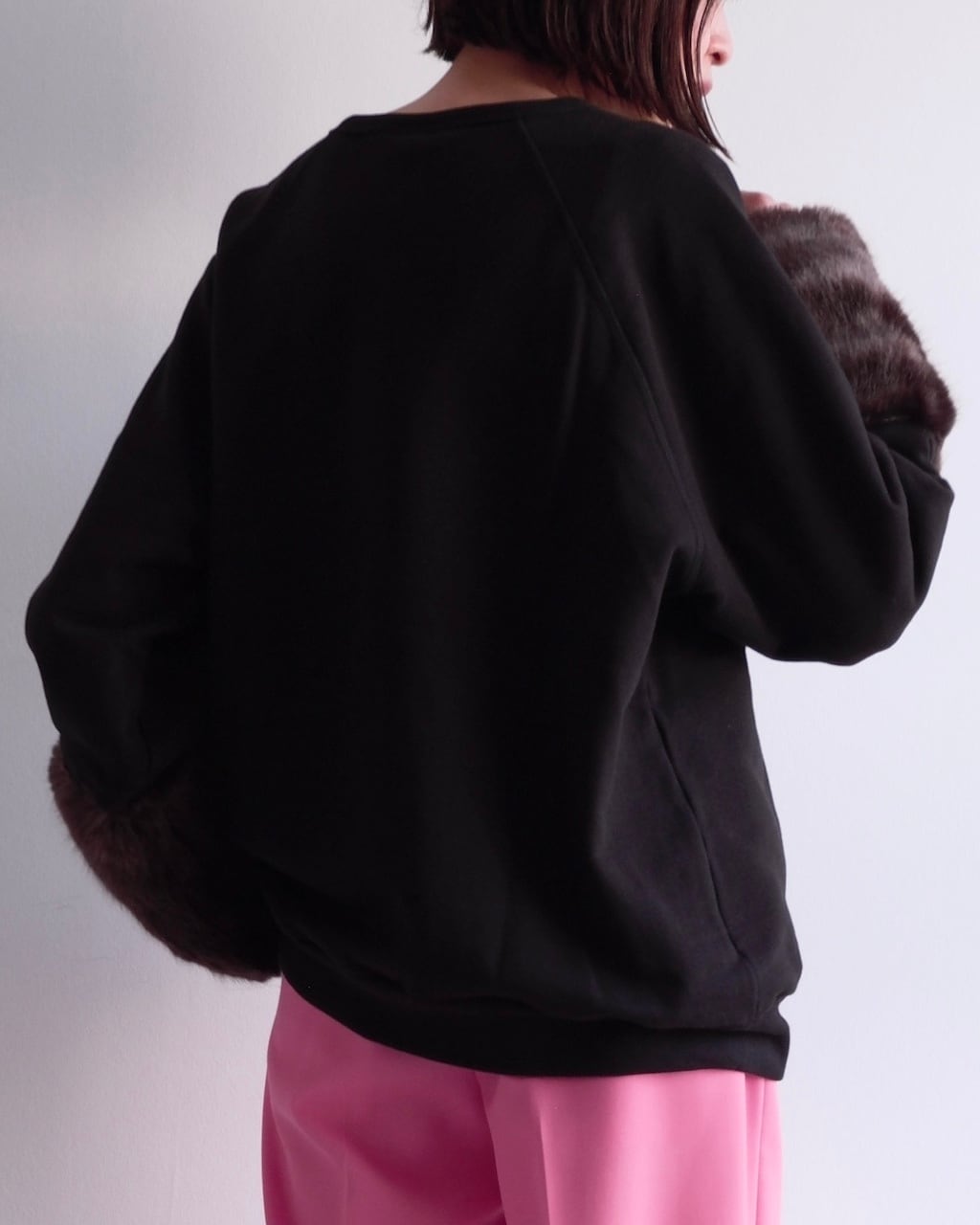 カジュアルなスウェット素材とファーという異なる要素を組み合わせることで、装いにコントラストが生まれます。