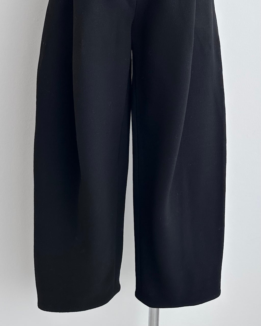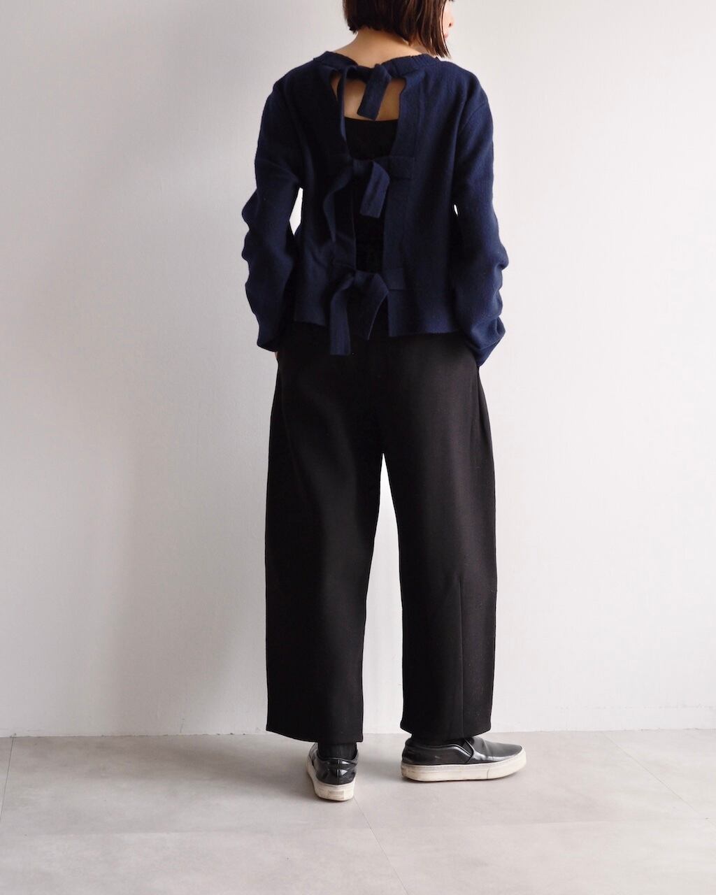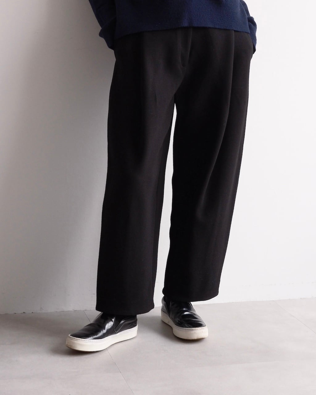 フロントに入れられたタックと生地のしっかりとしたハリにより、やや丸みを帯びた立体的なシルエットを描きます。