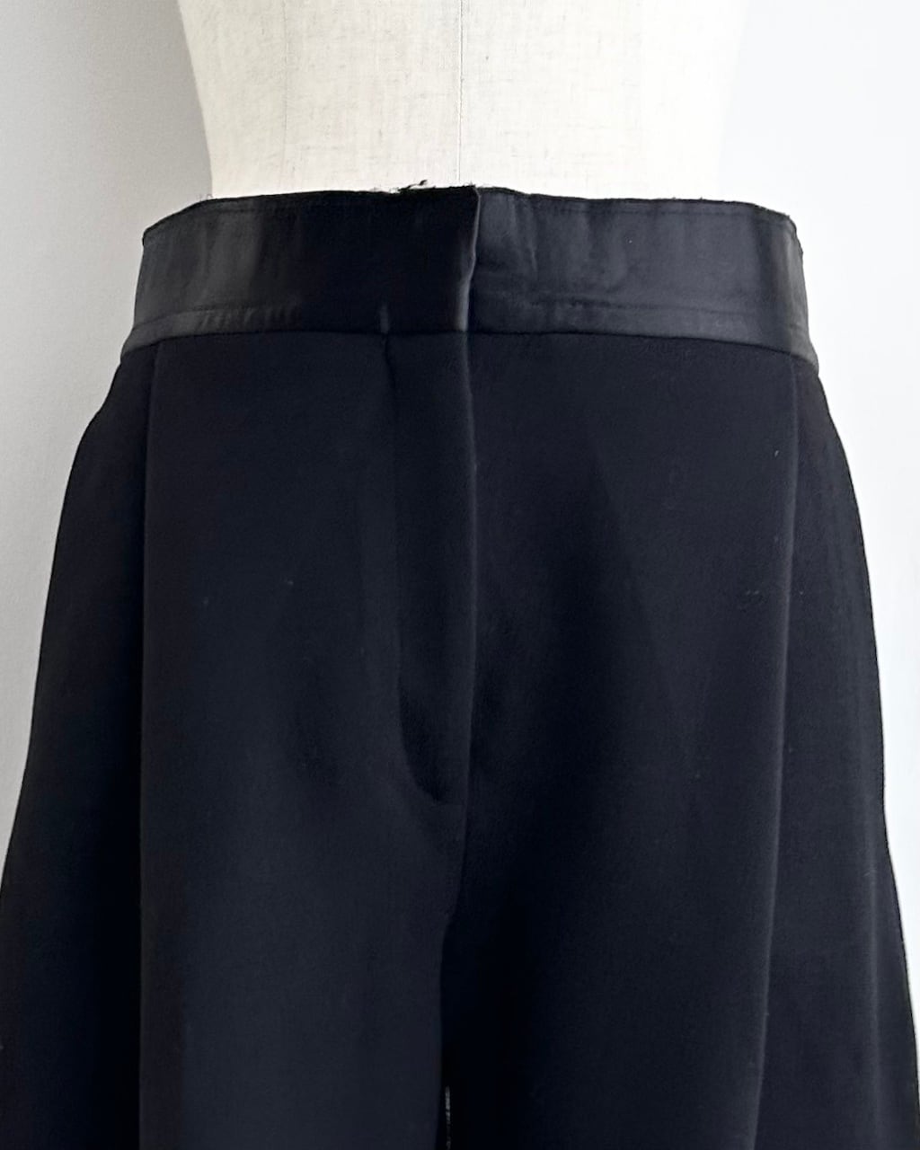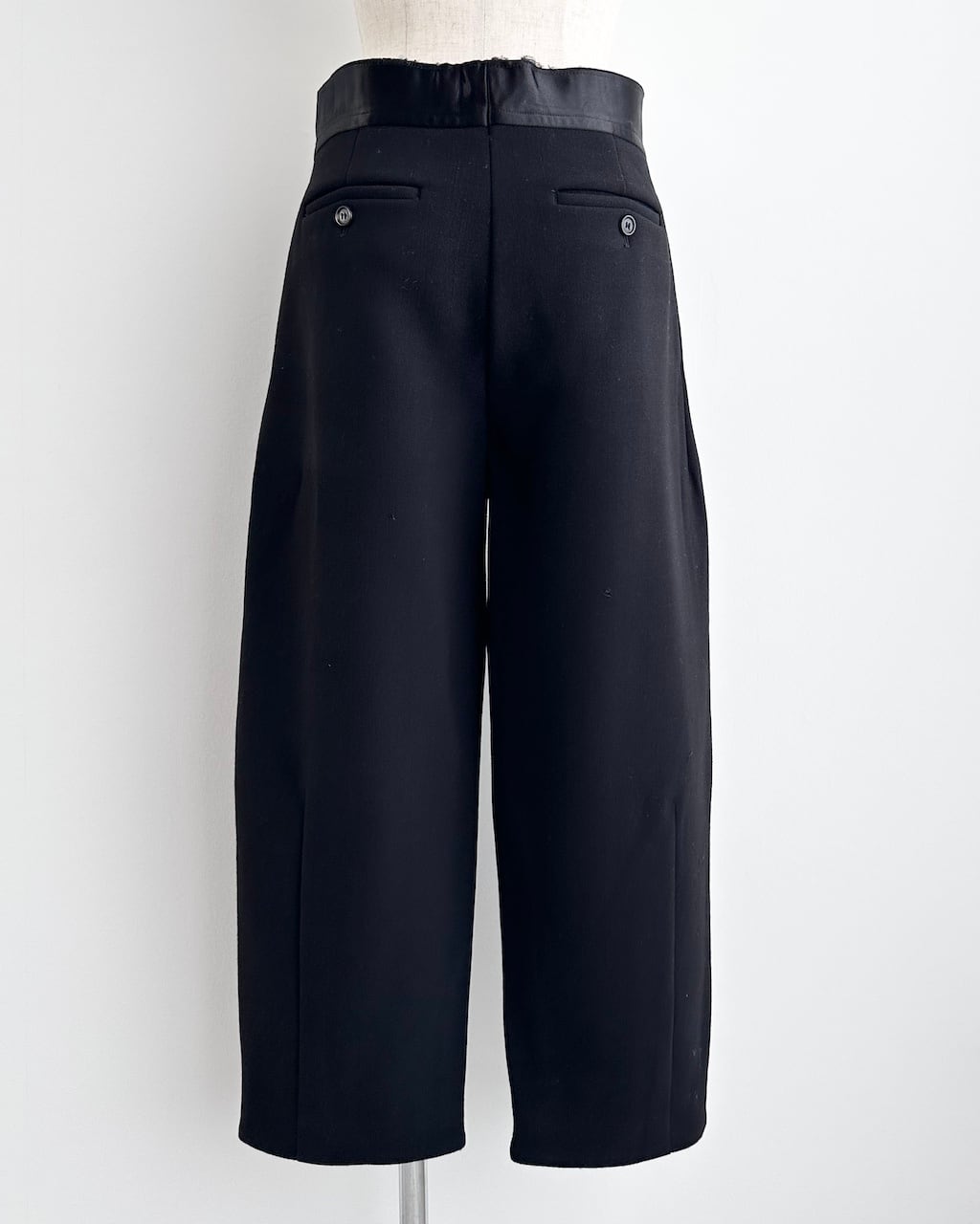 ウエスト部分は光沢のある異素材で切り替えられ、さりげないコントラストが全体を引き締めています。