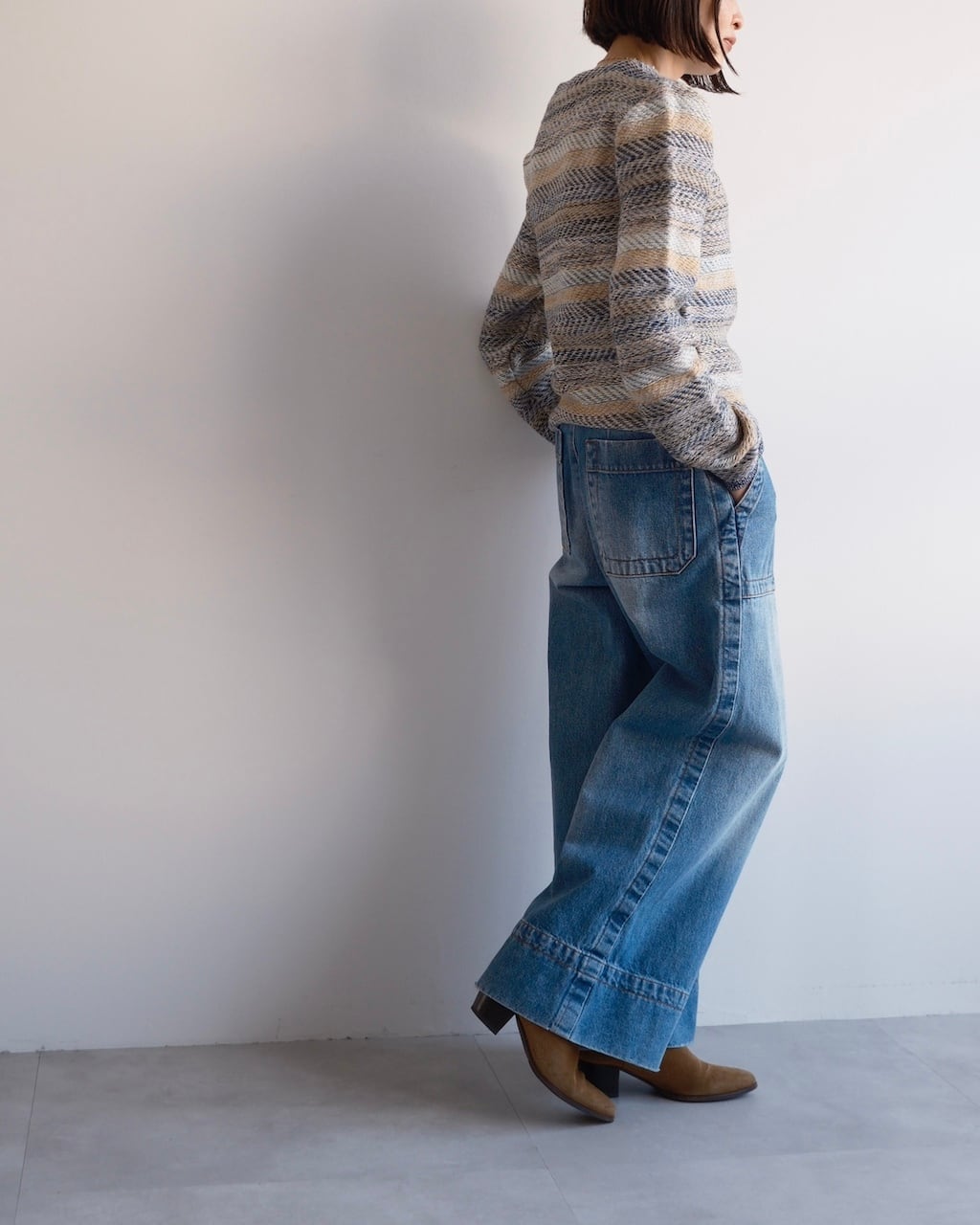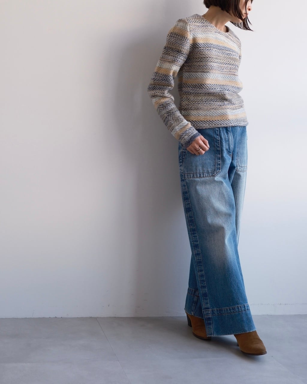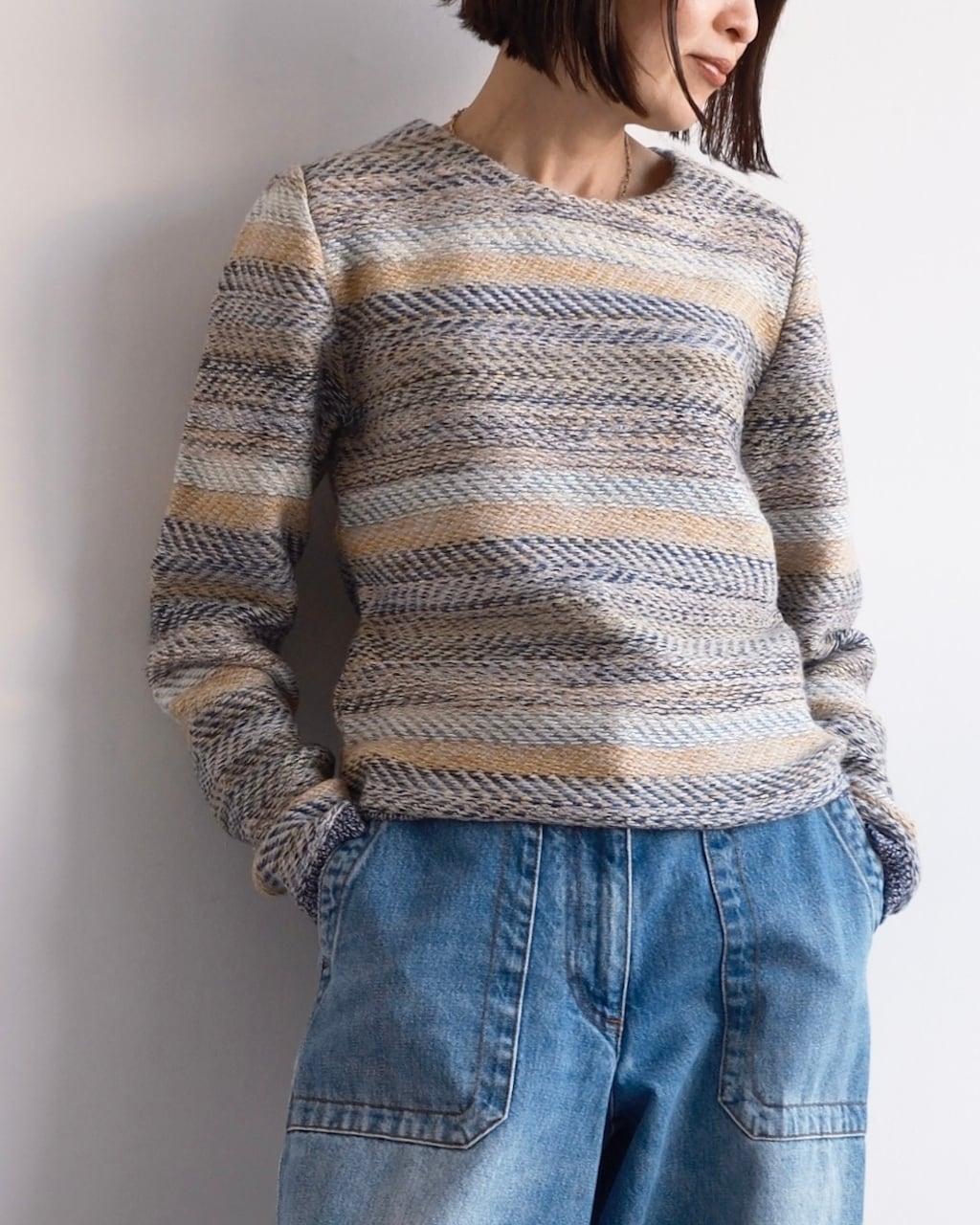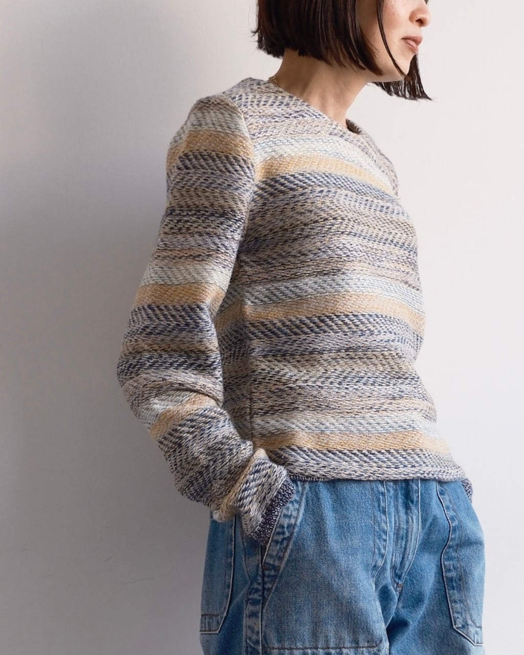 表情豊かな凹凸が生まれ、シンプルなクルーネックながら存在感のある一着に仕上がっています。