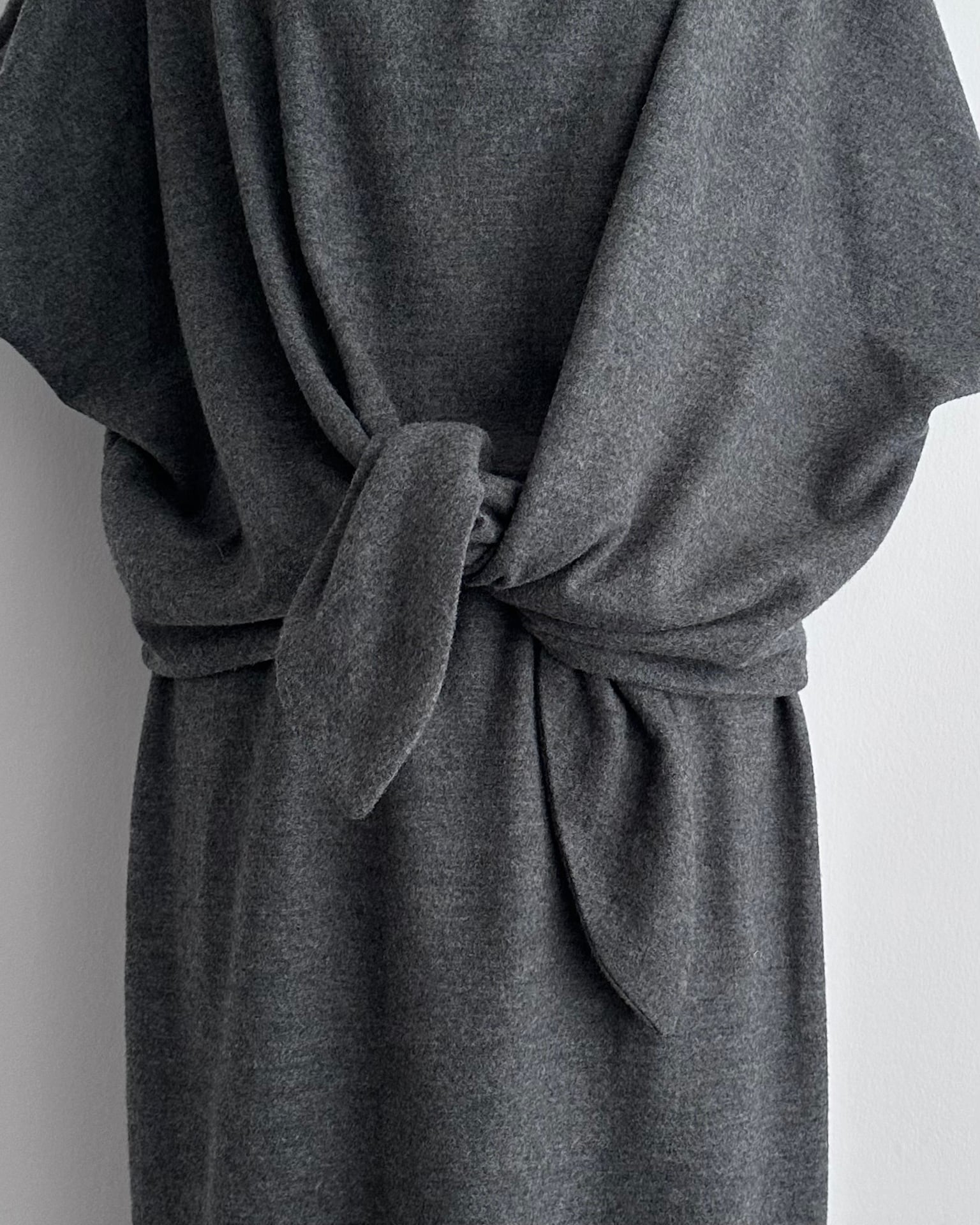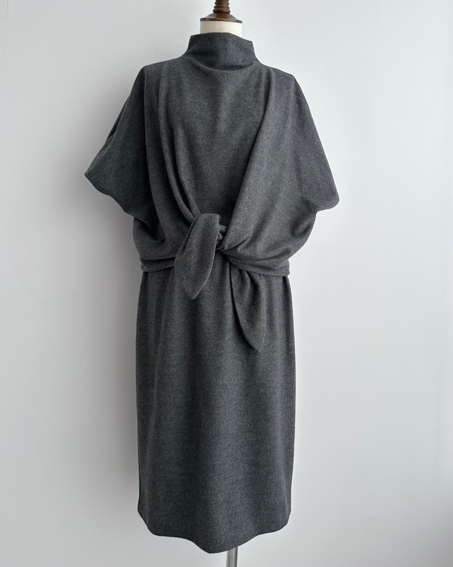 フロントの構造がこのワンピースの特徴で、大きく重なる前身頃をウエストで結ぶことで形が完成するデザインです。