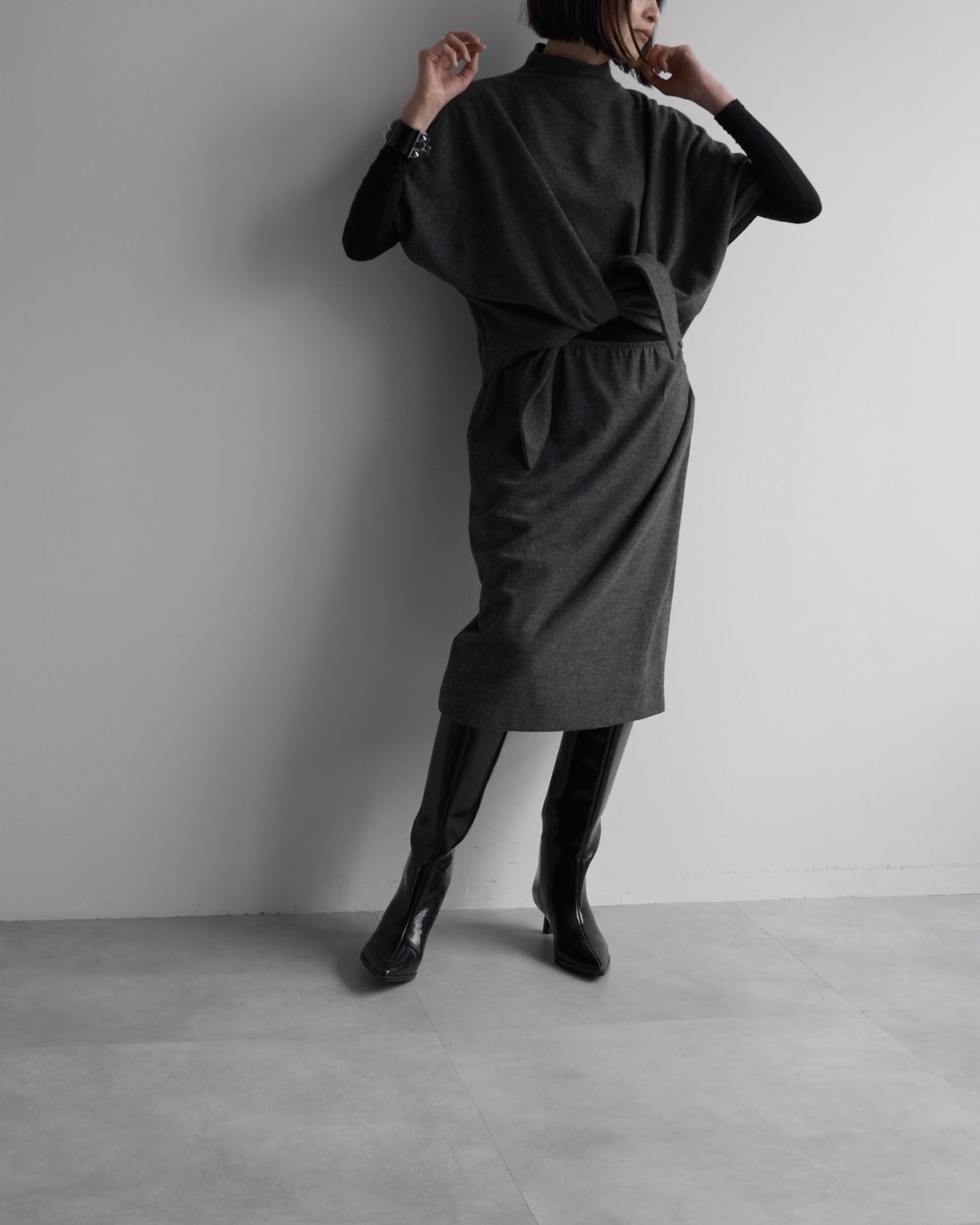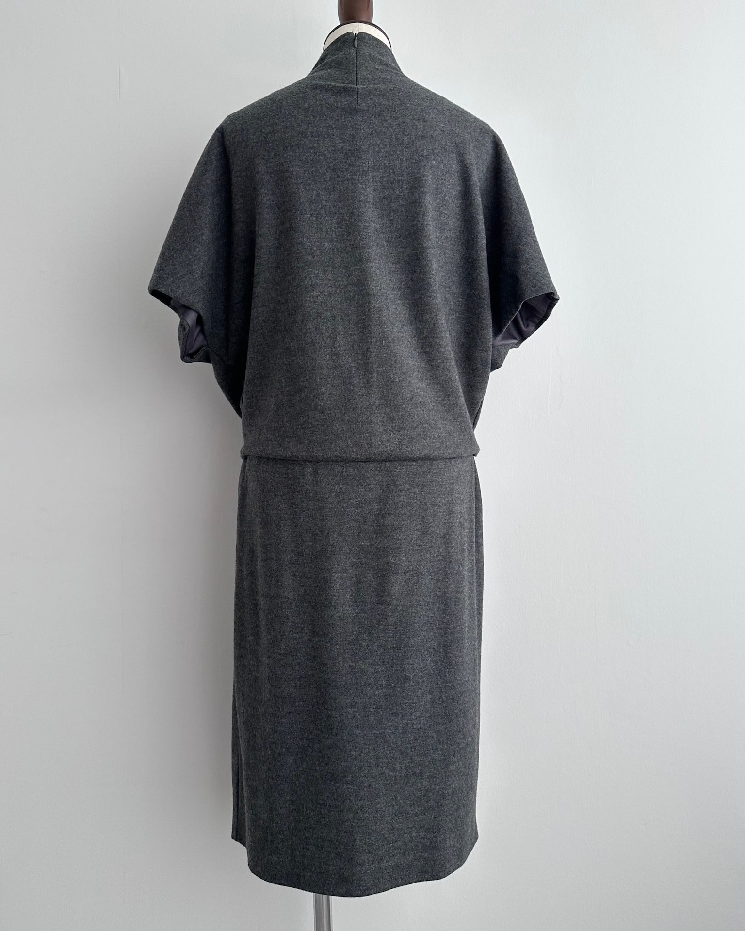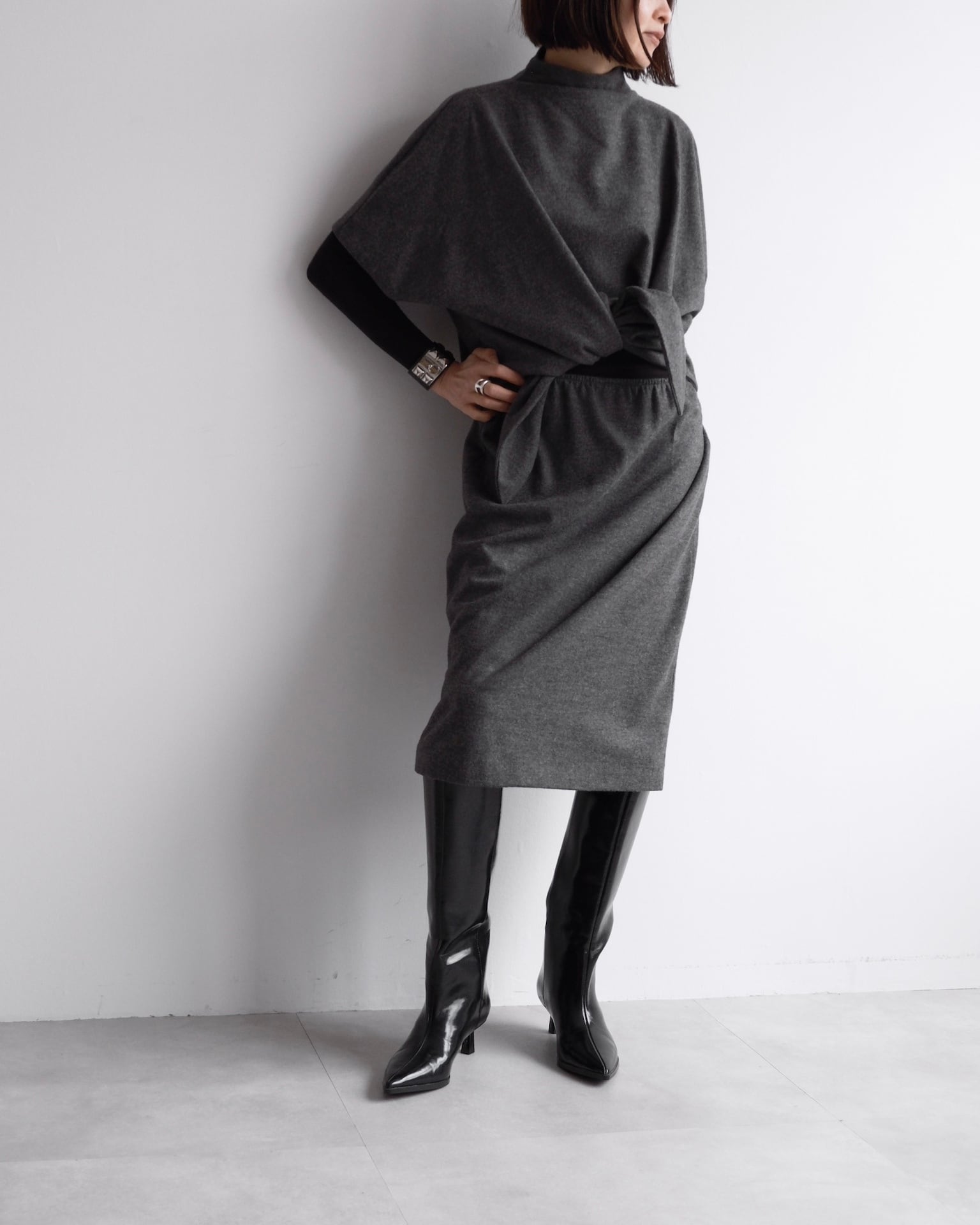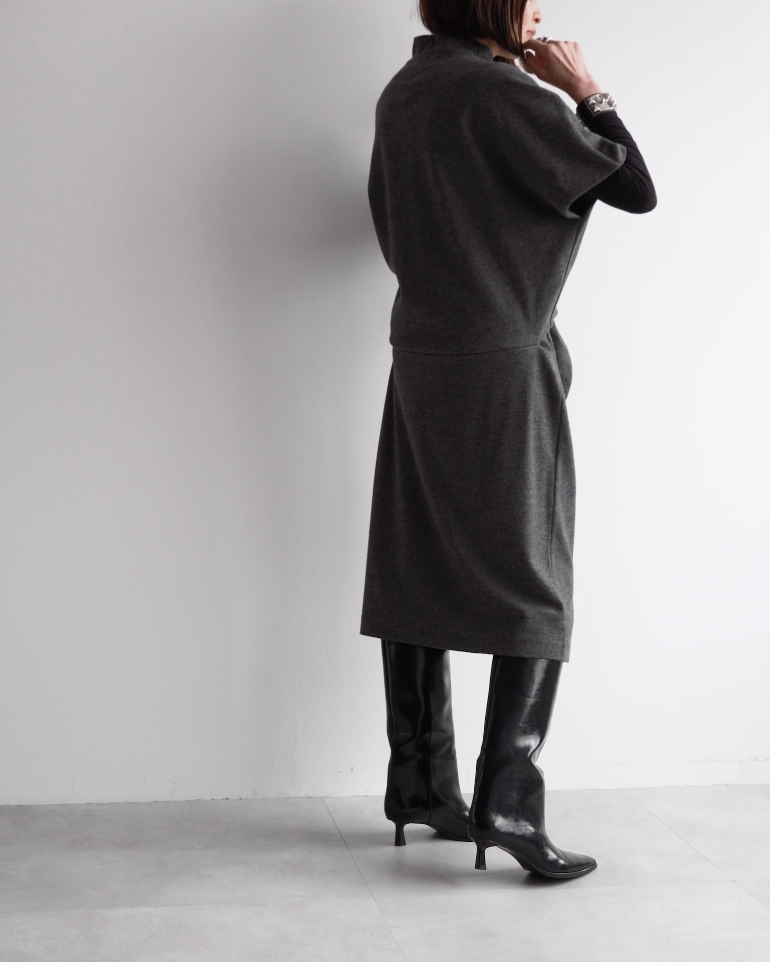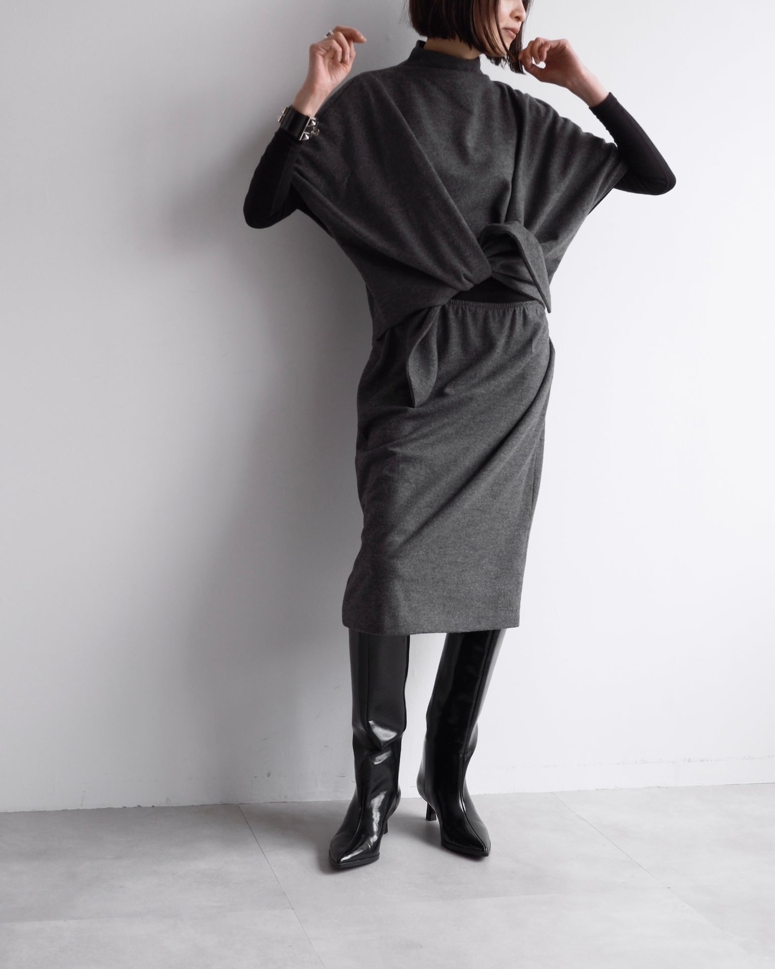 肩線を曖昧にするドルマンスリーブが、上半身に独特のフォルムを描きます。