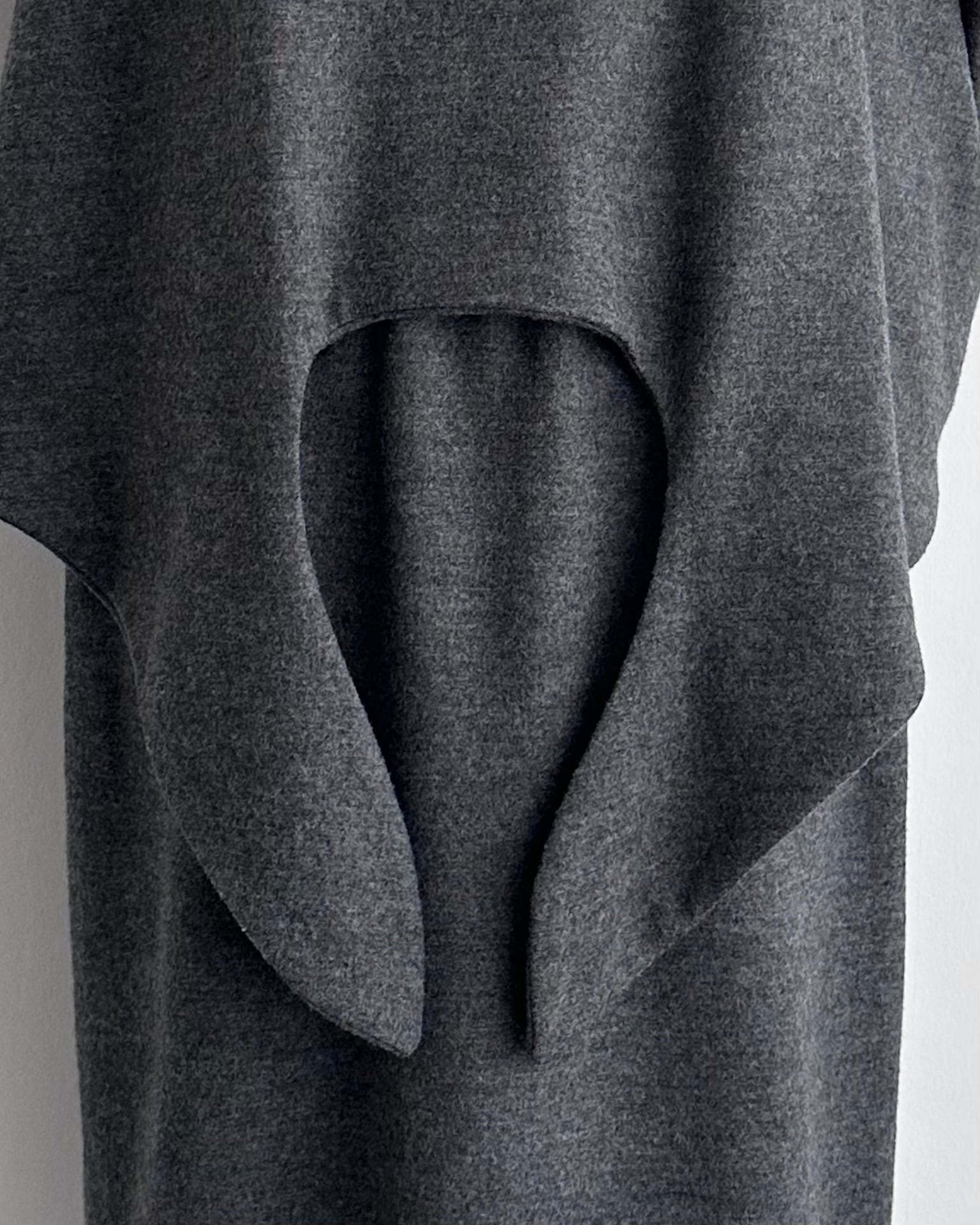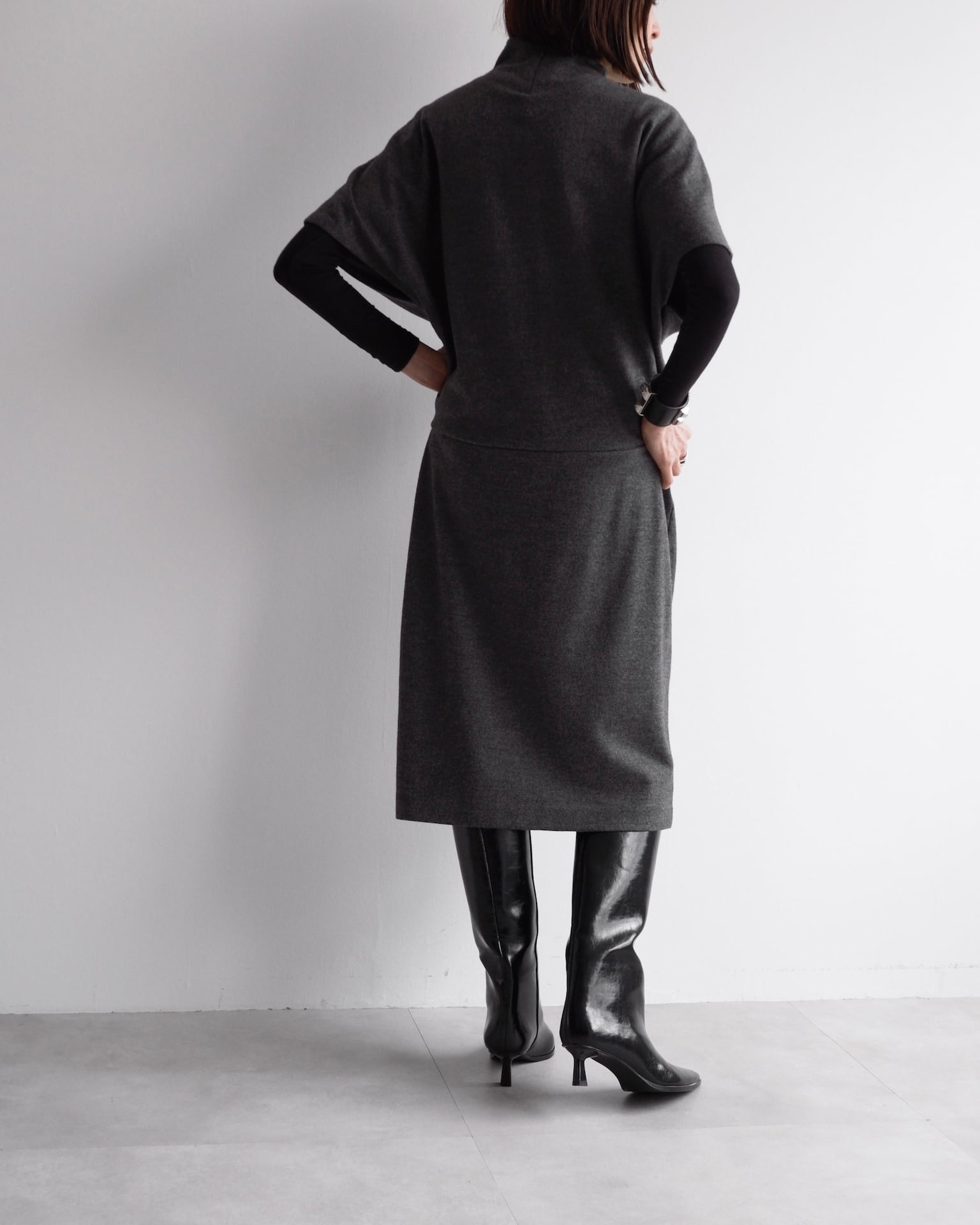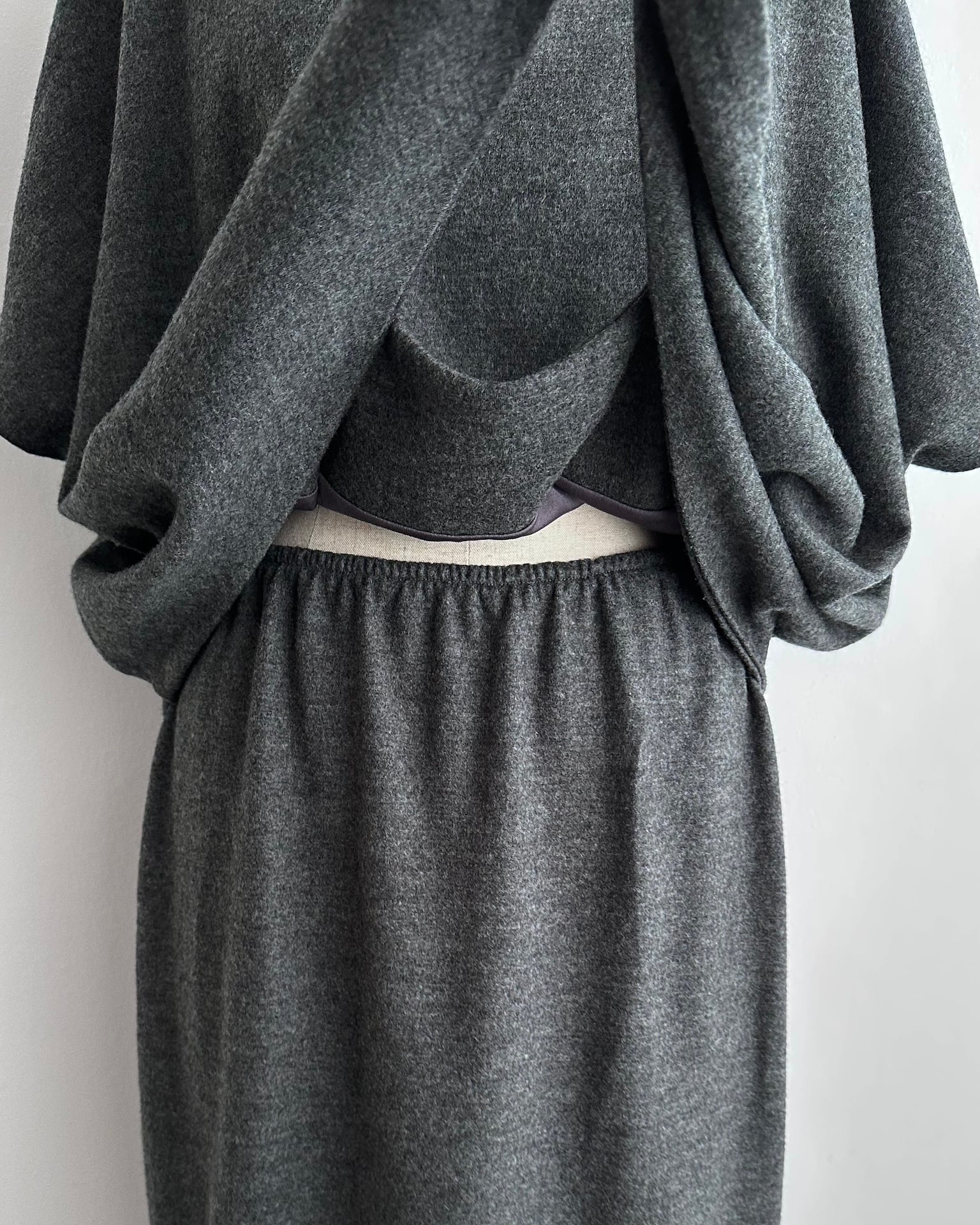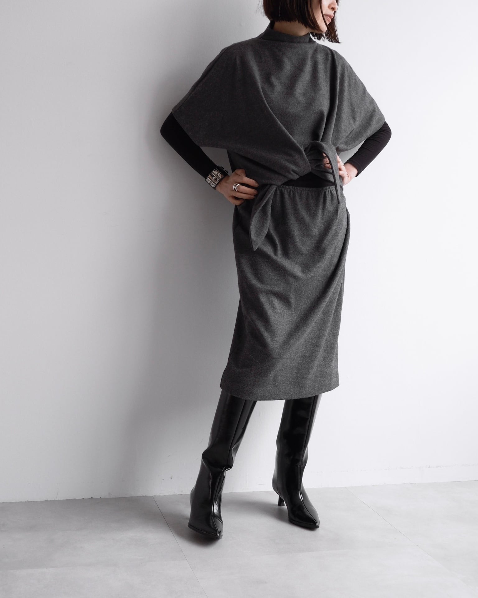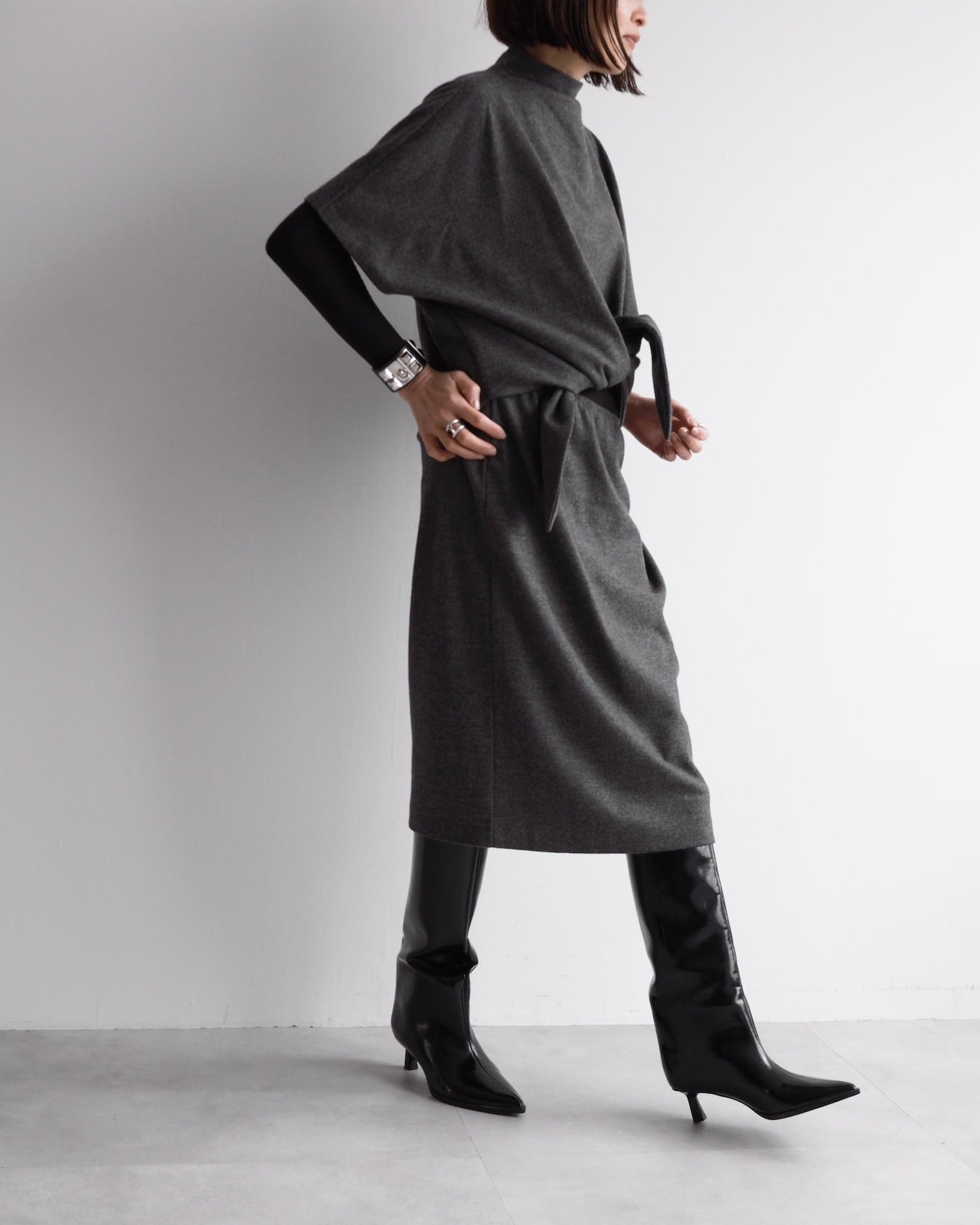 肩線を曖昧にするドルマンスリーブが、上半身に独特のフォルムを描きます。