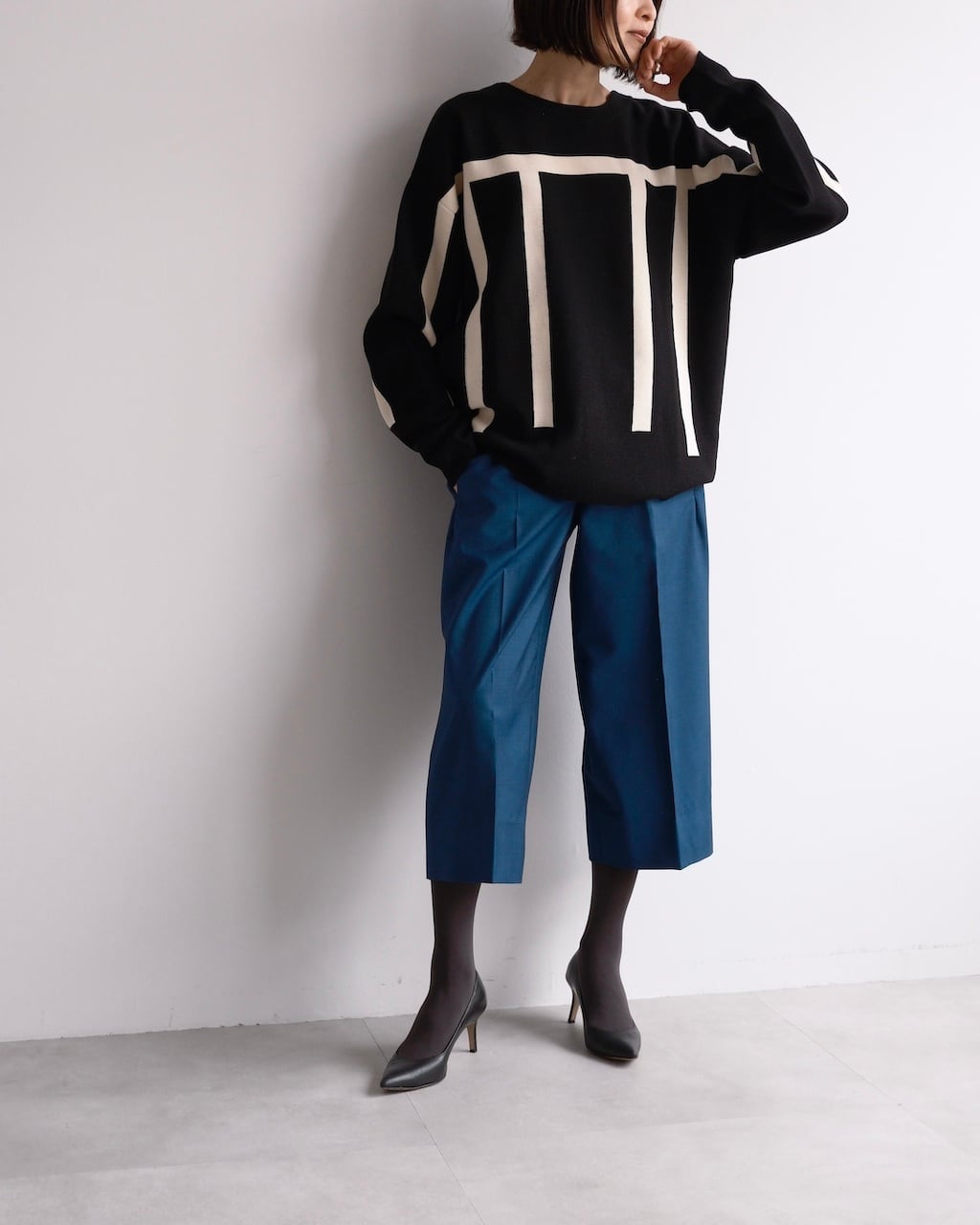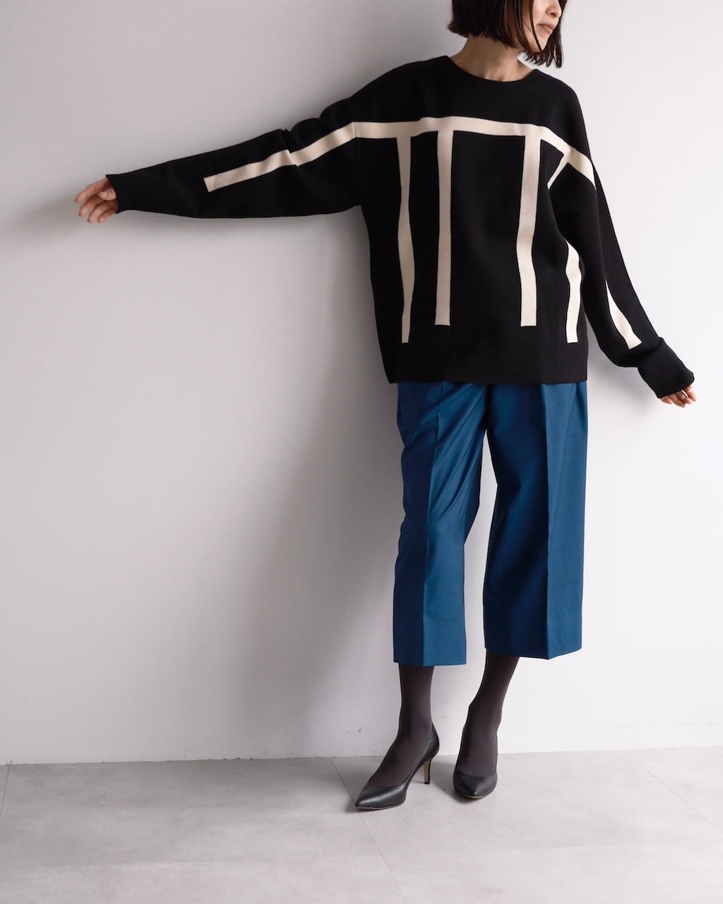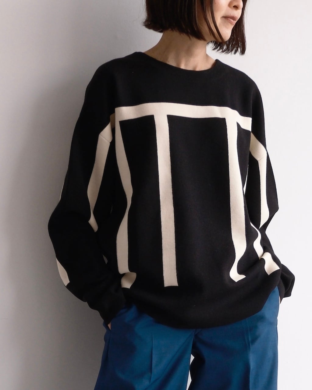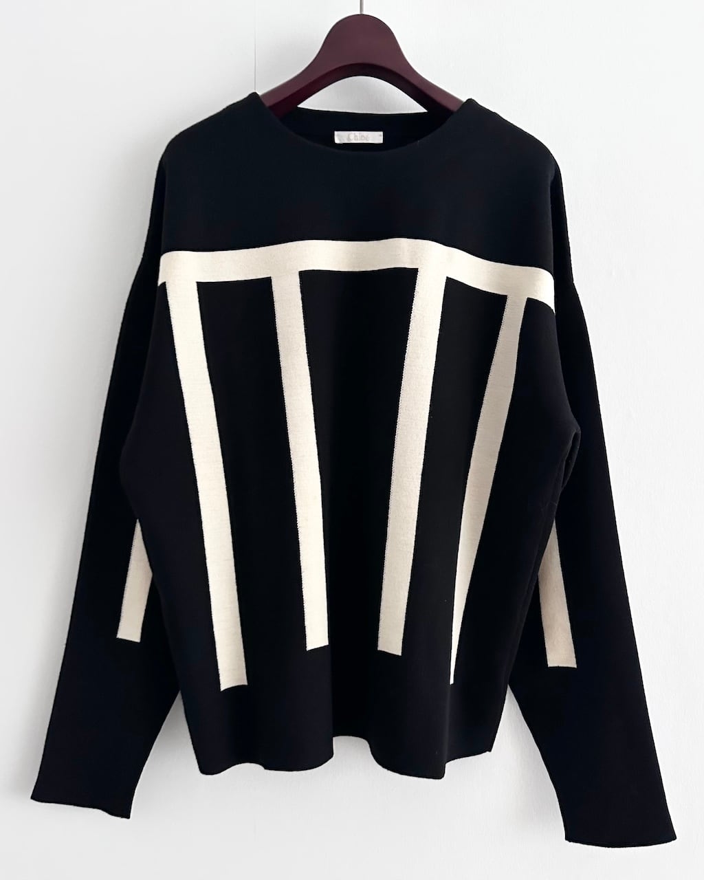 クリーンな配色とグラフィカルなラインが目を引き、1枚で決まるニットトップ。