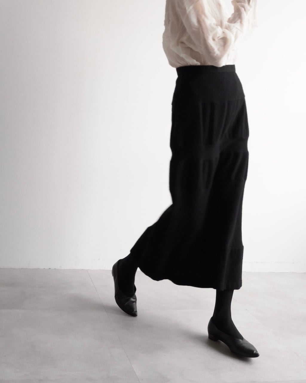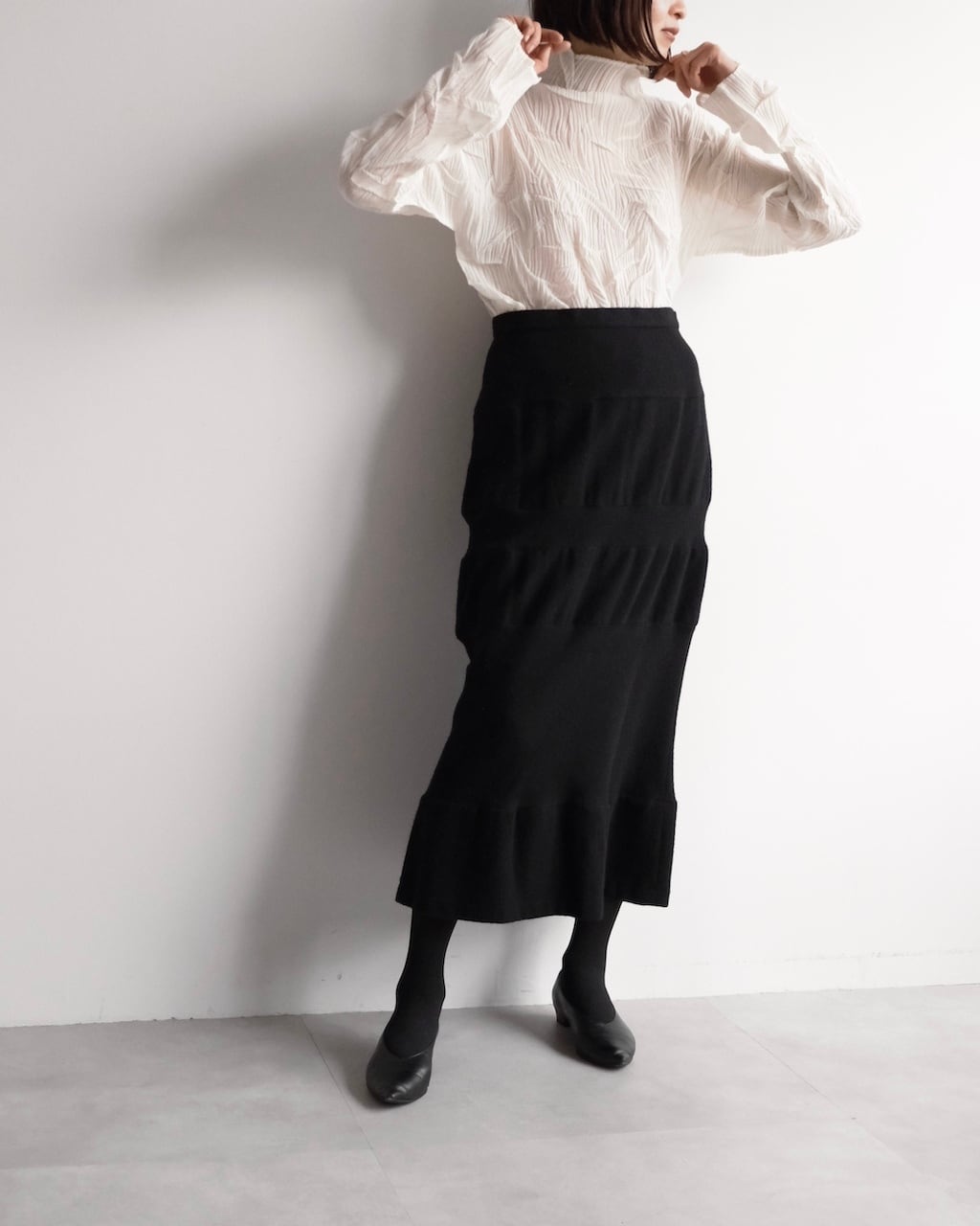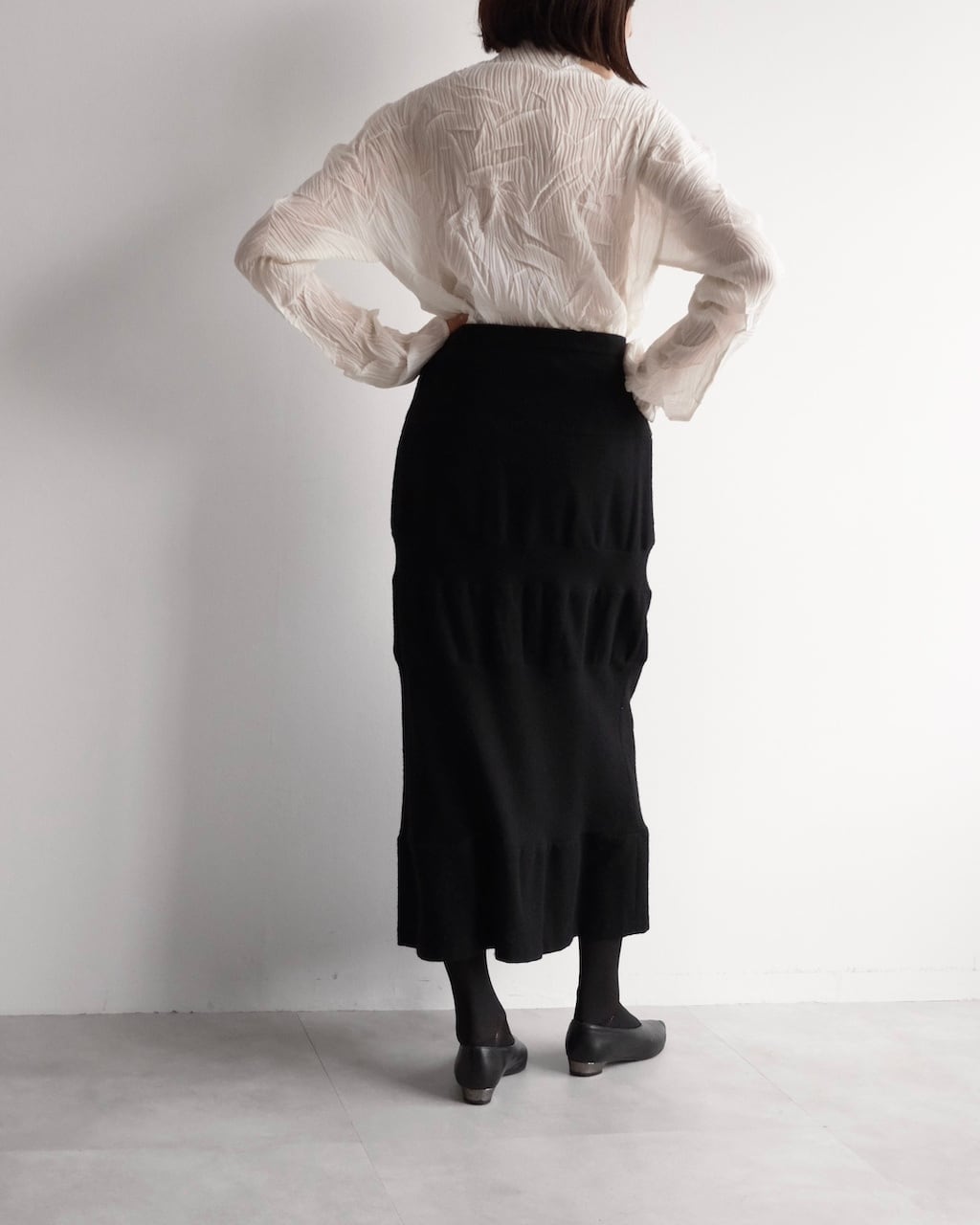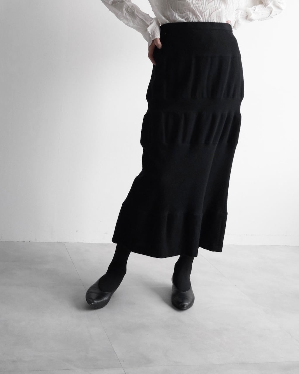 無駄を削ぎ落としたブラックで、装飾を用いず構造そのものが魅力のスカート。