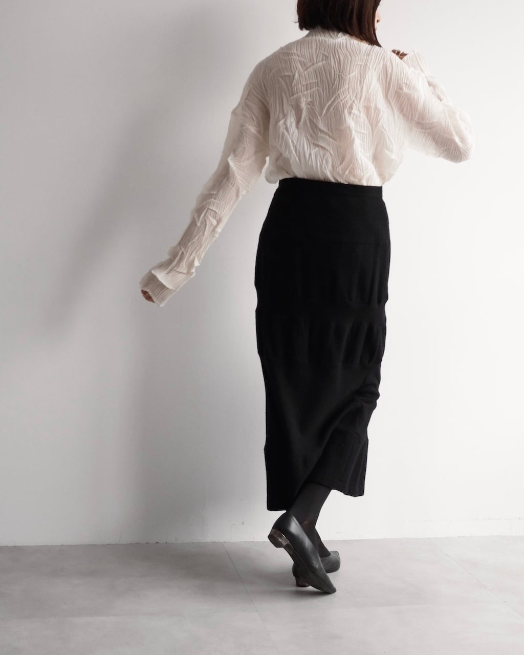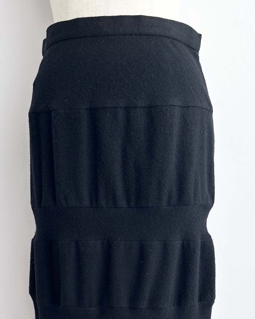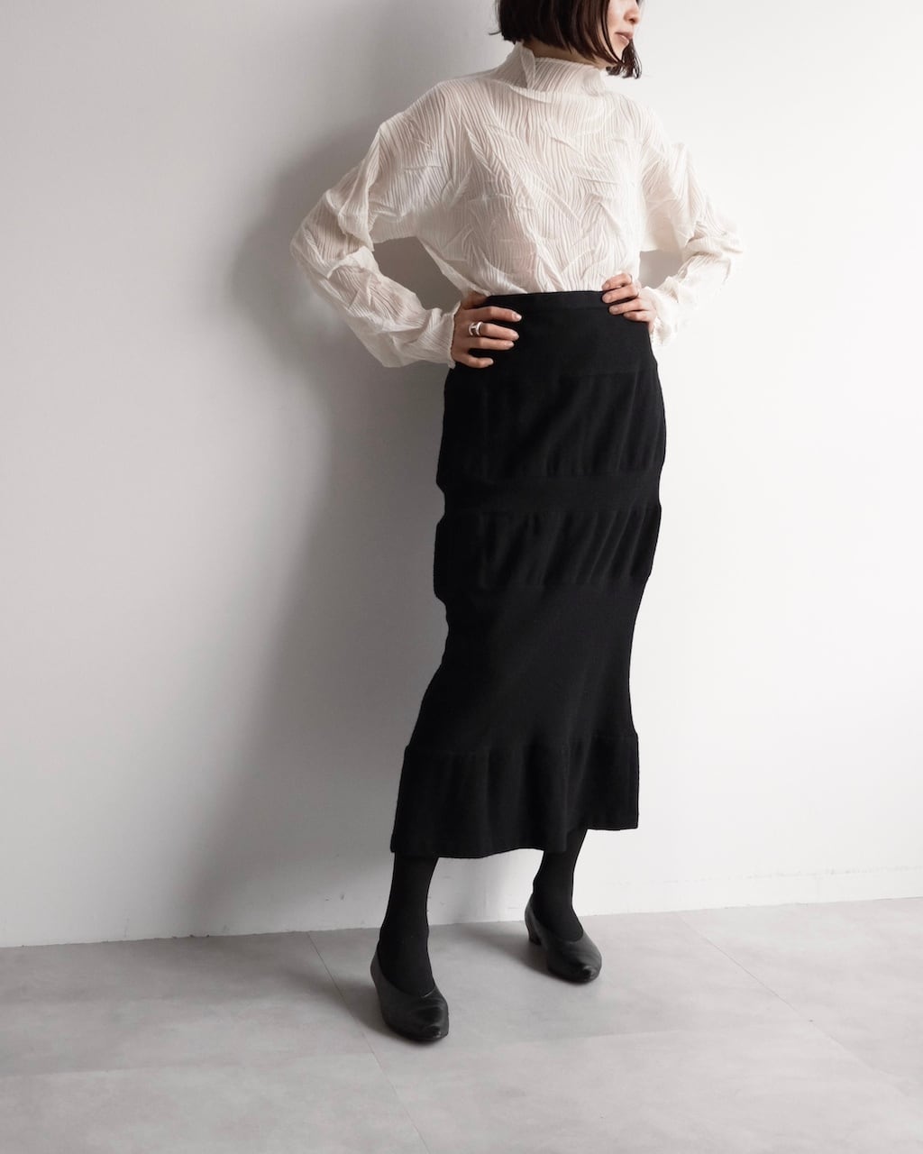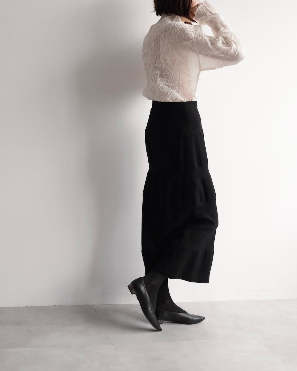 無駄を削ぎ落としたブラックで、装飾を用いず構造そのものが魅力のスカート。