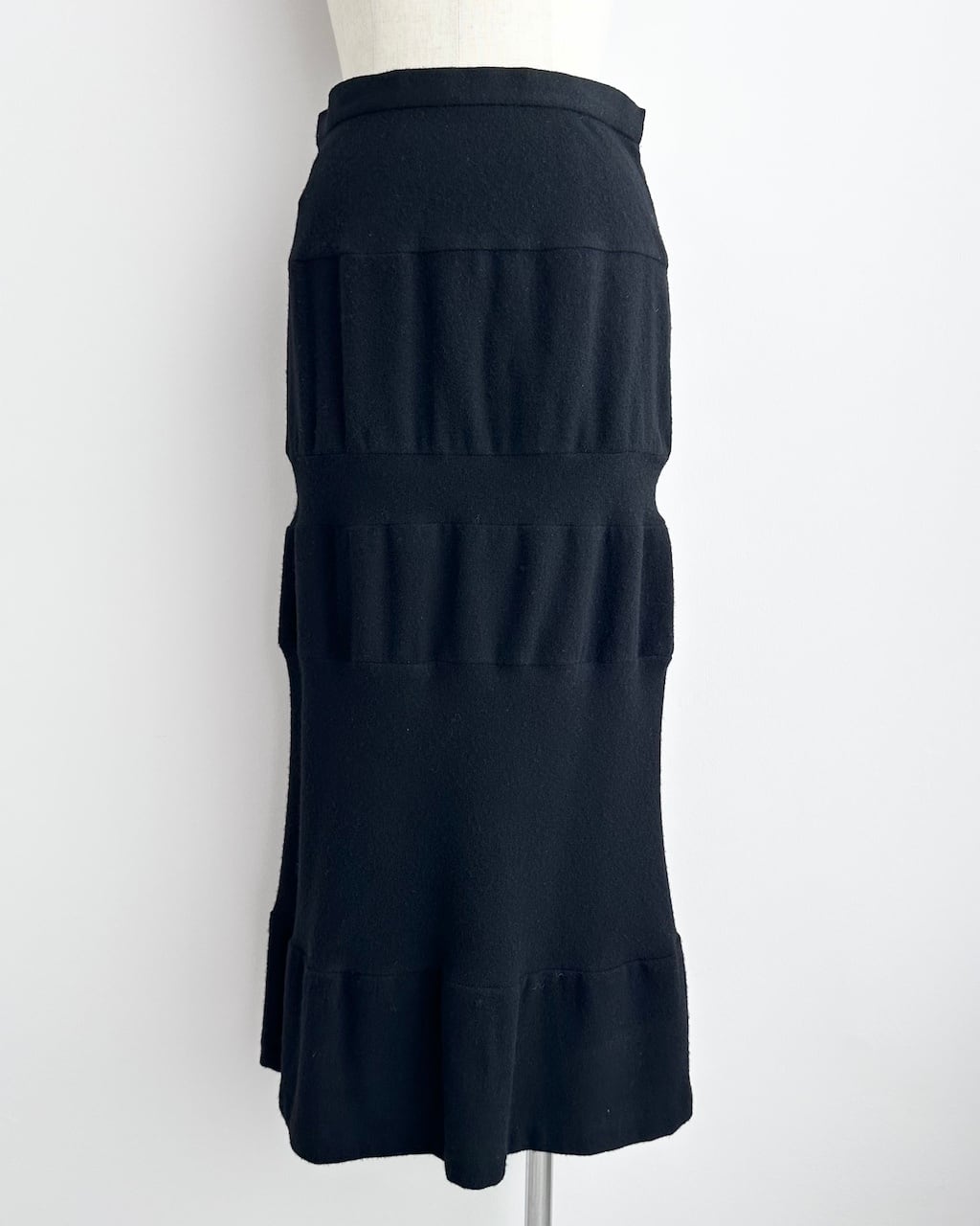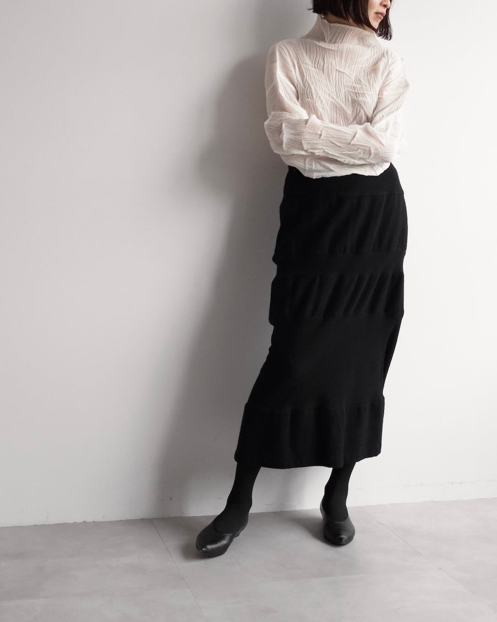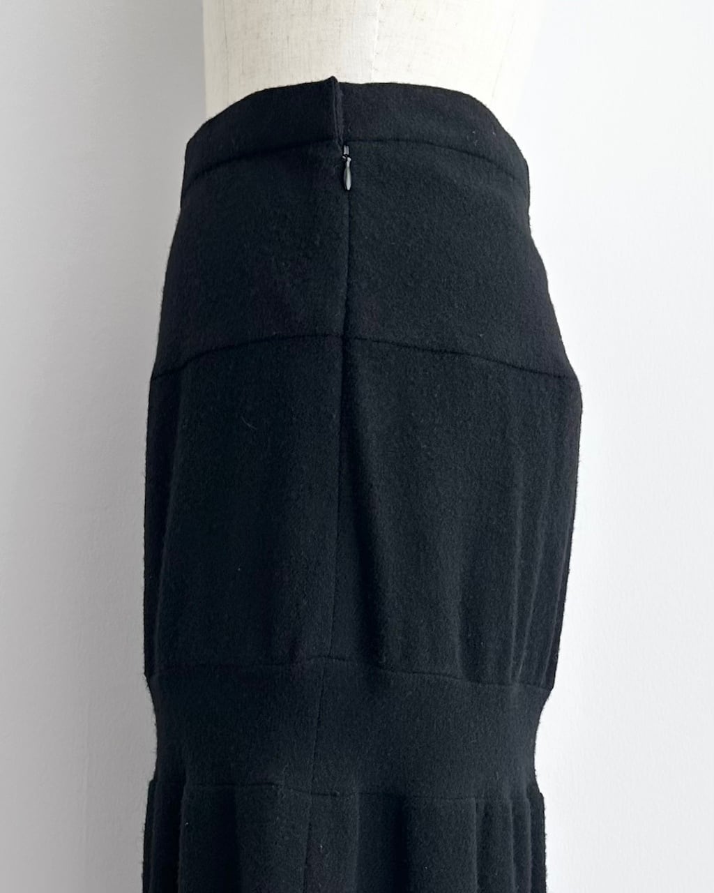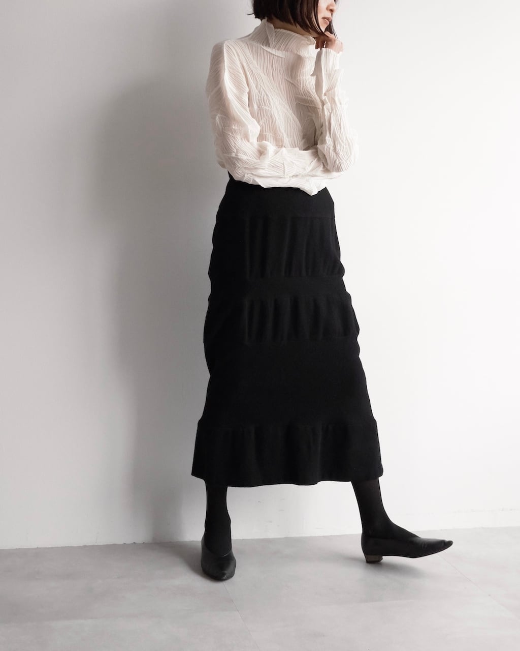 無駄を削ぎ落としたブラックで、装飾を用いず構造そのものが魅力のスカート。