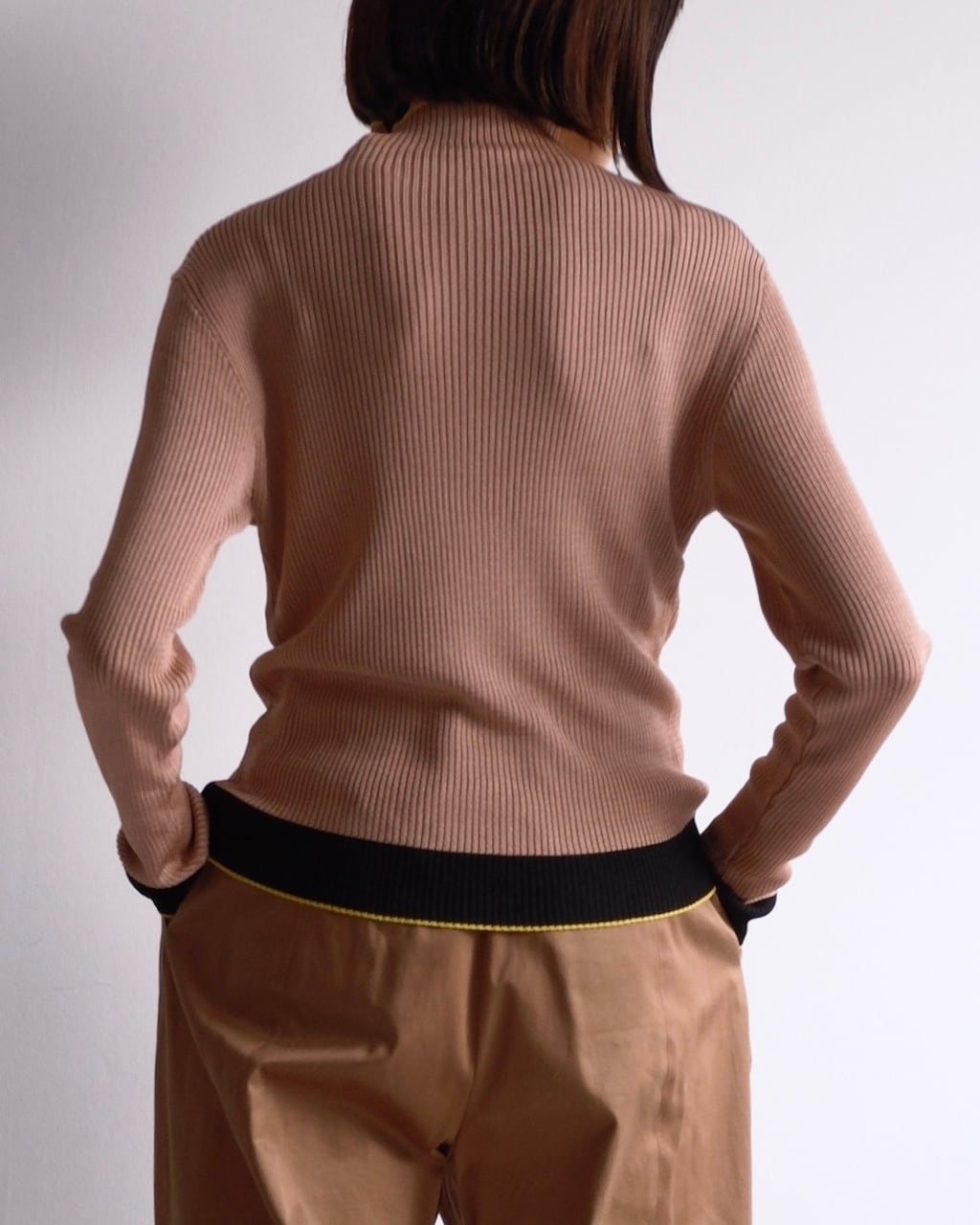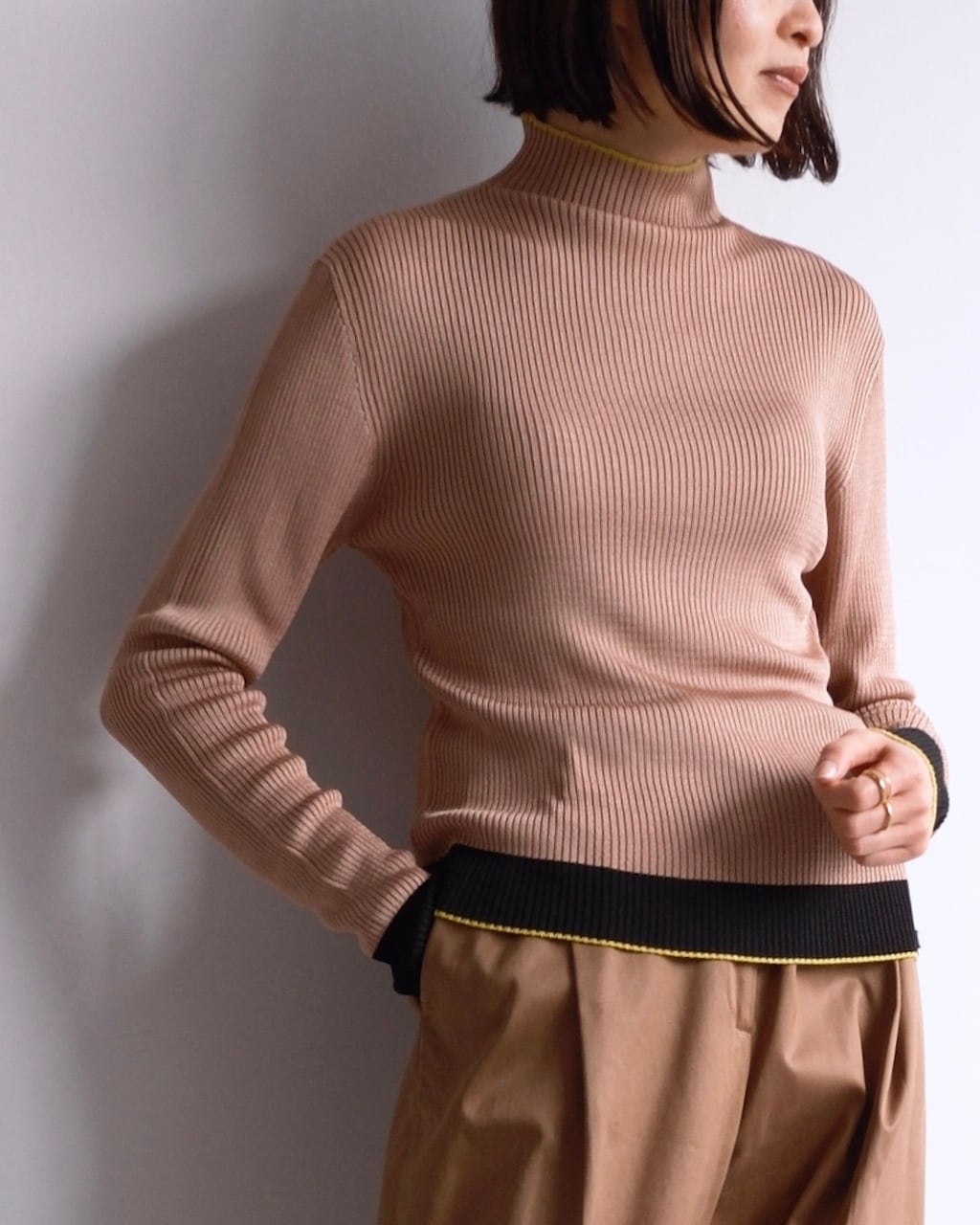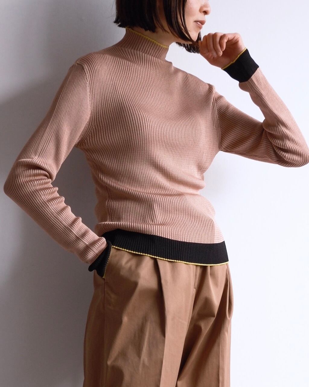 細やかな縦リブで編み立てられたボディは、体に沿いながらも締め付けすぎない絶妙なフィット感。