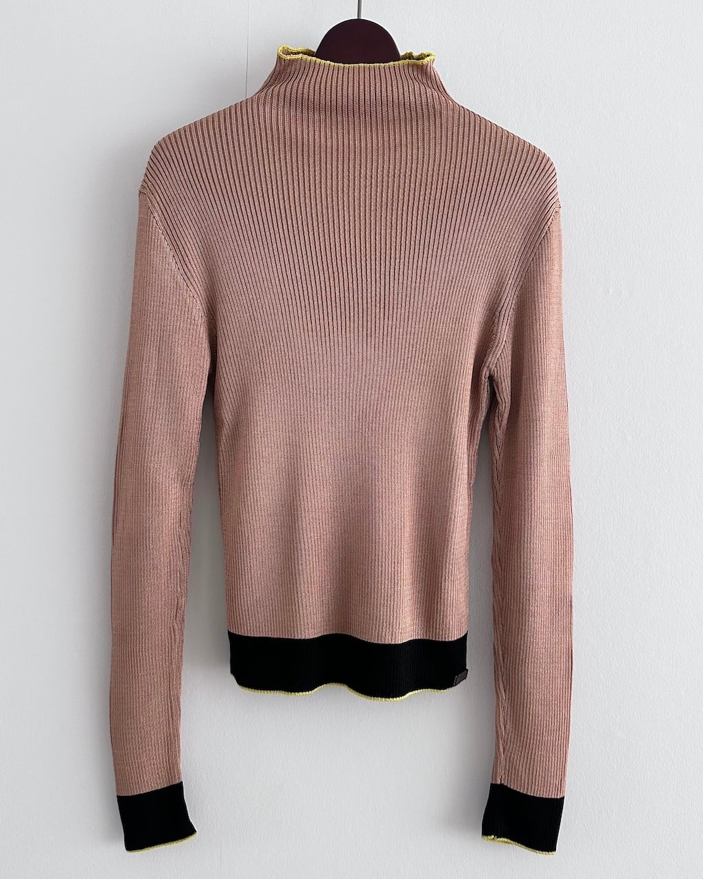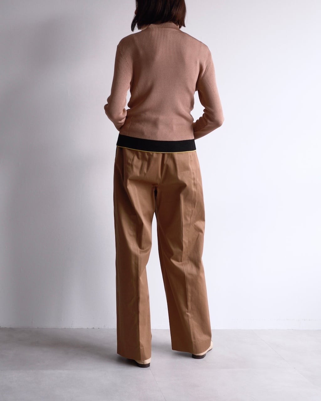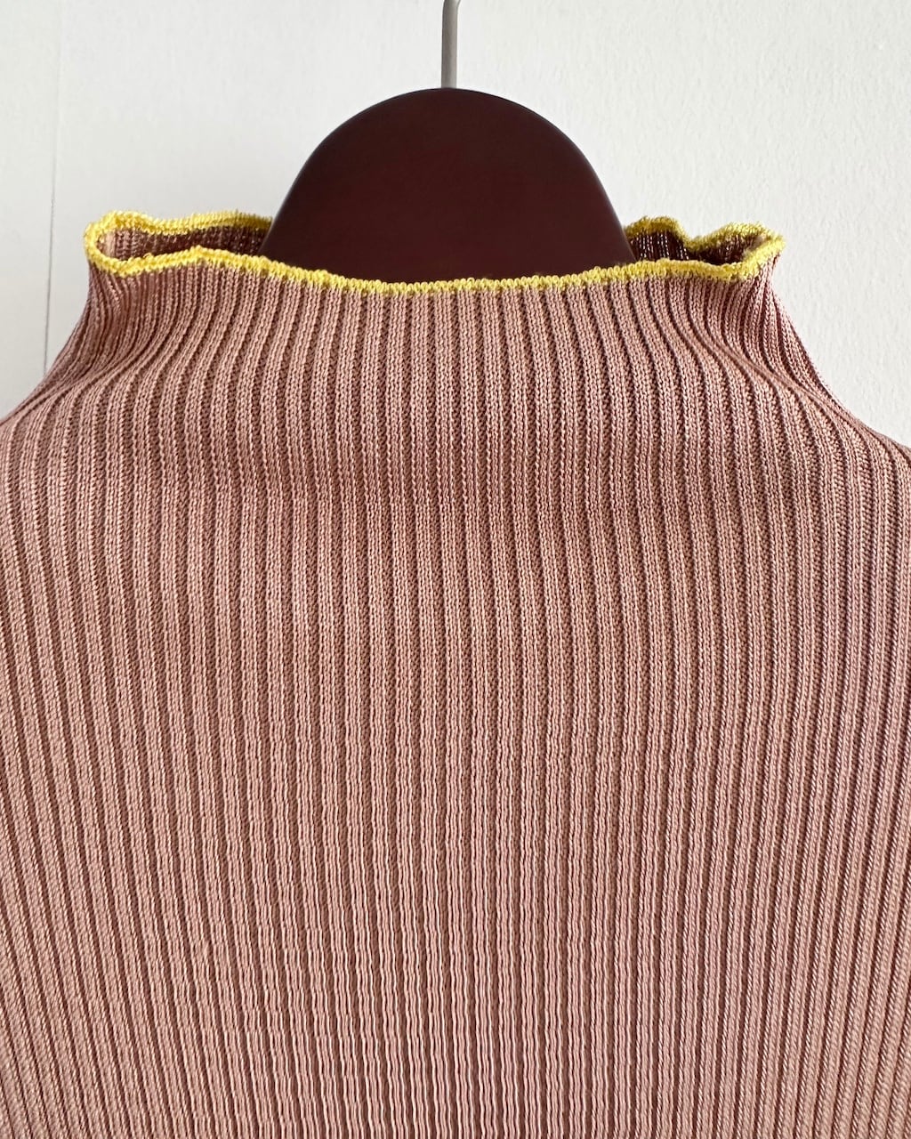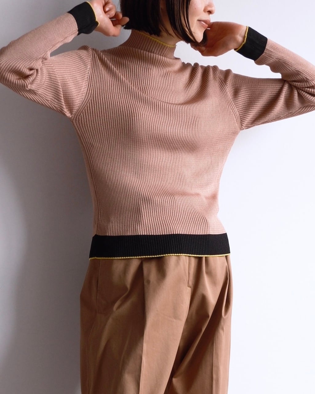 細やかな縦リブで編み立てられたボディは、体に沿いながらも締め付けすぎない絶妙なフィット感。