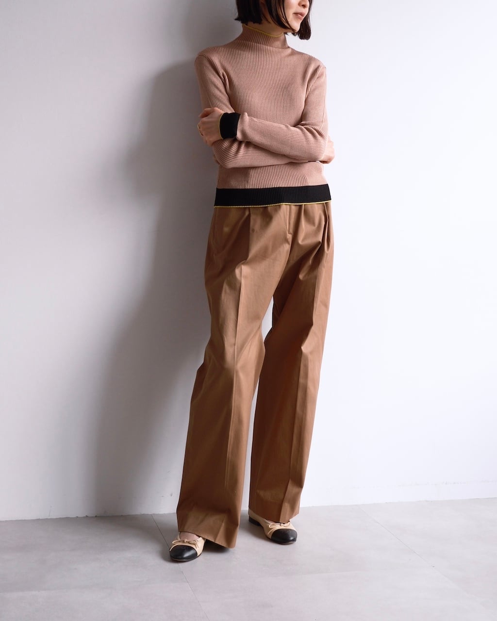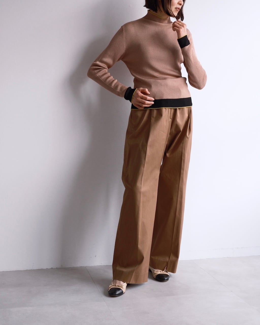 スモーキーなピンクベージュをベースに、袖口、裾にはブラックの切り替え。