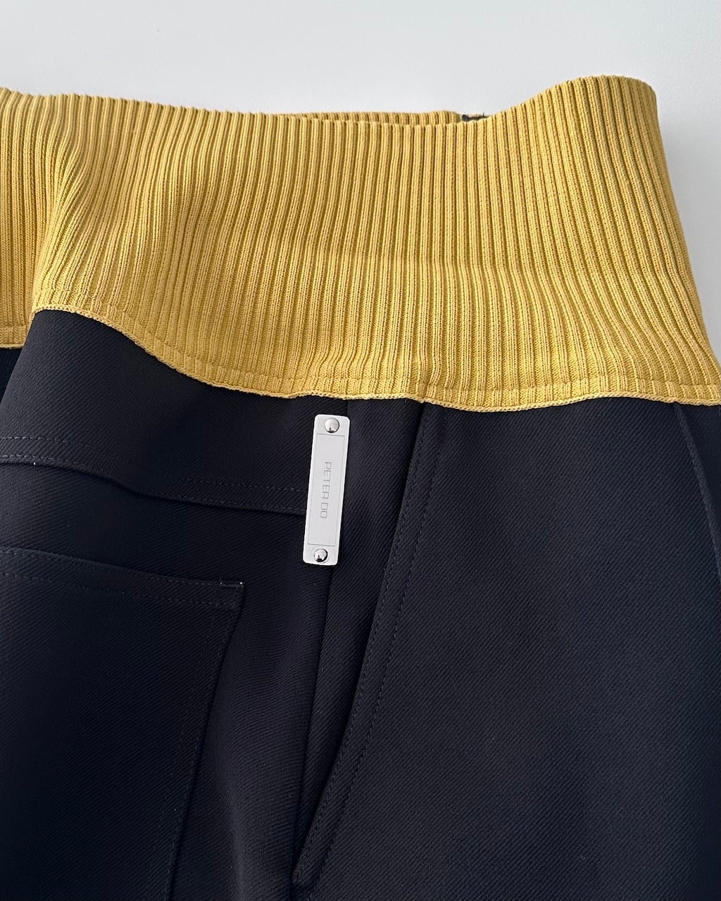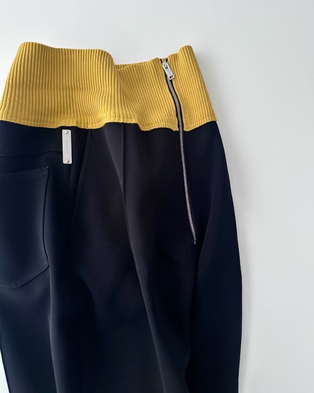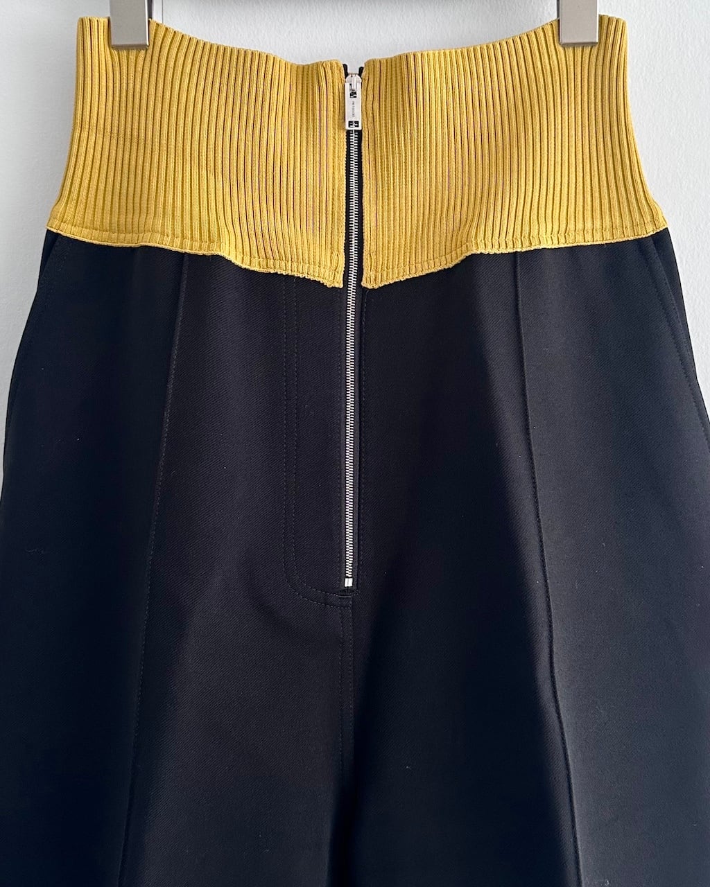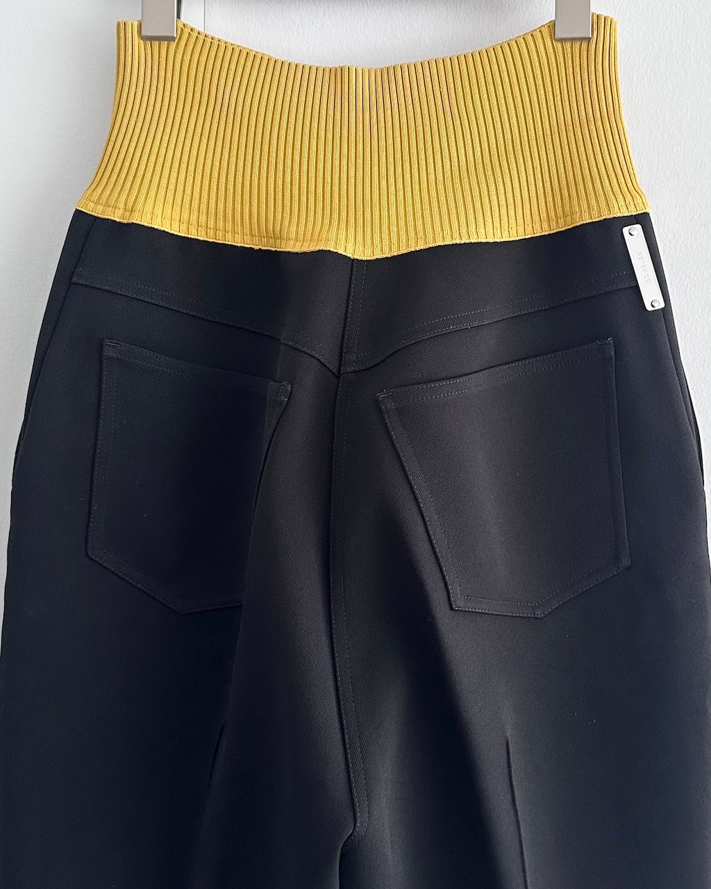 深く設定されたウエストに、イエローのリブニットを大胆に切り替えた印象的なデザイン。