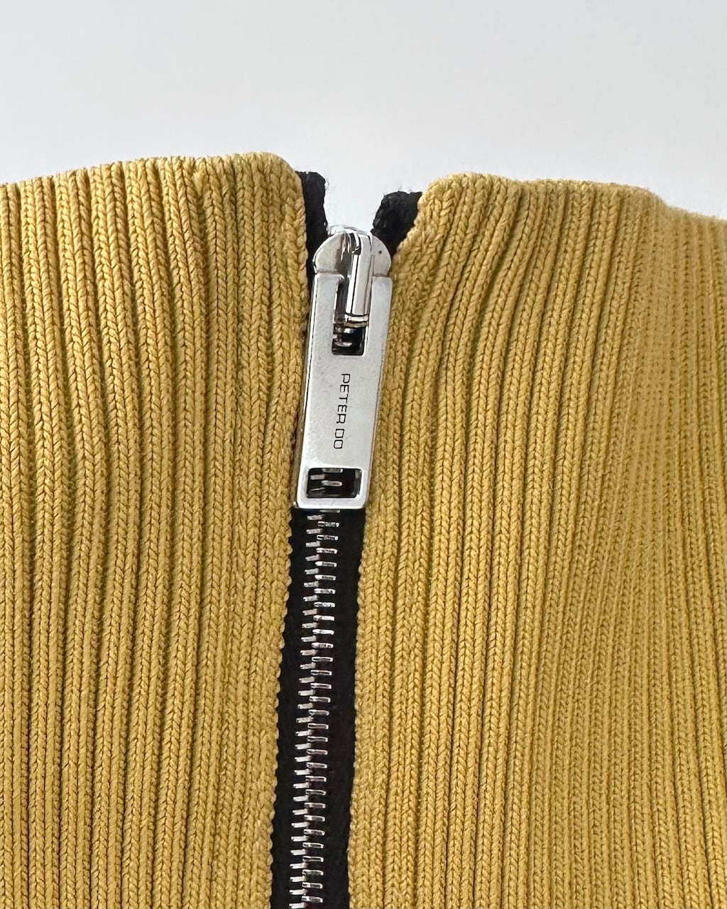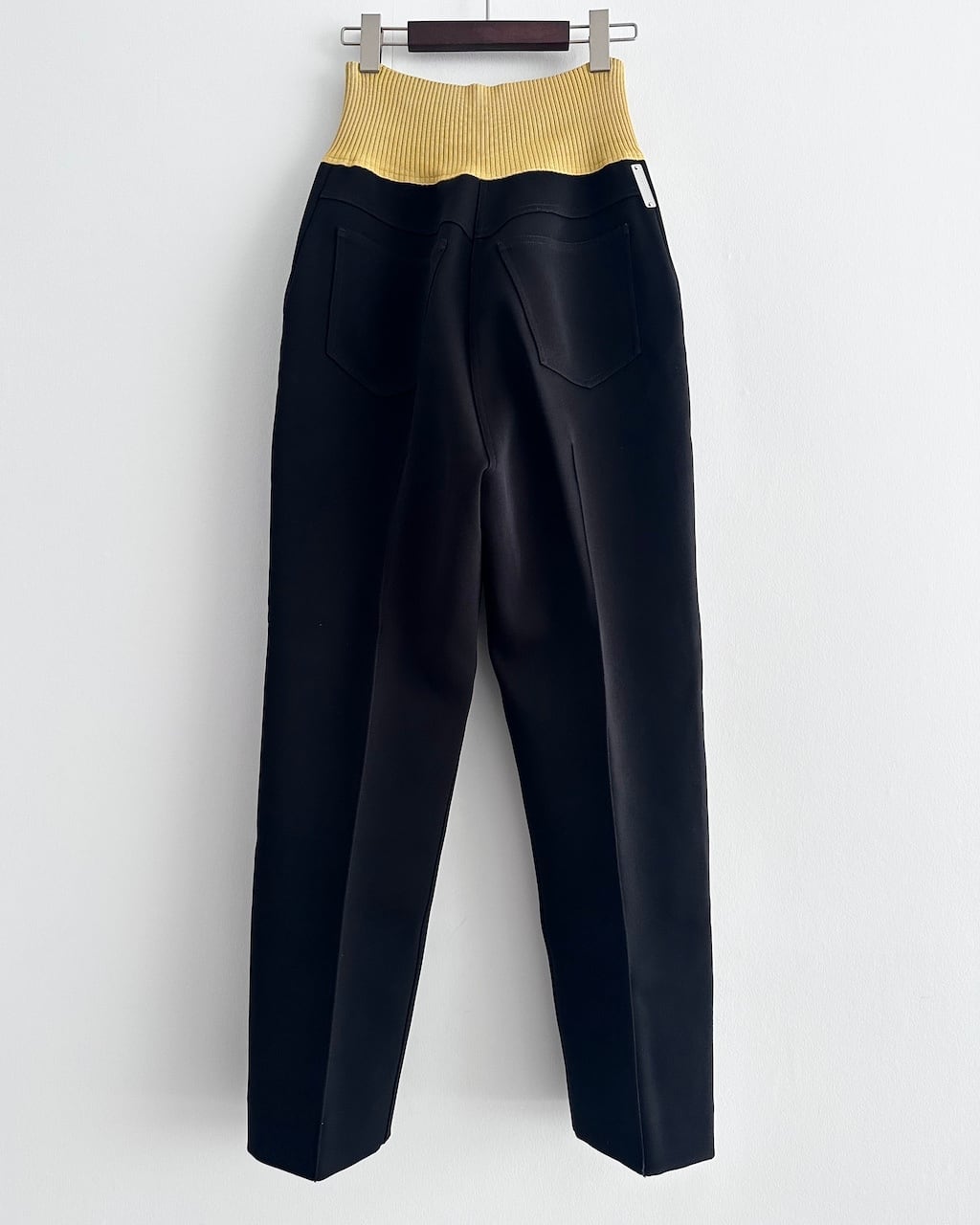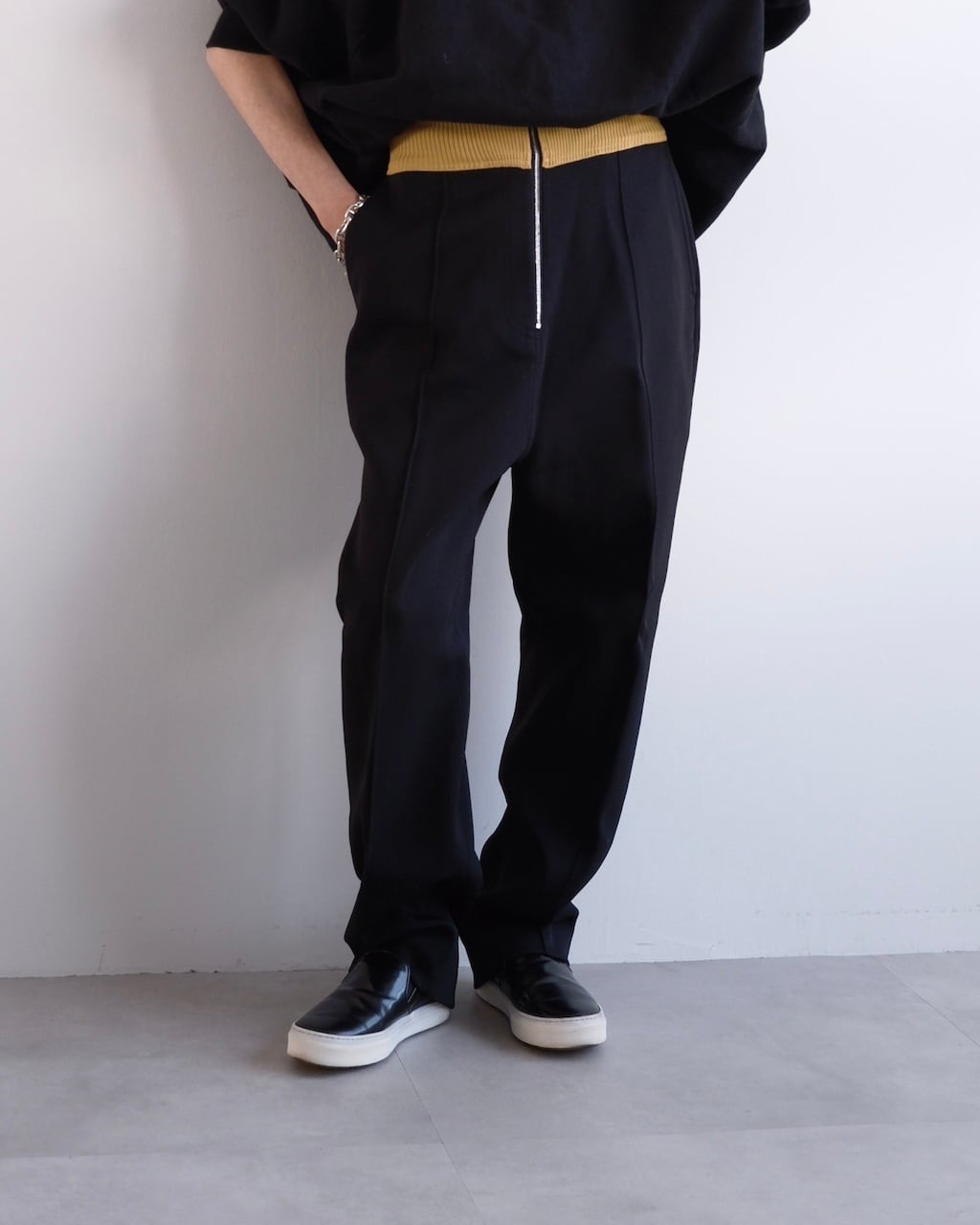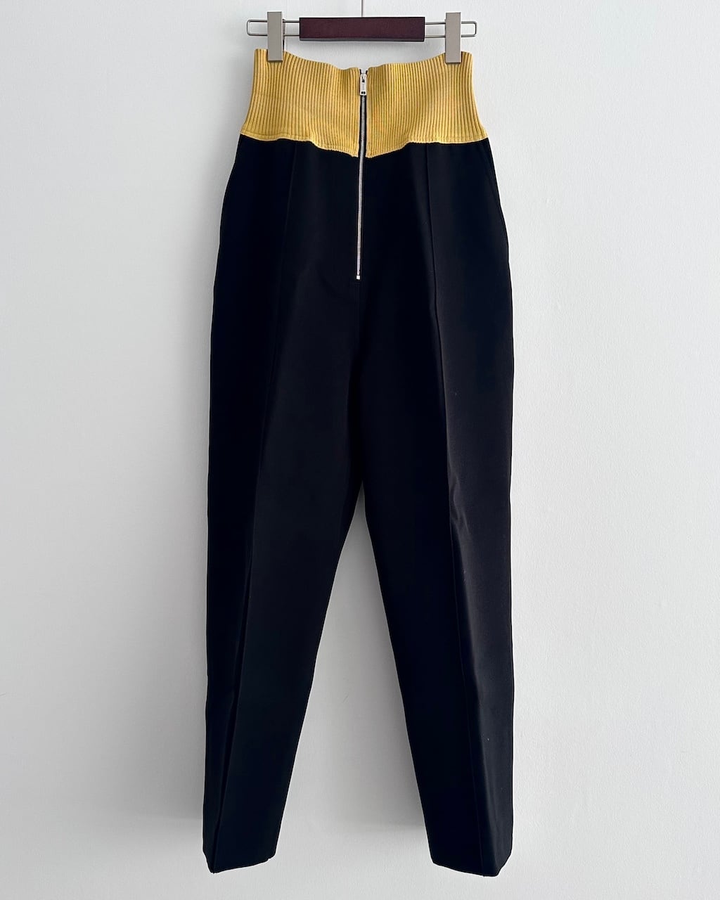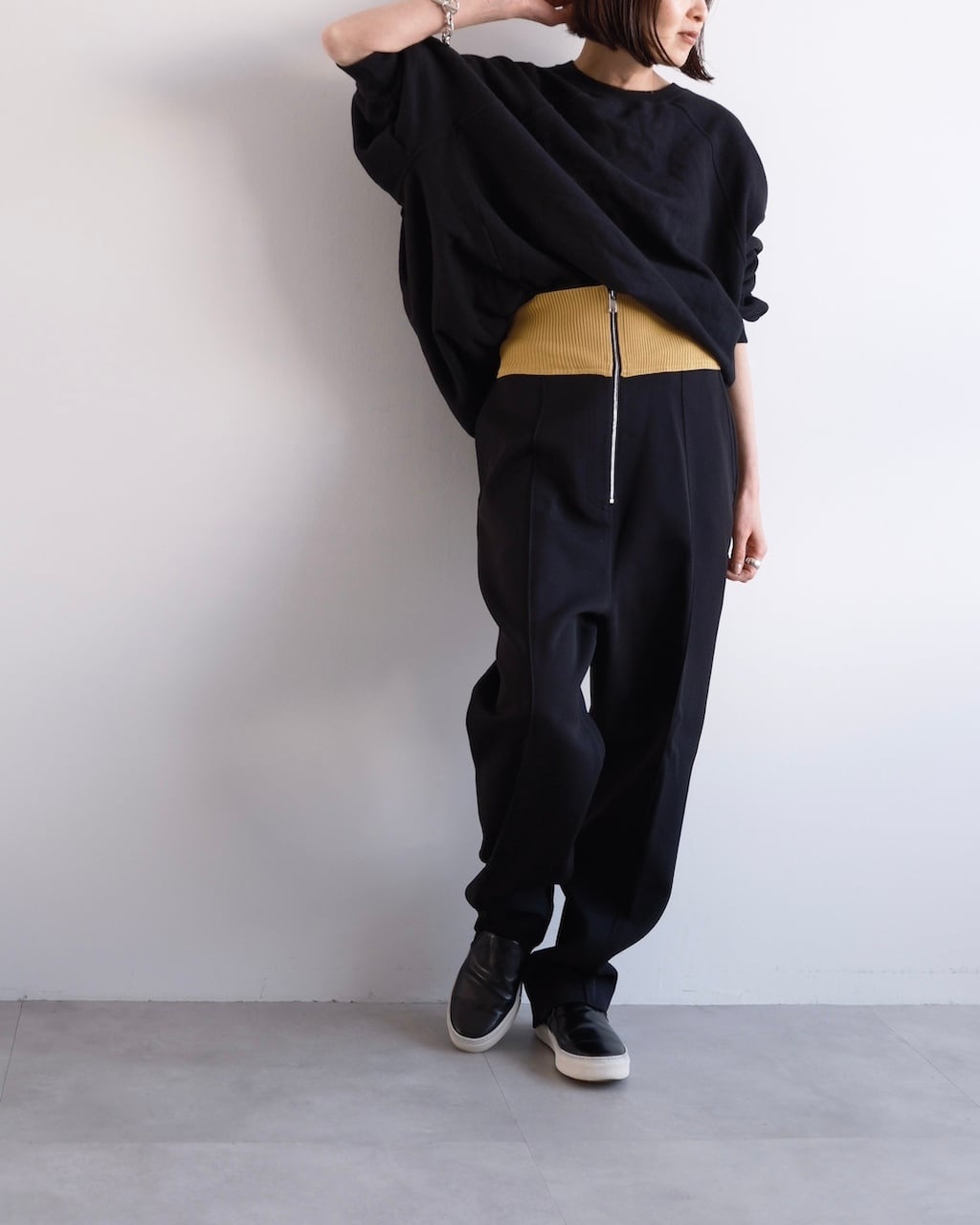 深く設定されたウエストに、イエローのリブニットを大胆に切り替えた印象的なデザイン。