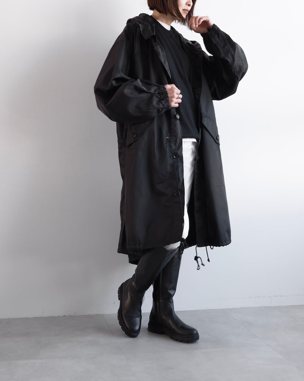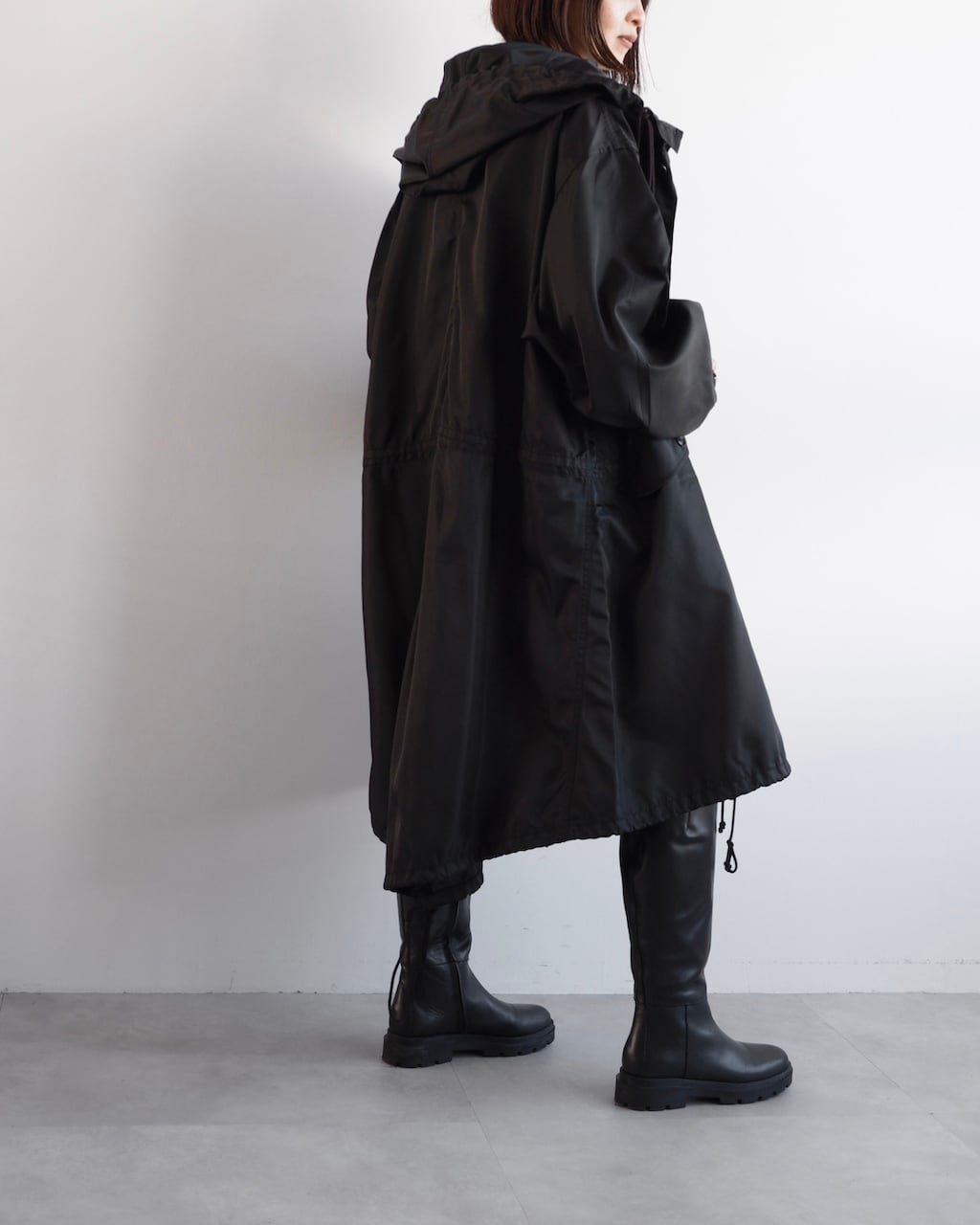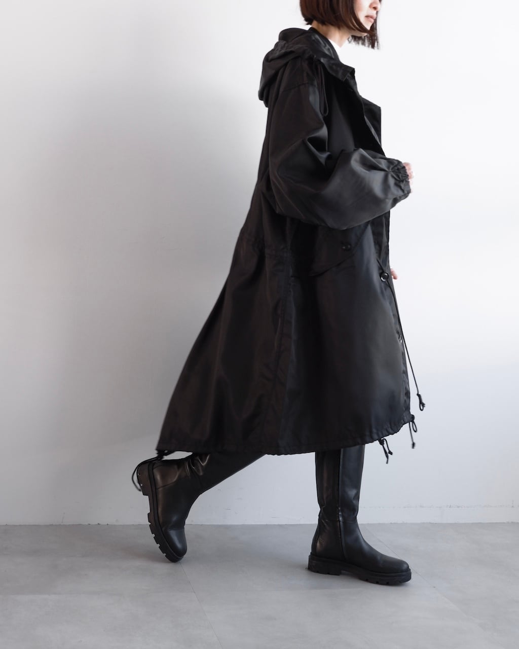 ウエスト、裾にはそれぞれドローコードを配し、シルエットの変化を楽しめるデザイン。