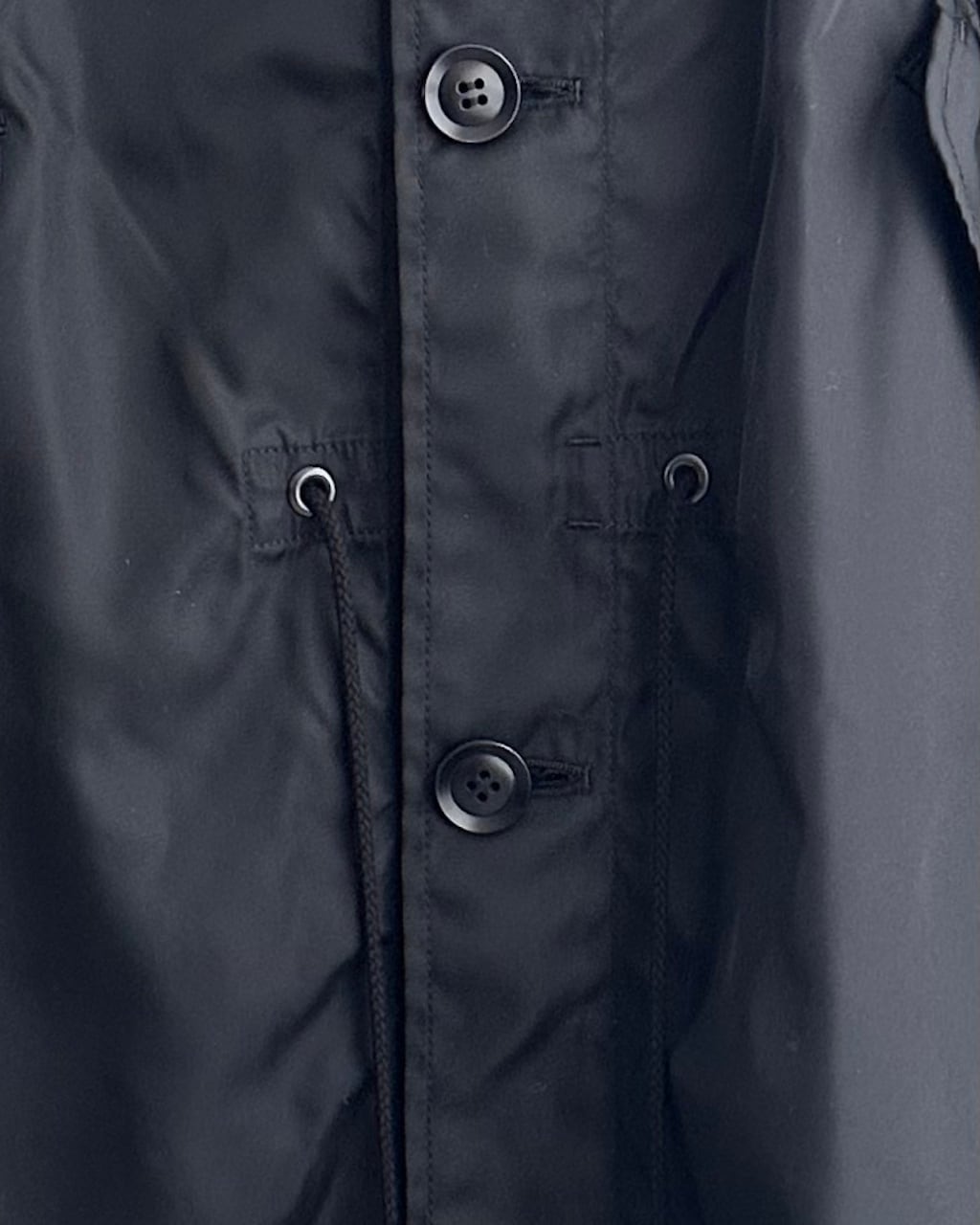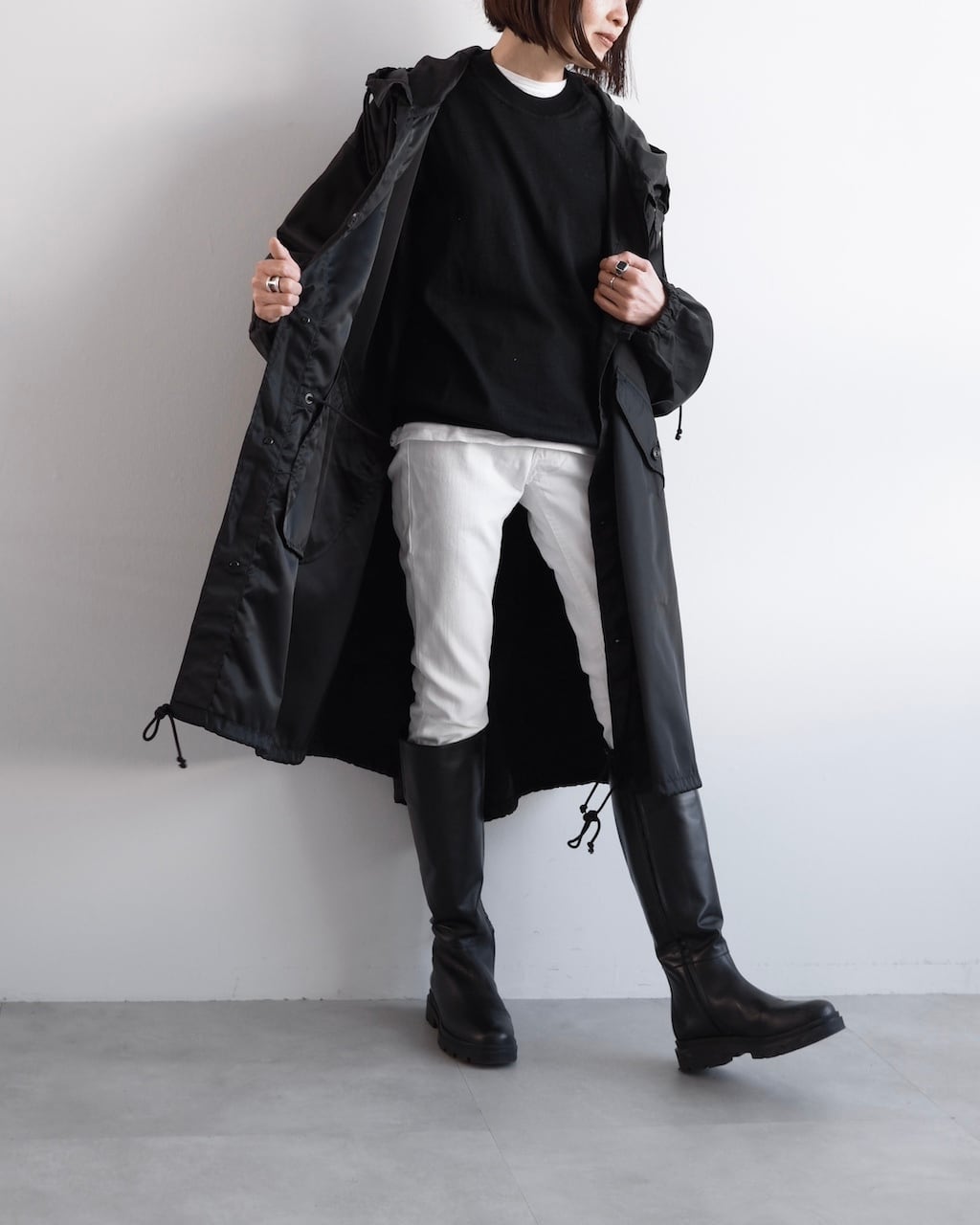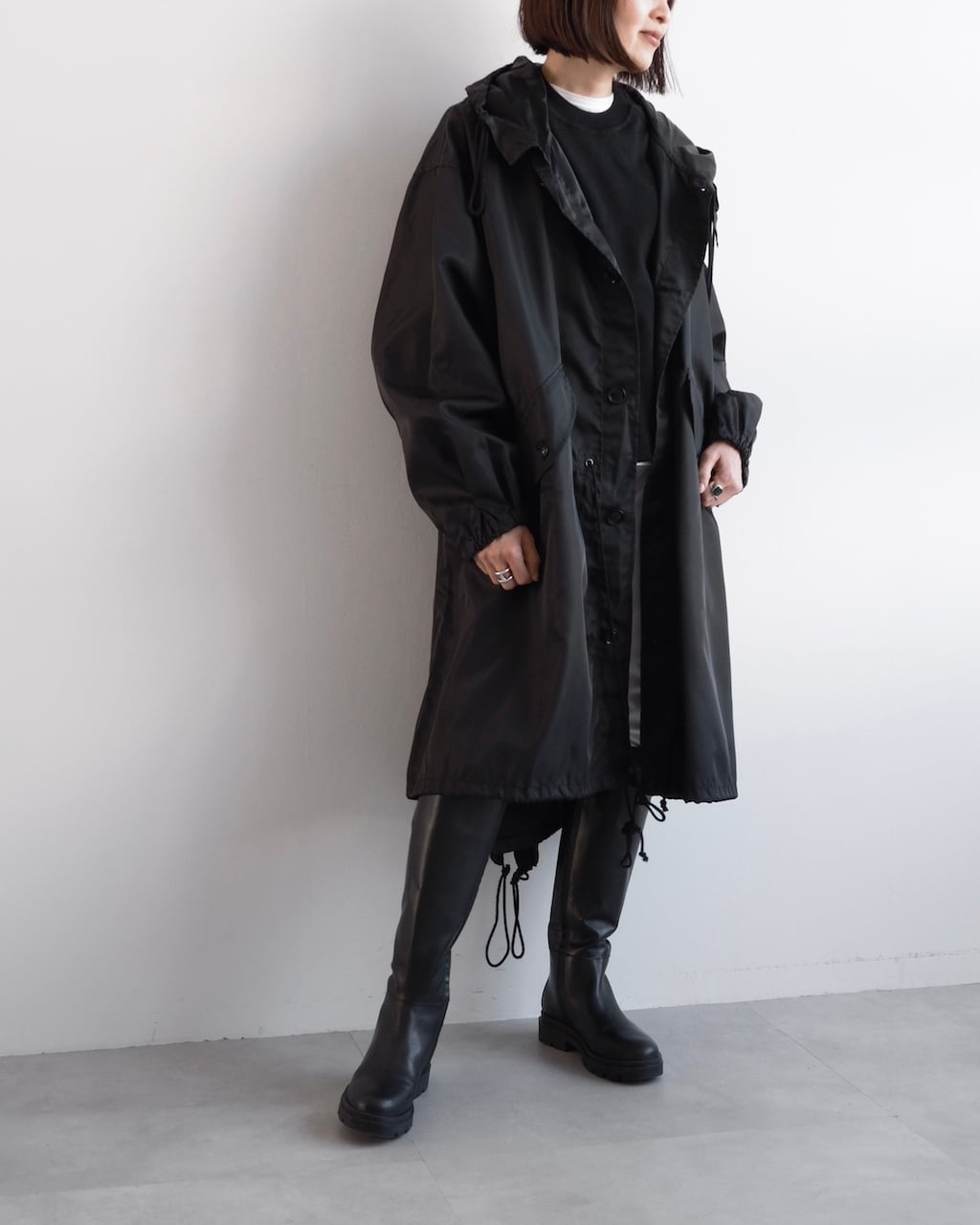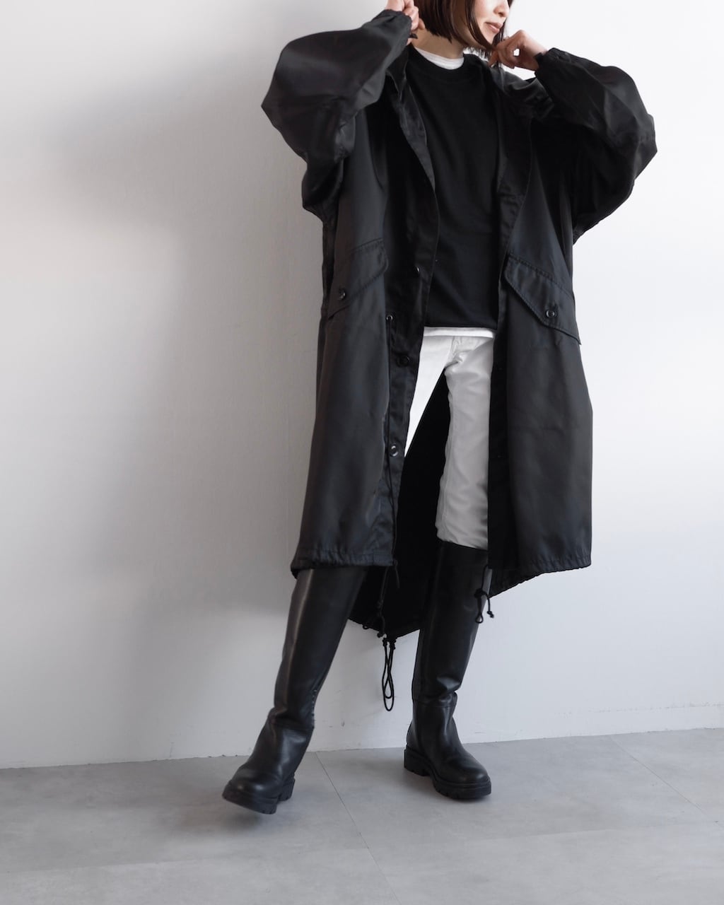ウエスト、裾にはそれぞれドローコードを配し、シルエットの変化を楽しめるデザイン。