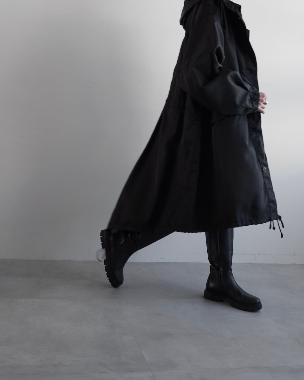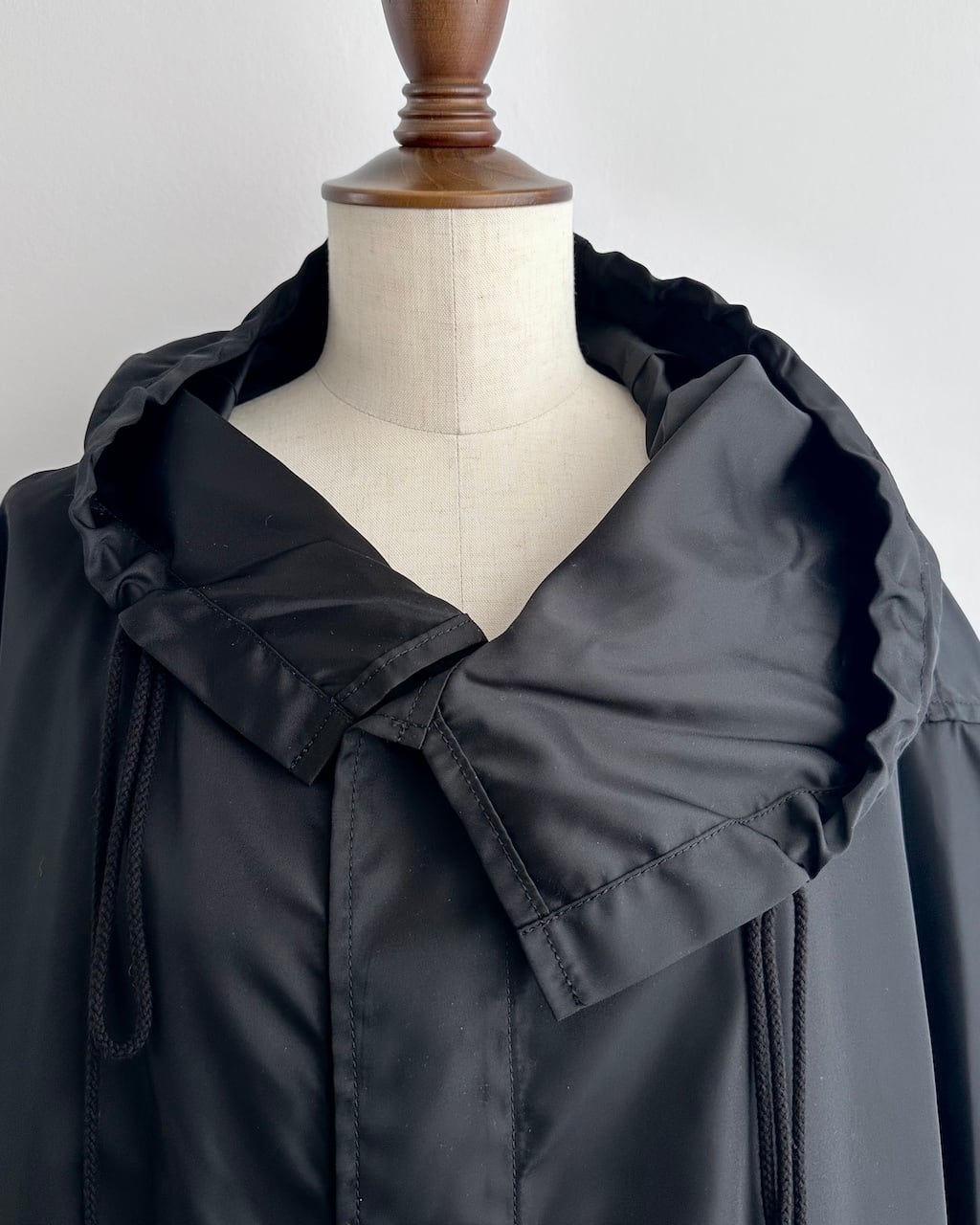 フードへと続く立体的な襟は、前を開けた時にも自然なドレープが生まれ、顔まわりにさりげないニュアンスを添えます。