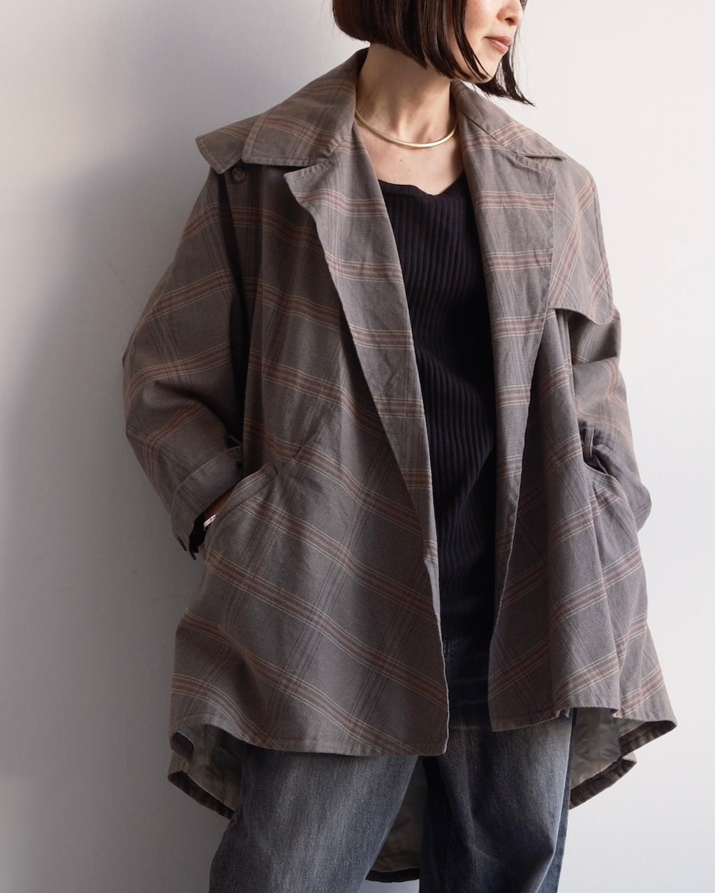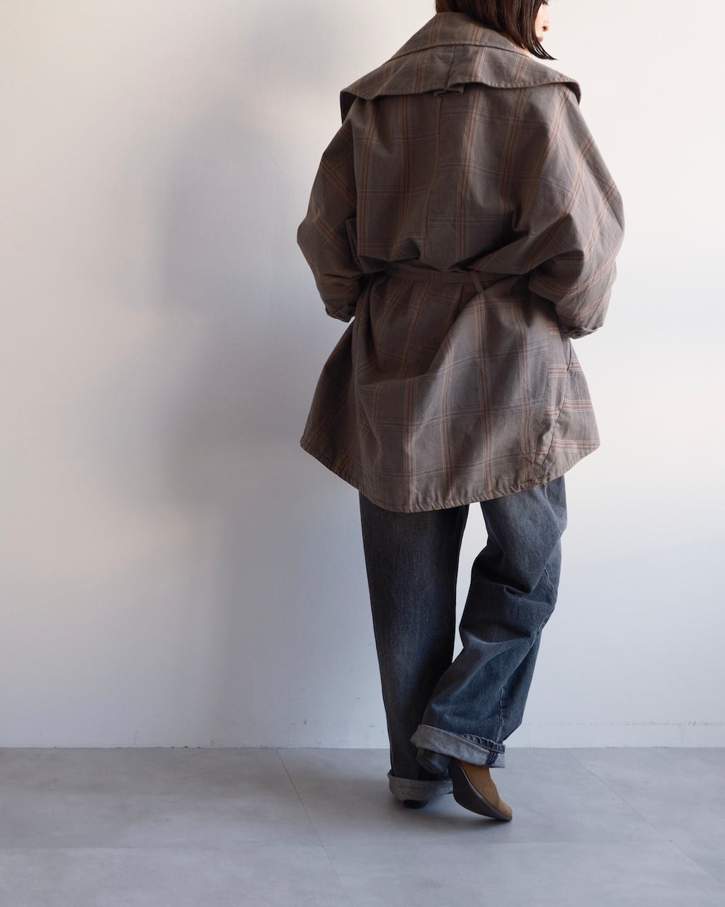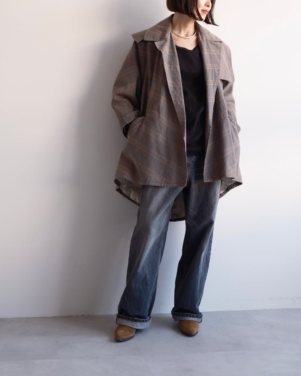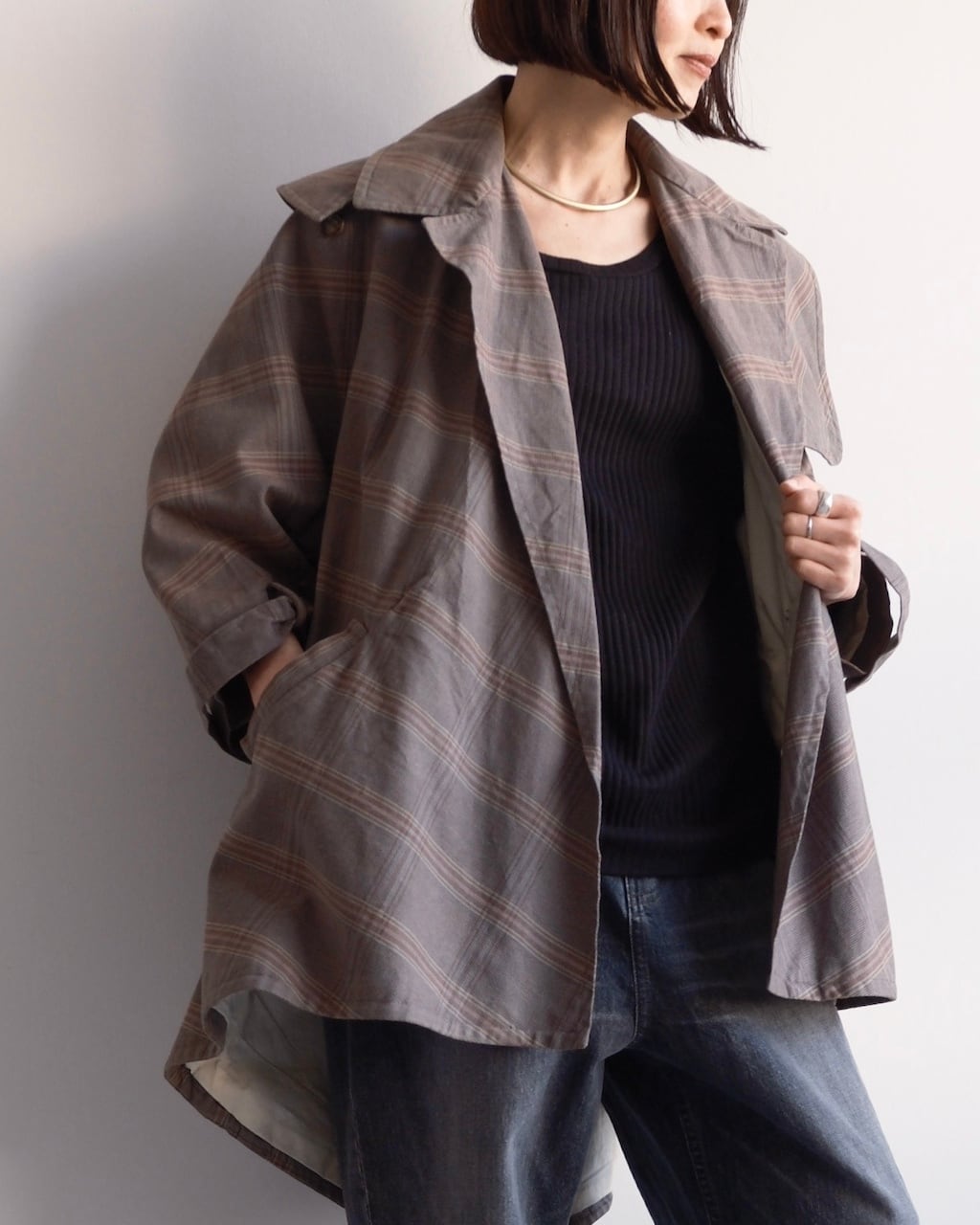 大きく開いたワイドカラーが印象的で、前を開けて羽織るだけでも立体的な表情に。