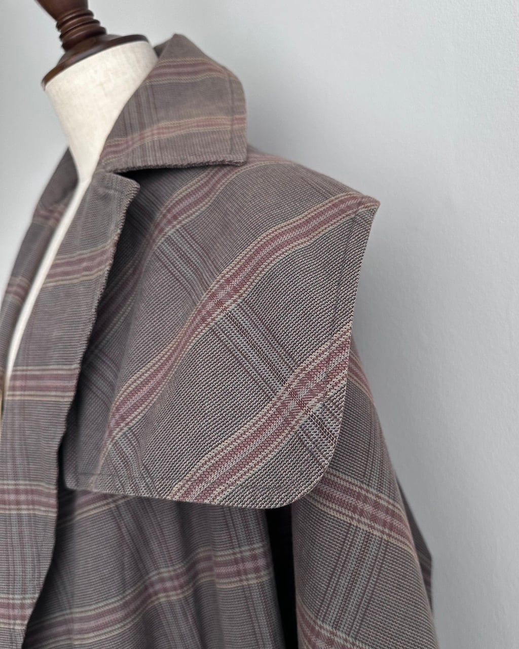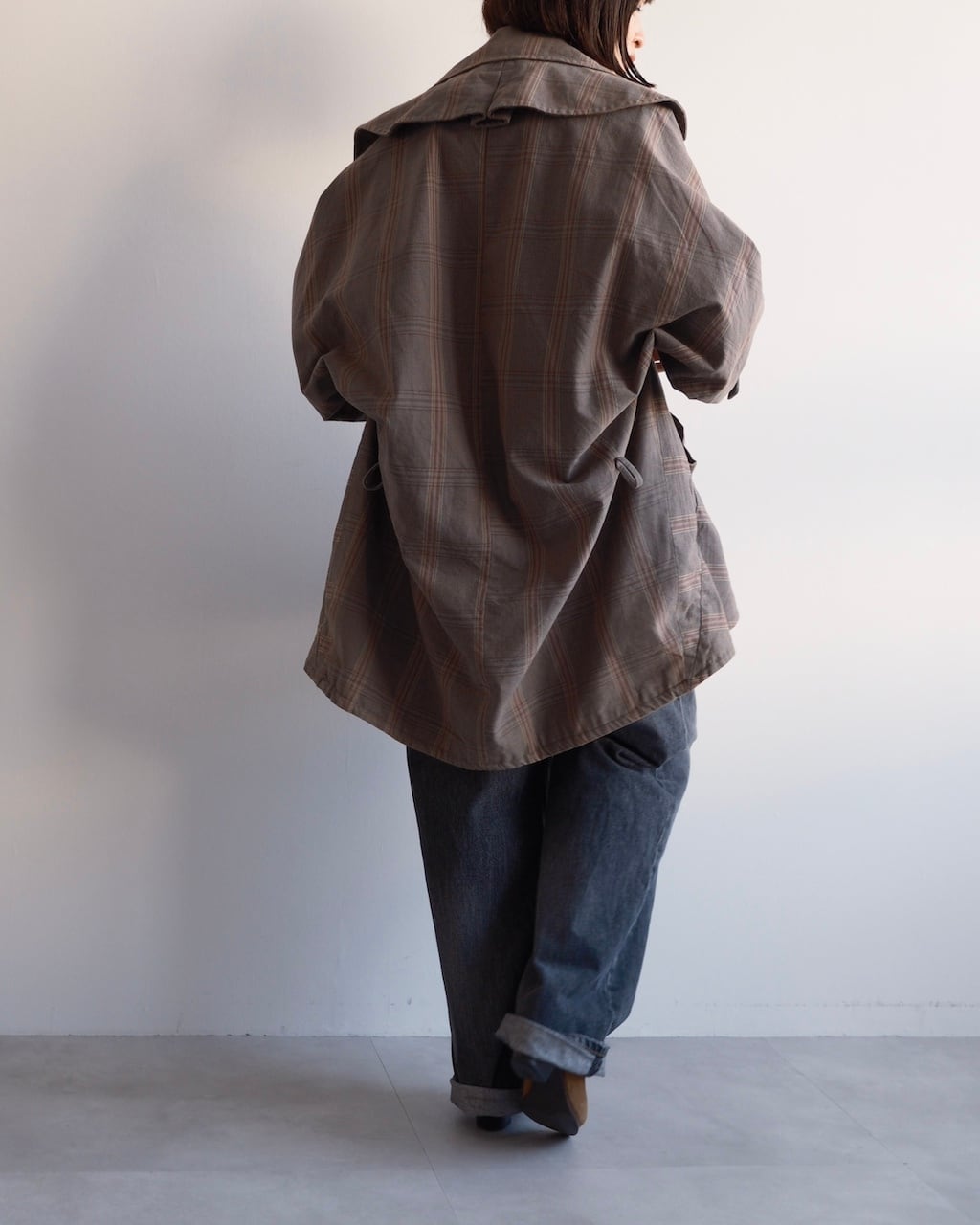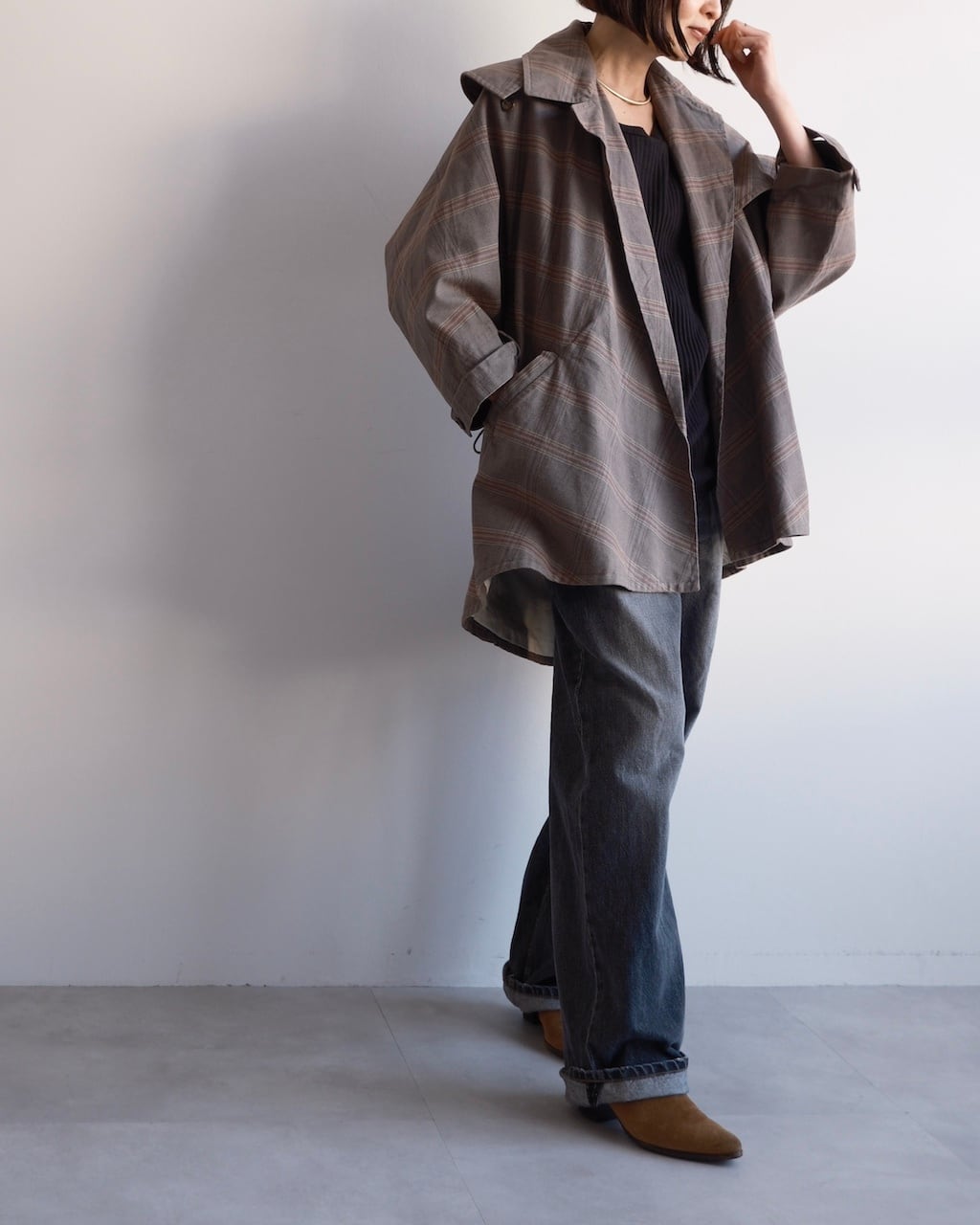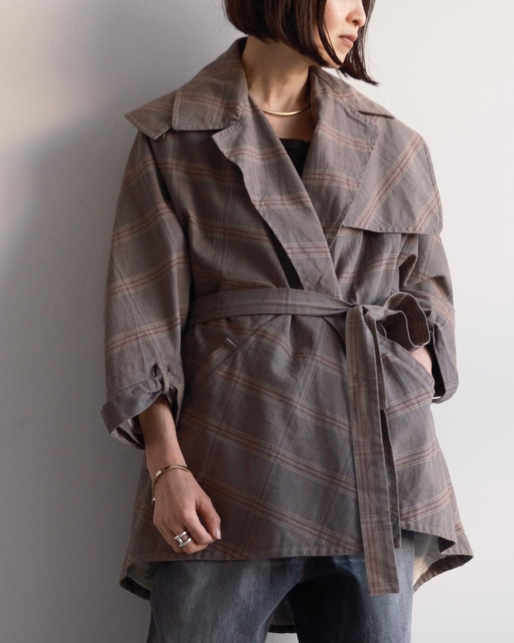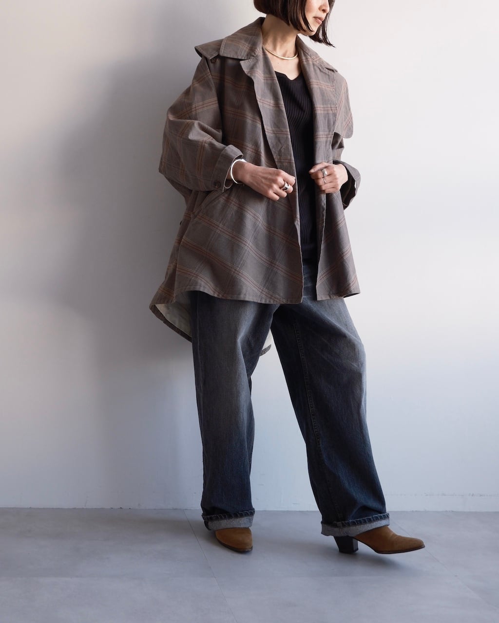 大きく開いたワイドカラーが印象的で、前を開けて羽織るだけでも立体的な表情に。