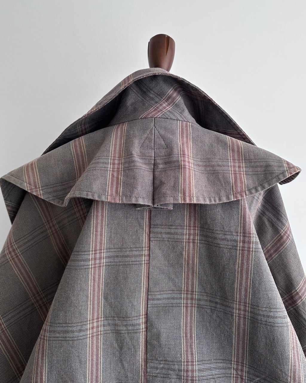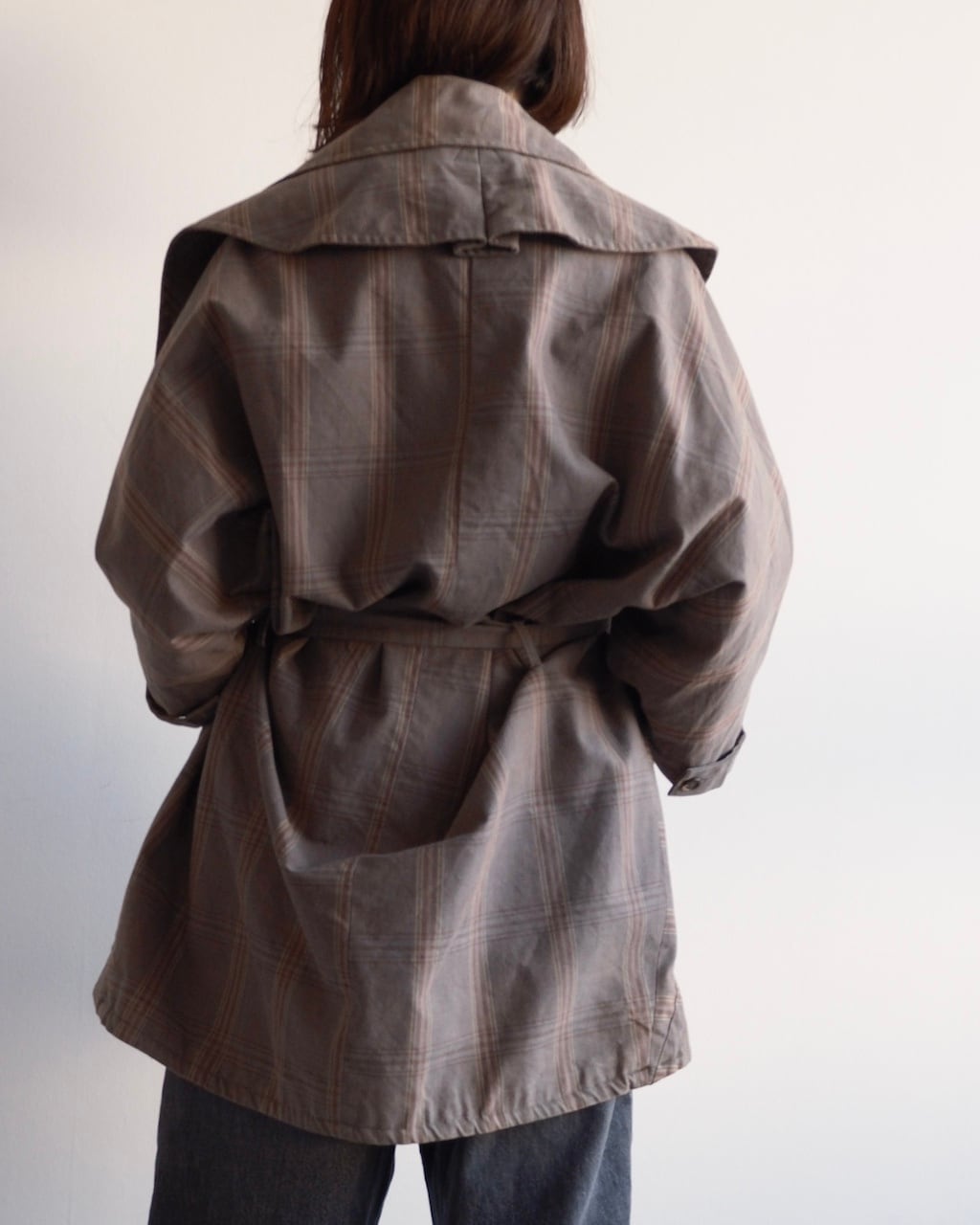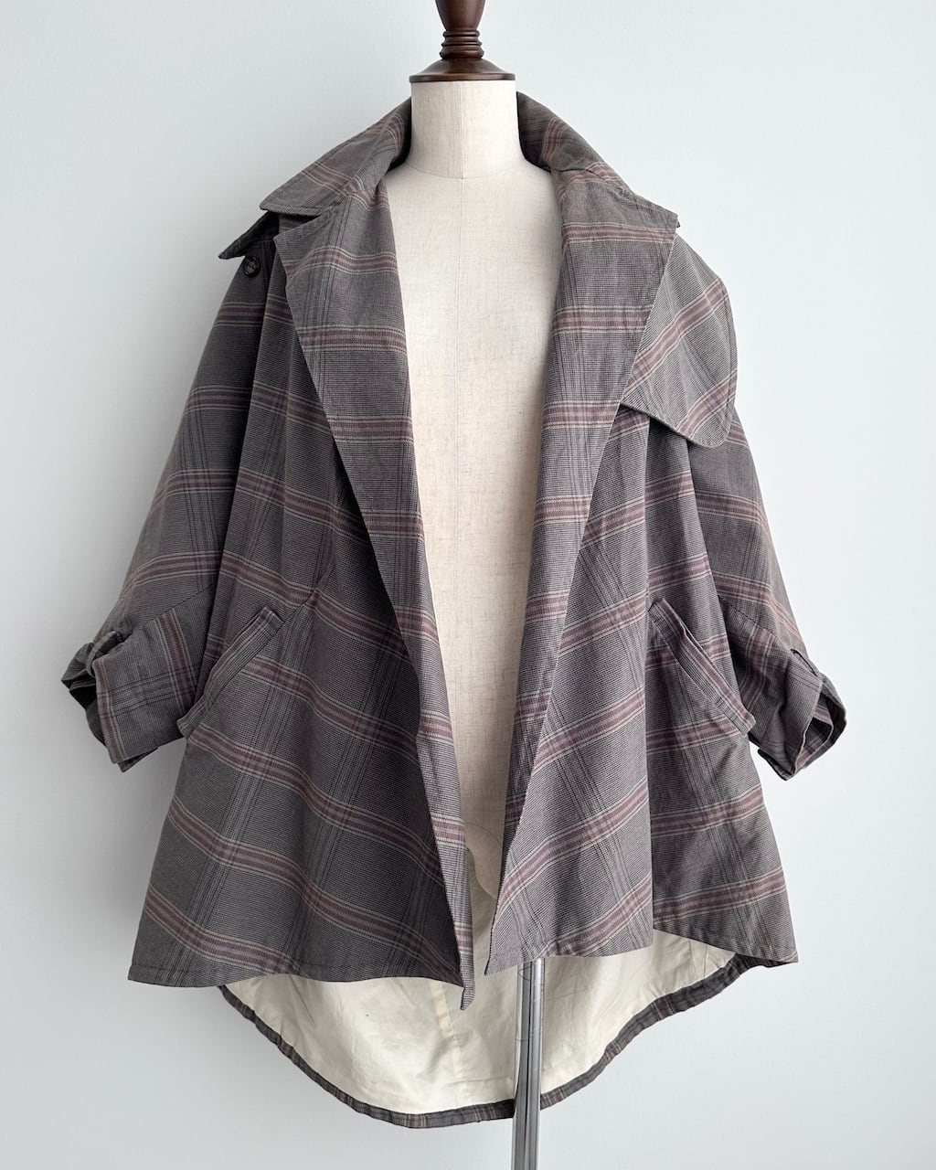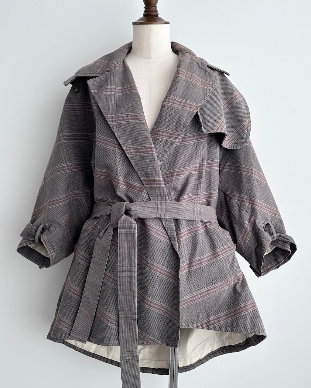 大きく開いたワイドカラーが印象的で、前を開けて羽織るだけでも立体的な表情に。