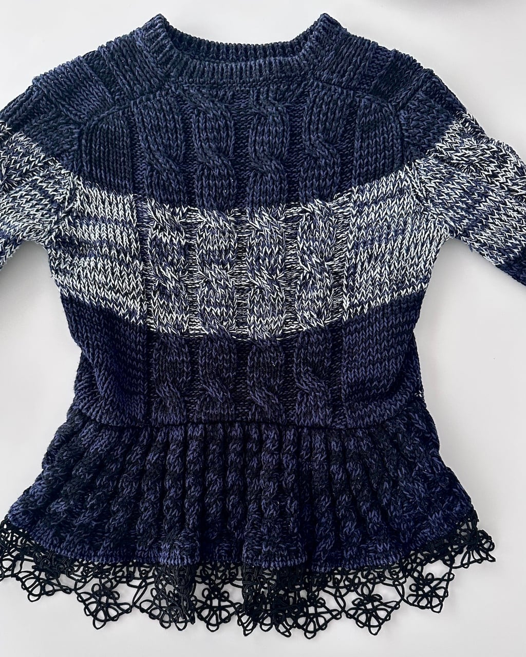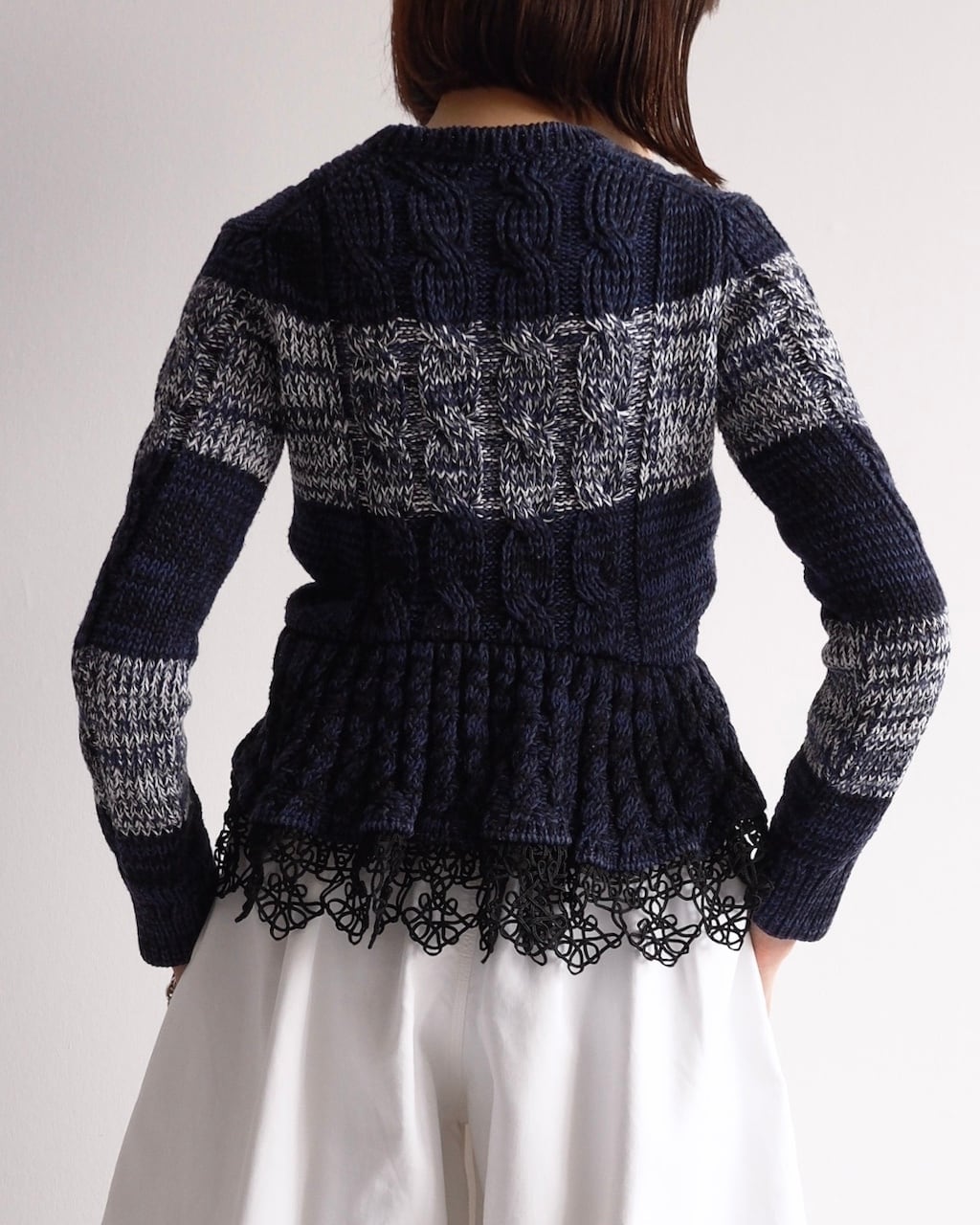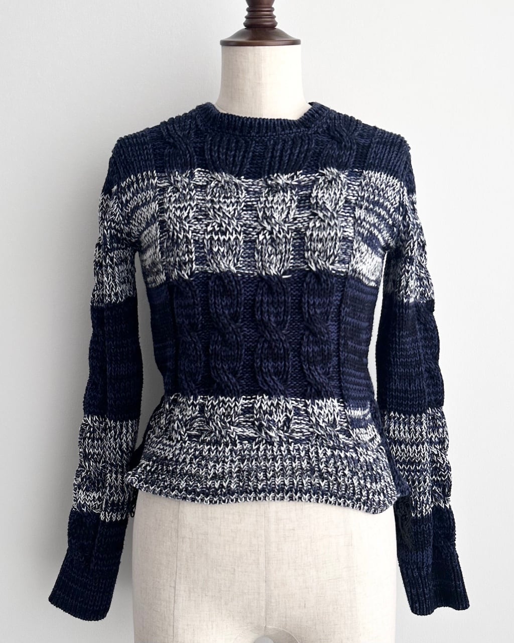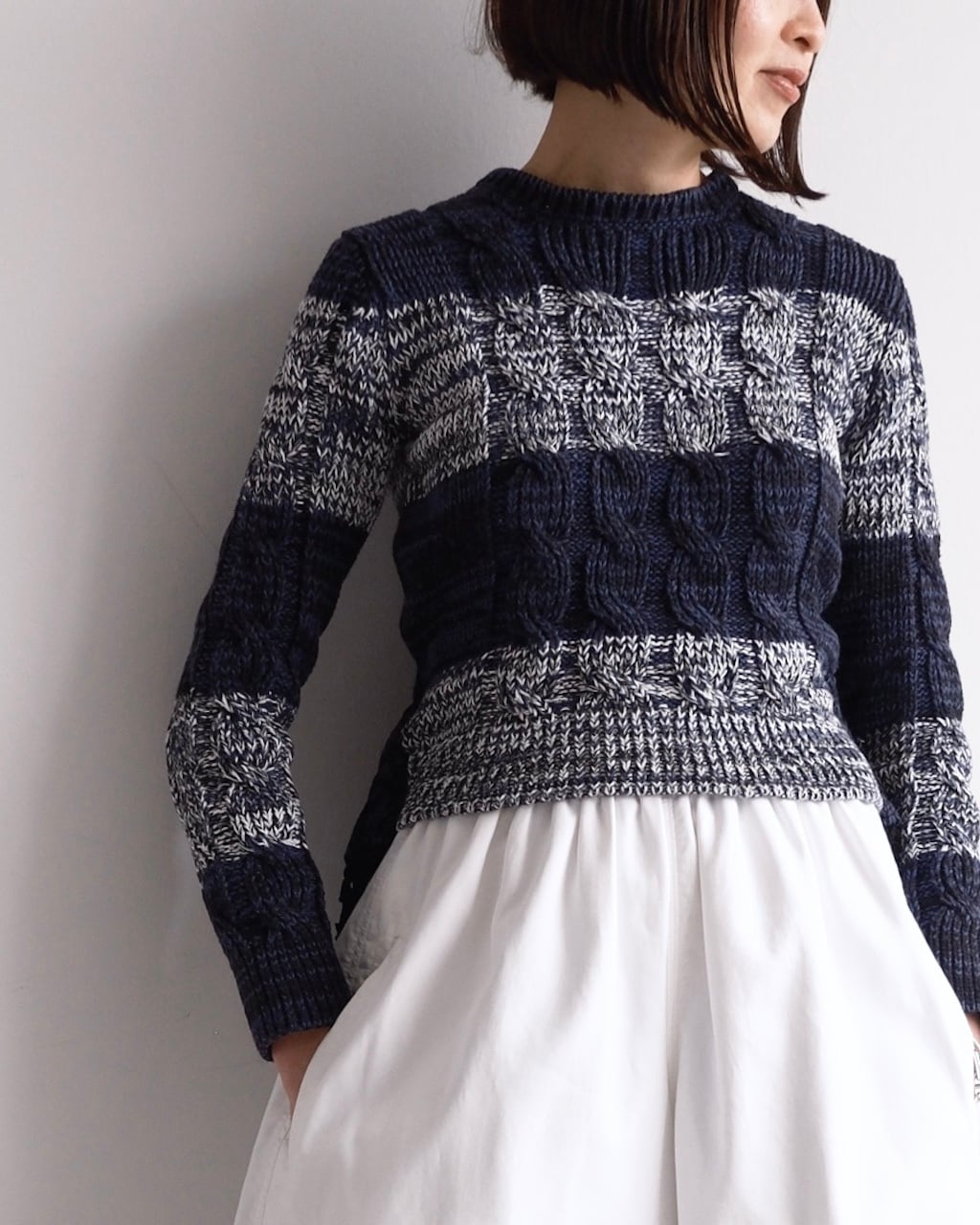 ネイビーを基調に、ミックスヤーンのボーダーと立体的なケーブル編みを組み合わせた一着です。