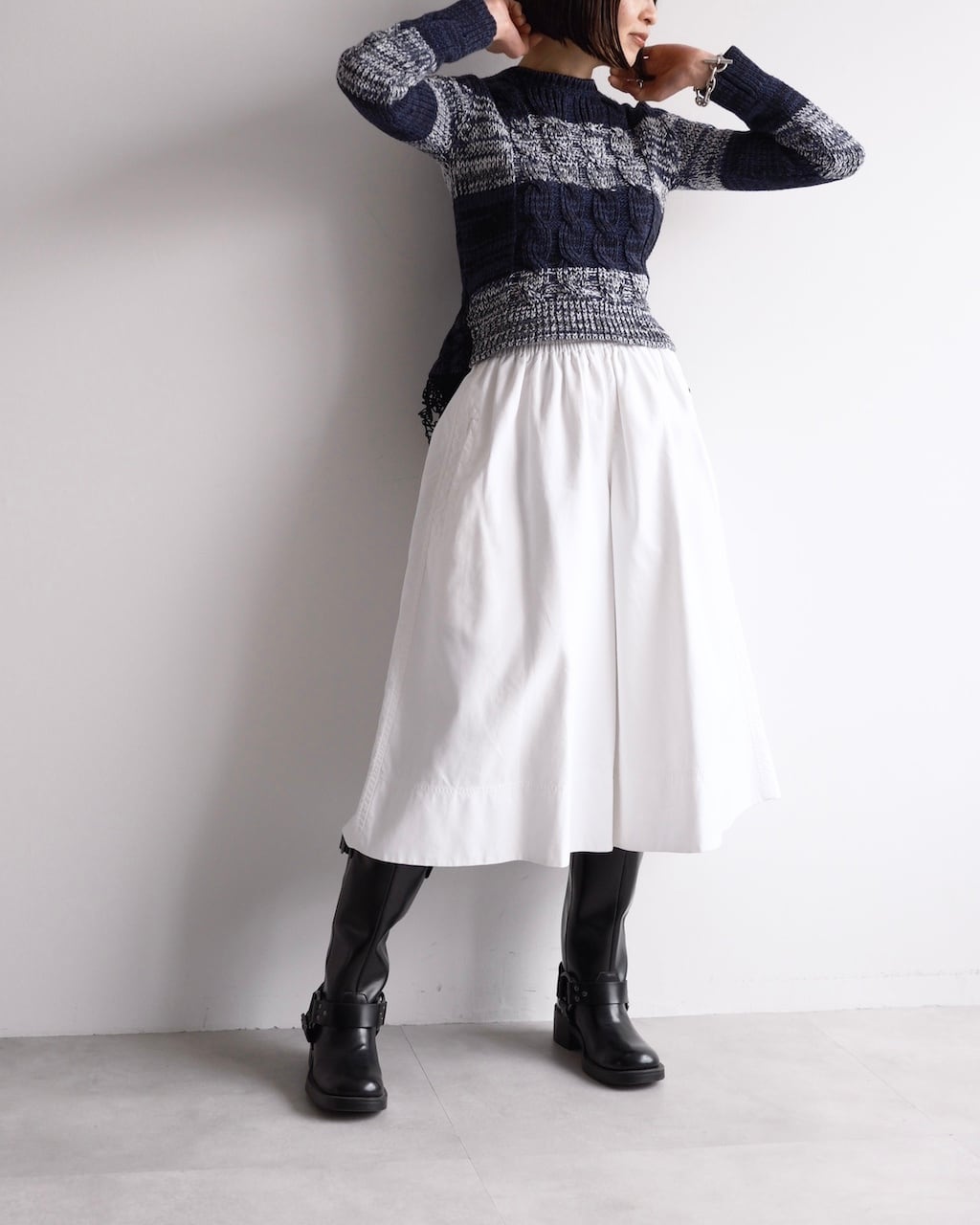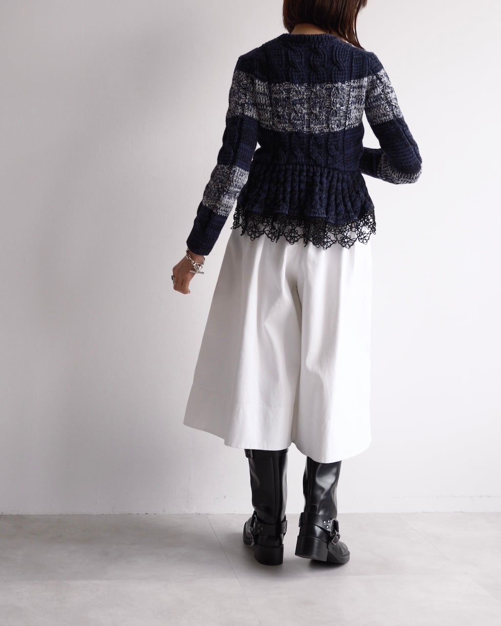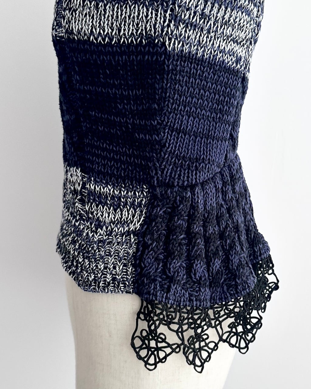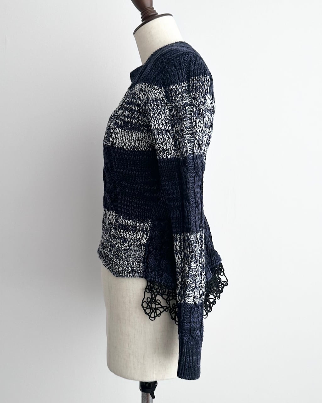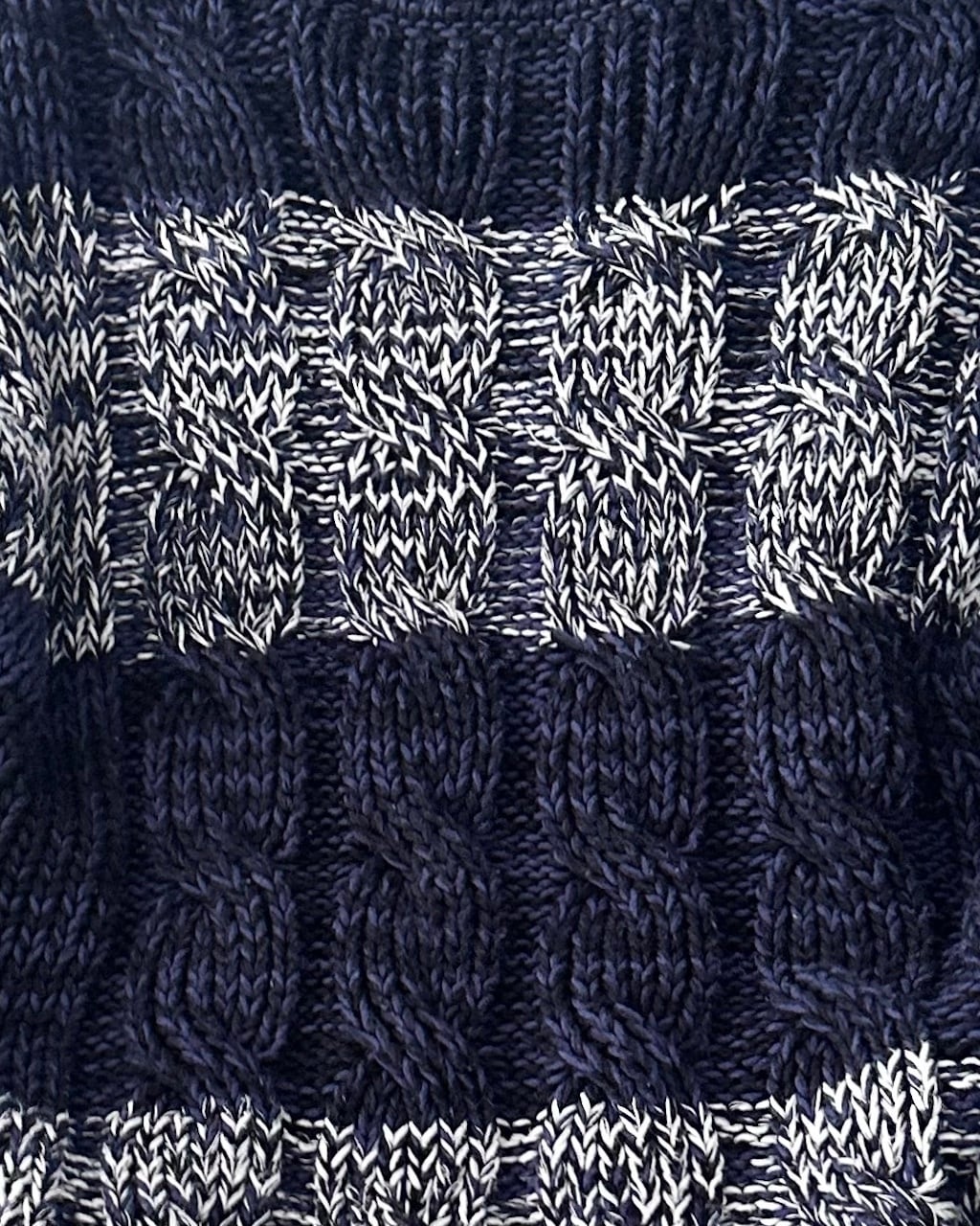ネイビーを基調に、ミックスヤーンのボーダーと立体的なケーブル編みを組み合わせた一着です。