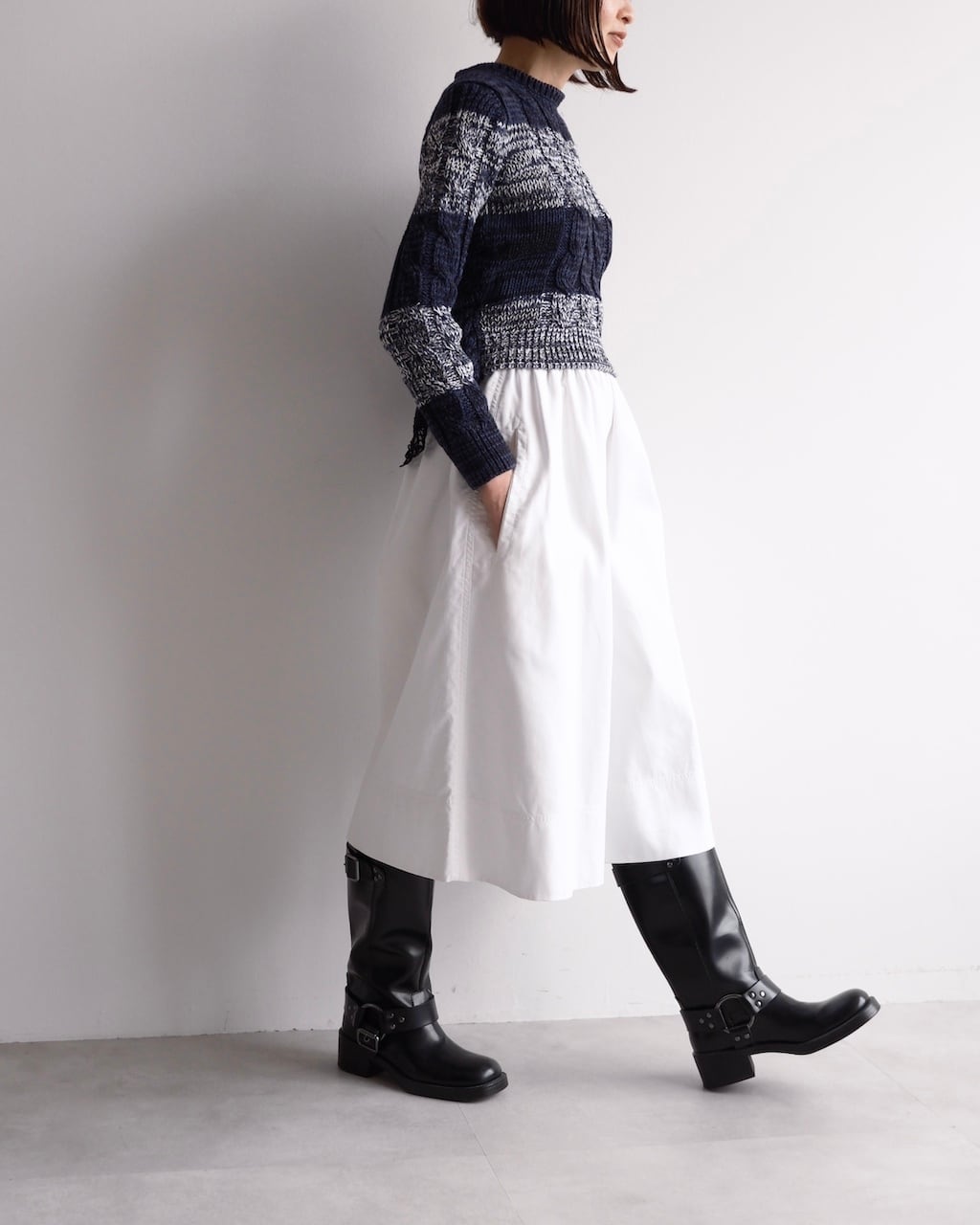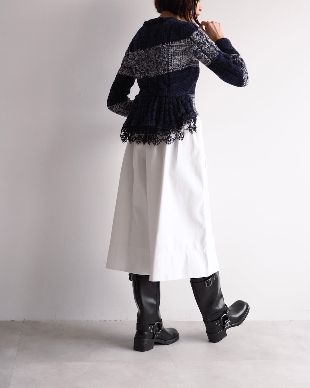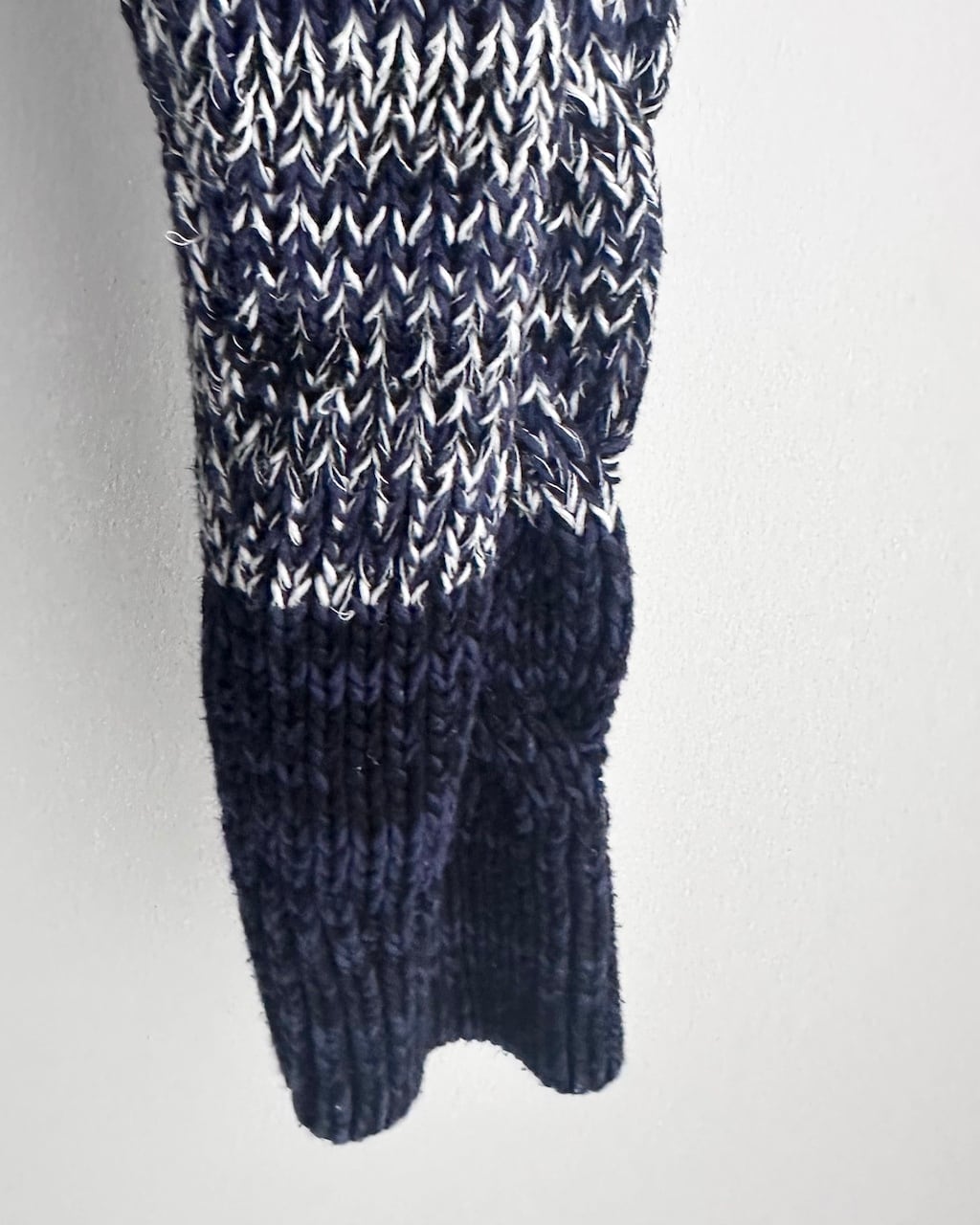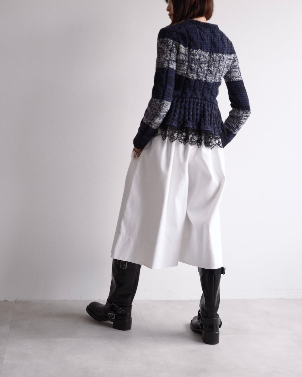 ネイビーを基調に、ミックスヤーンのボーダーと立体的なケーブル編みを組み合わせた一着です。