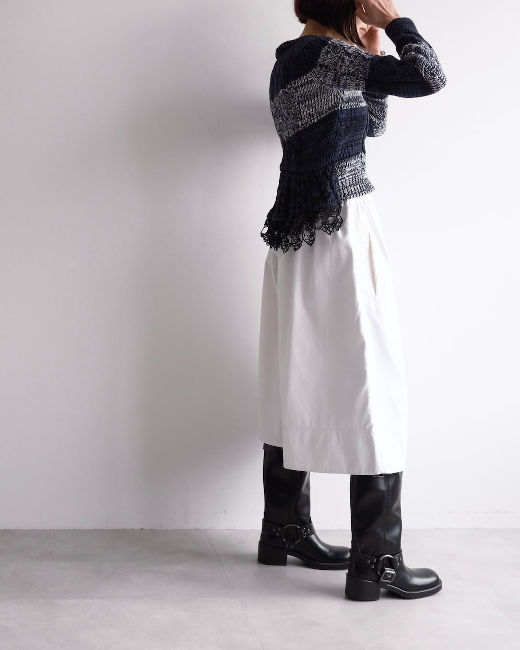 しっかりと編み立てられた肉厚なコットンニットで、重厚でクリーンな印象を与えます。