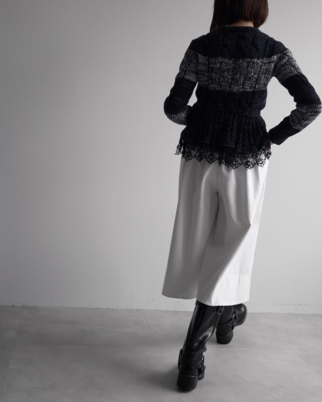 後ろ身頃はウエスト下からペプラム状に広がる構造で、裾にはブラックの立体的なコードレースがあしらわれています。