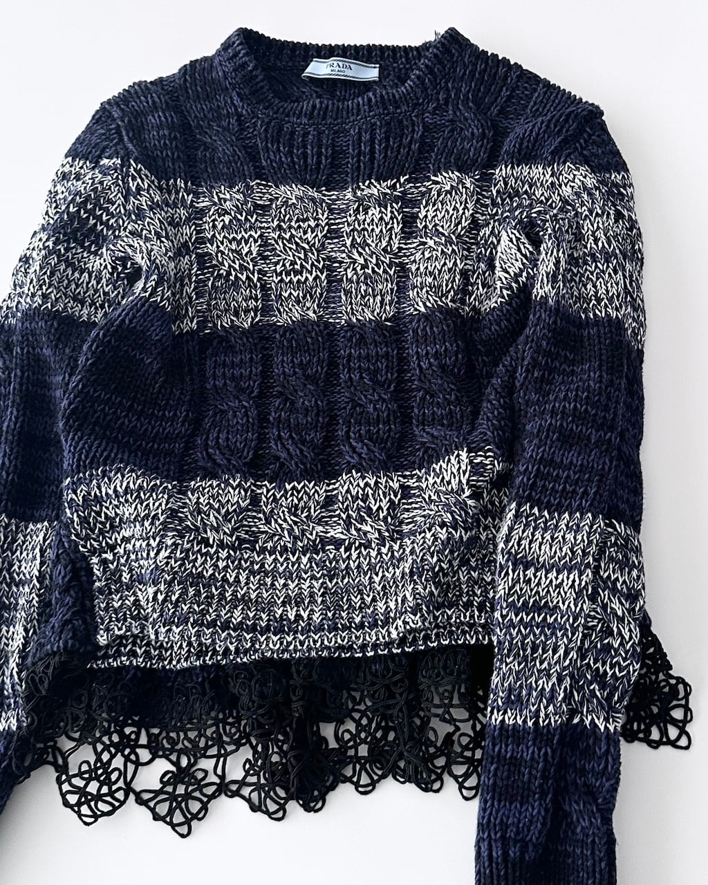 クラシックなケーブルニットにPRADAらしいモダンな要素が添えられた一枚。