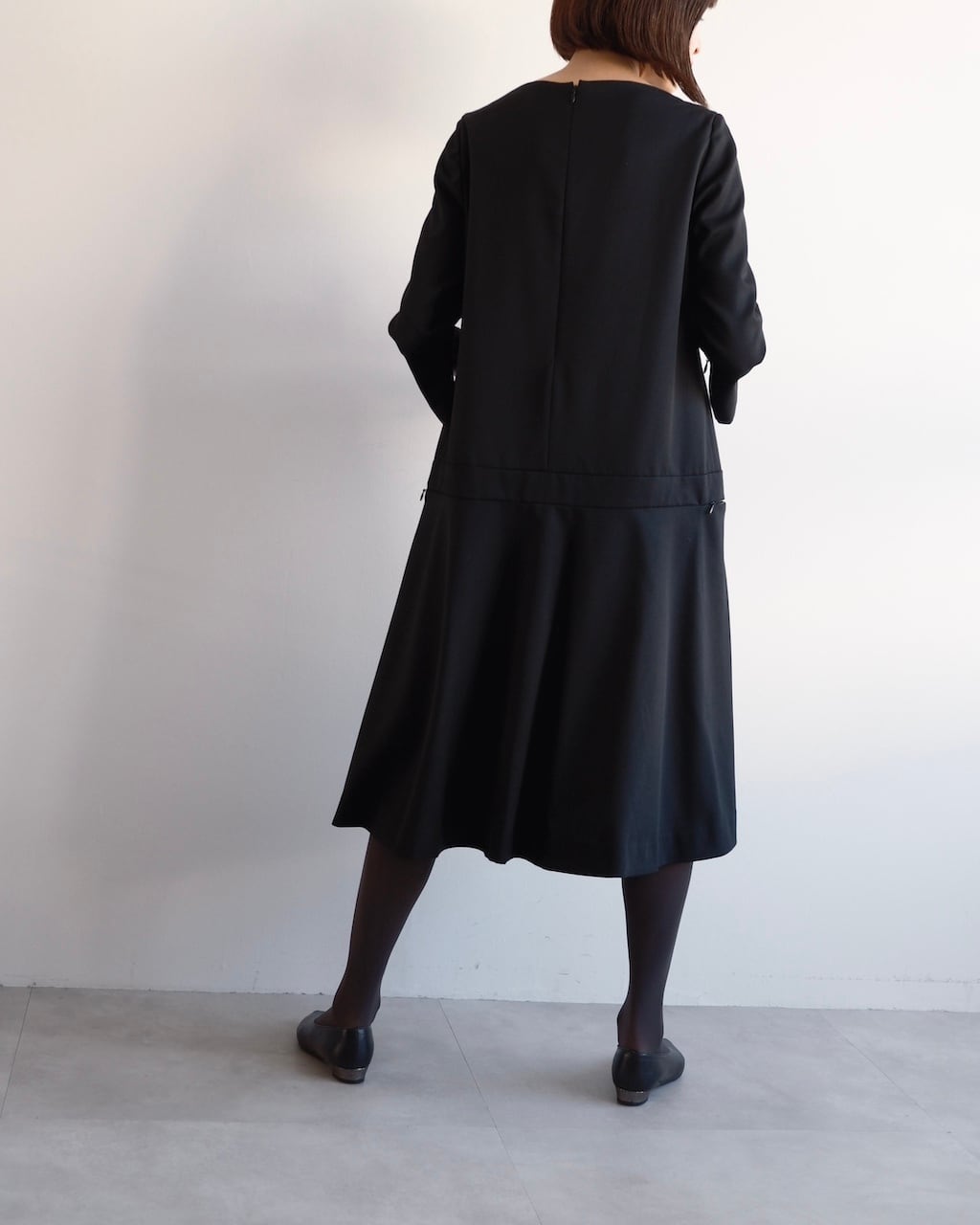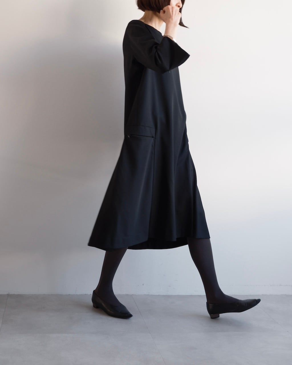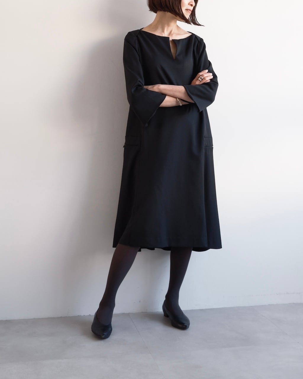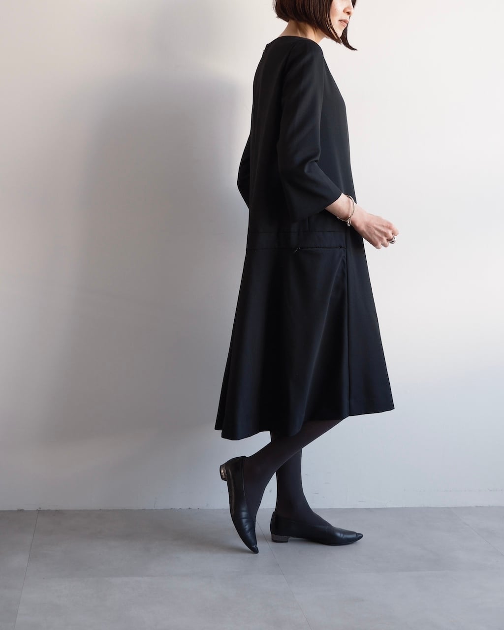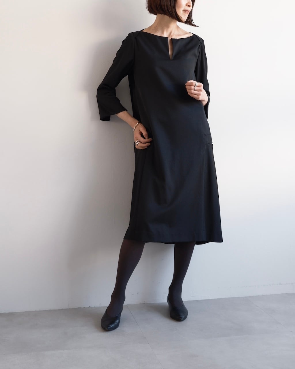ミニマムなのに存在感があり、一枚で完成するブラックワンピースです。