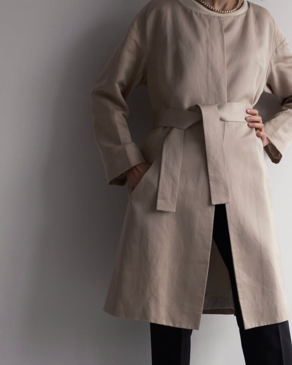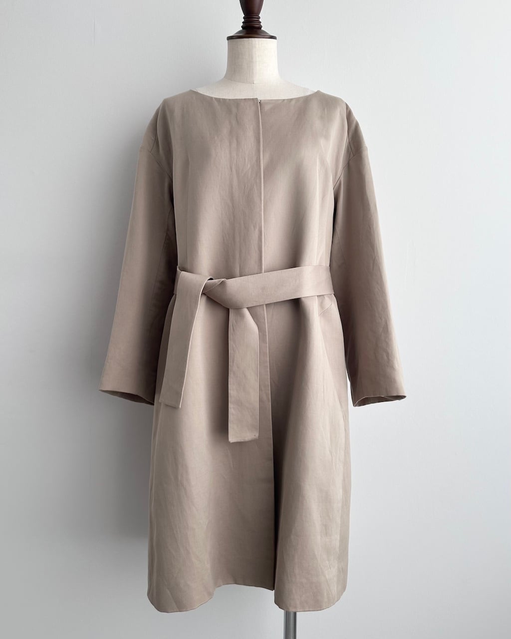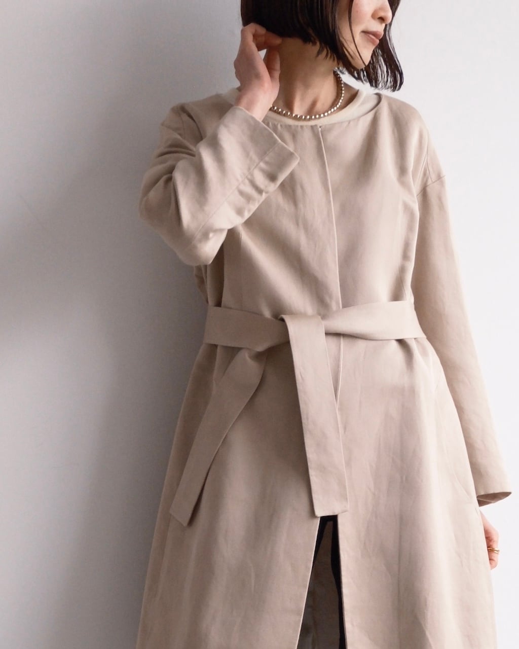 すっきりとしたネックライン、ミニマルなフロント、共布ベルトでシルエットに変化をつけられるデザインが特徴です。