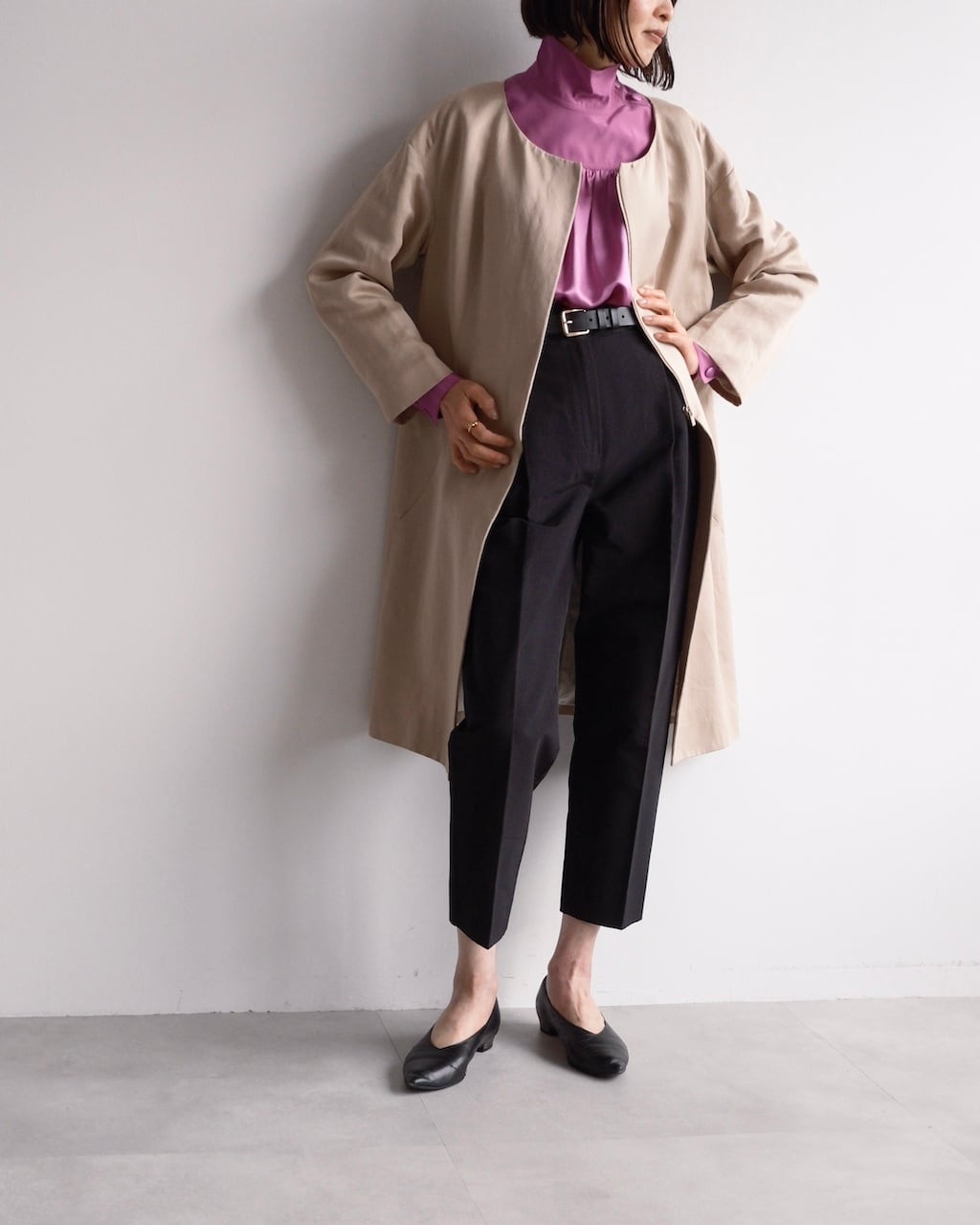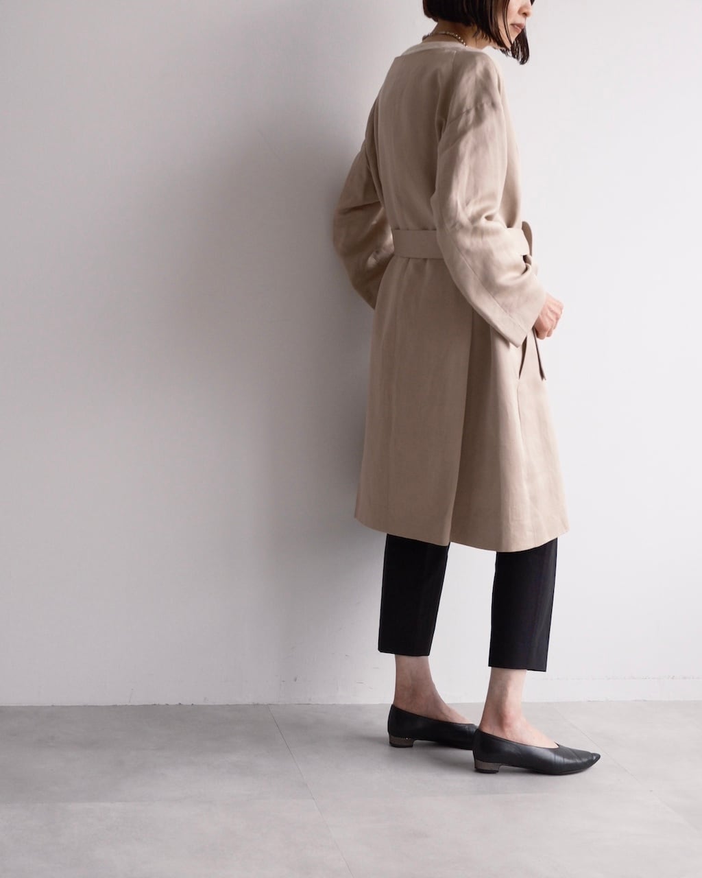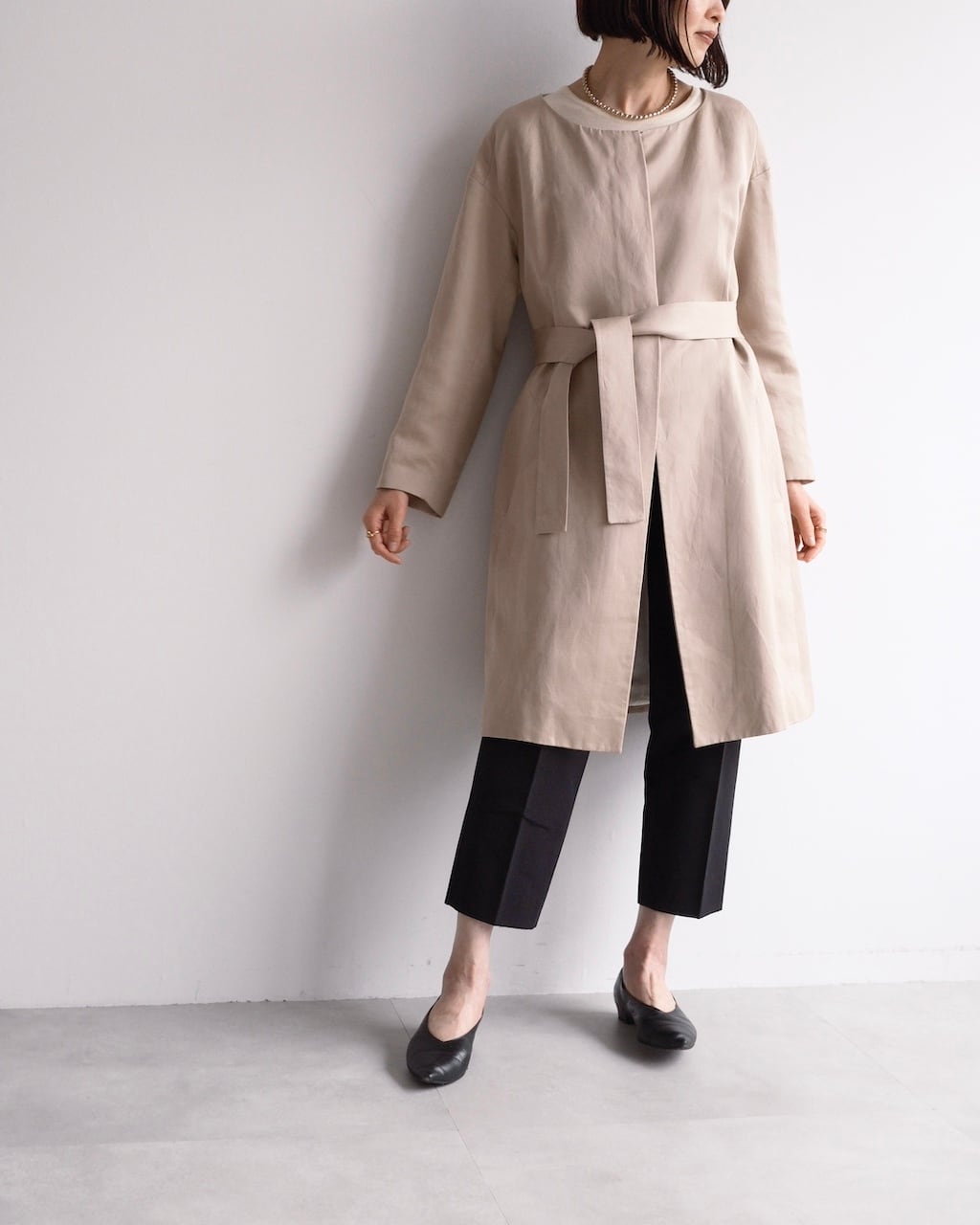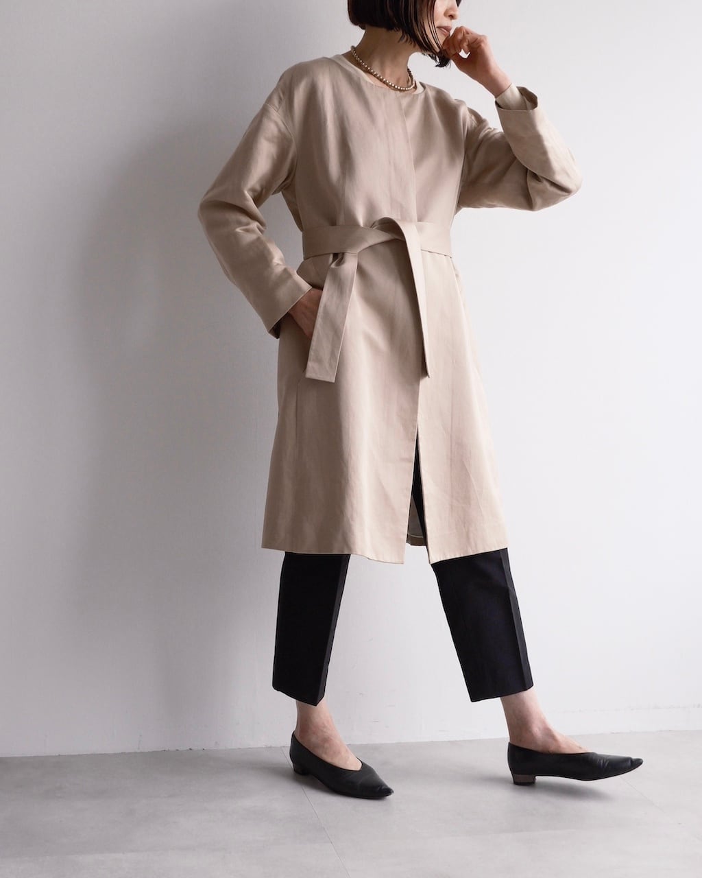 すっきりとしたネックライン、ミニマルなフロント、共布ベルトでシルエットに変化をつけられるデザインが特徴です。