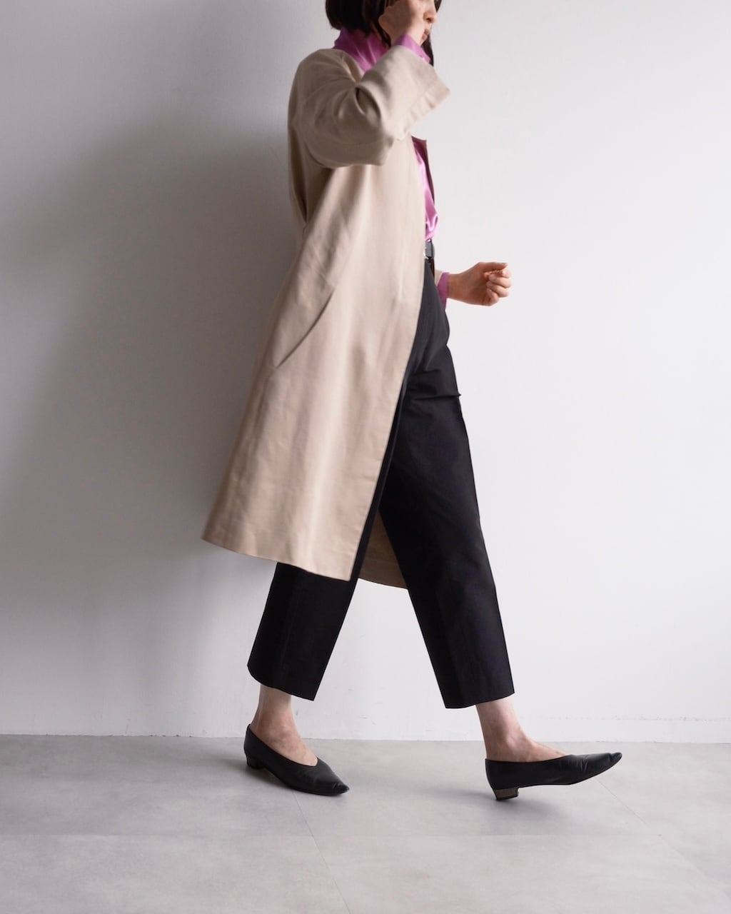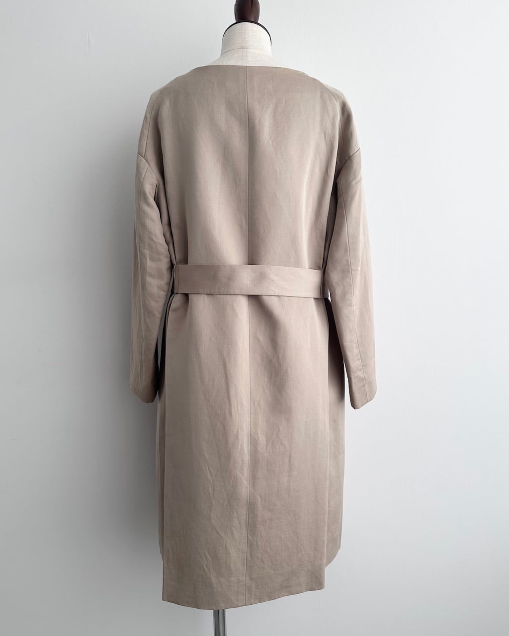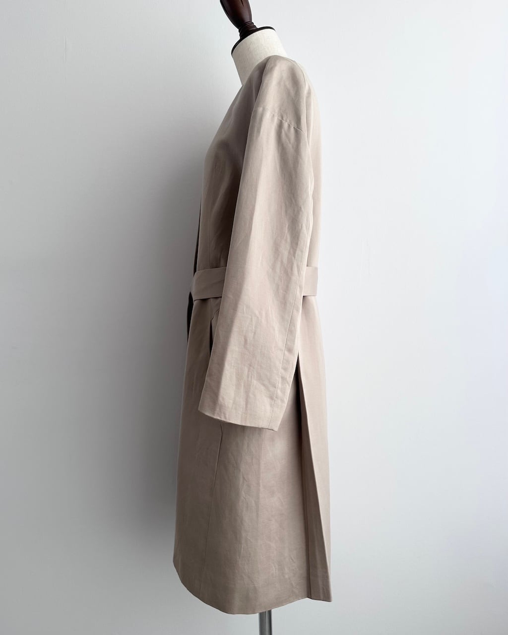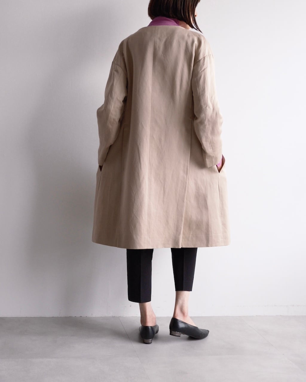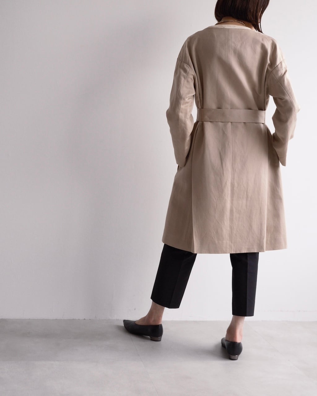 シルク100%の滑らかな表地に、リネンとコットンを混紡した裏地を組み合わせた、春らしい軽やかなコート。