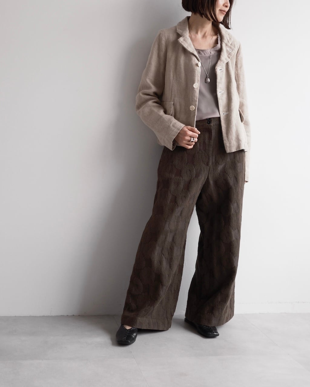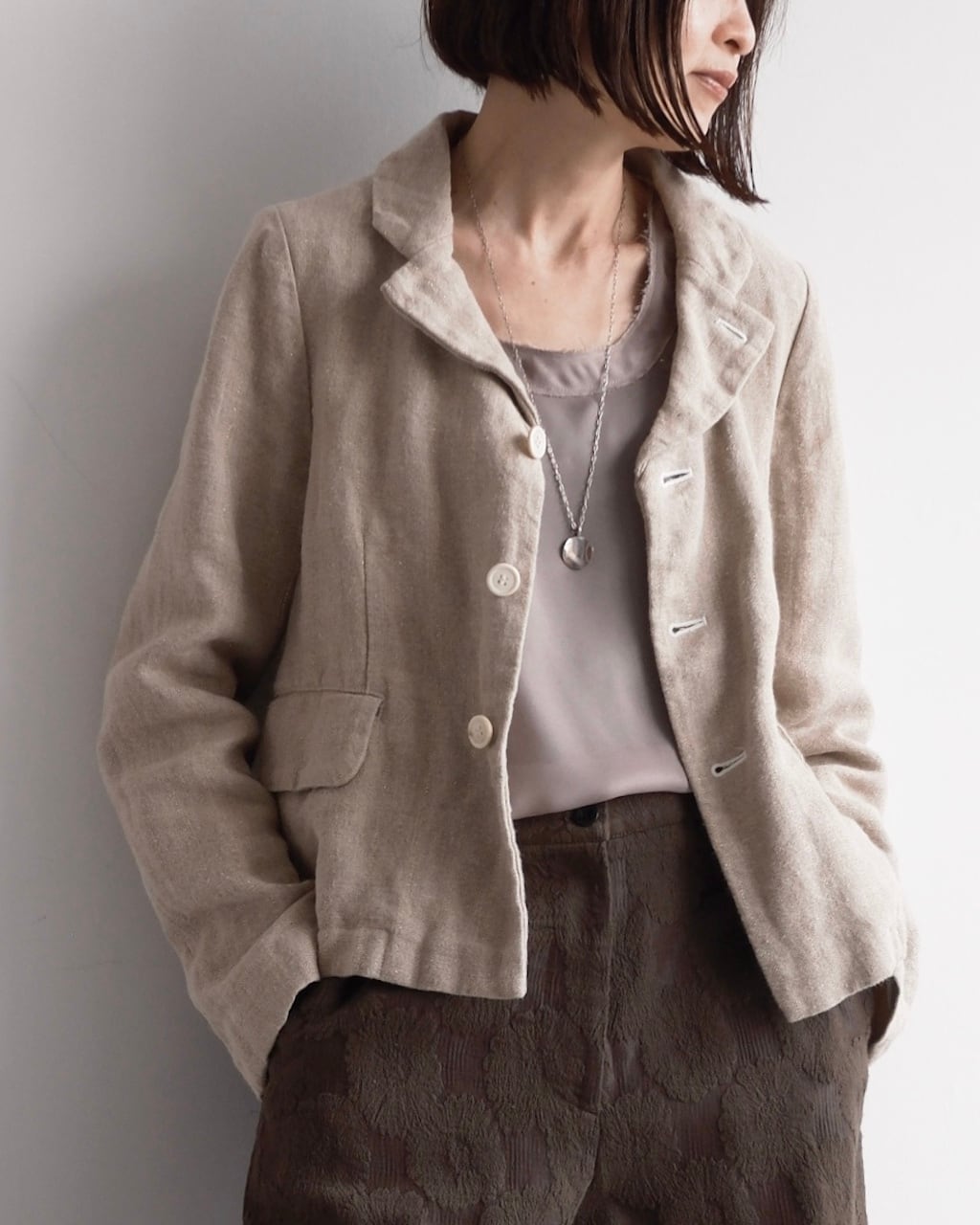 デニムやワイドパンツ、ワンピースなどとも合わせやすく、季節の変わり目の羽織りとしても活躍する一着です。