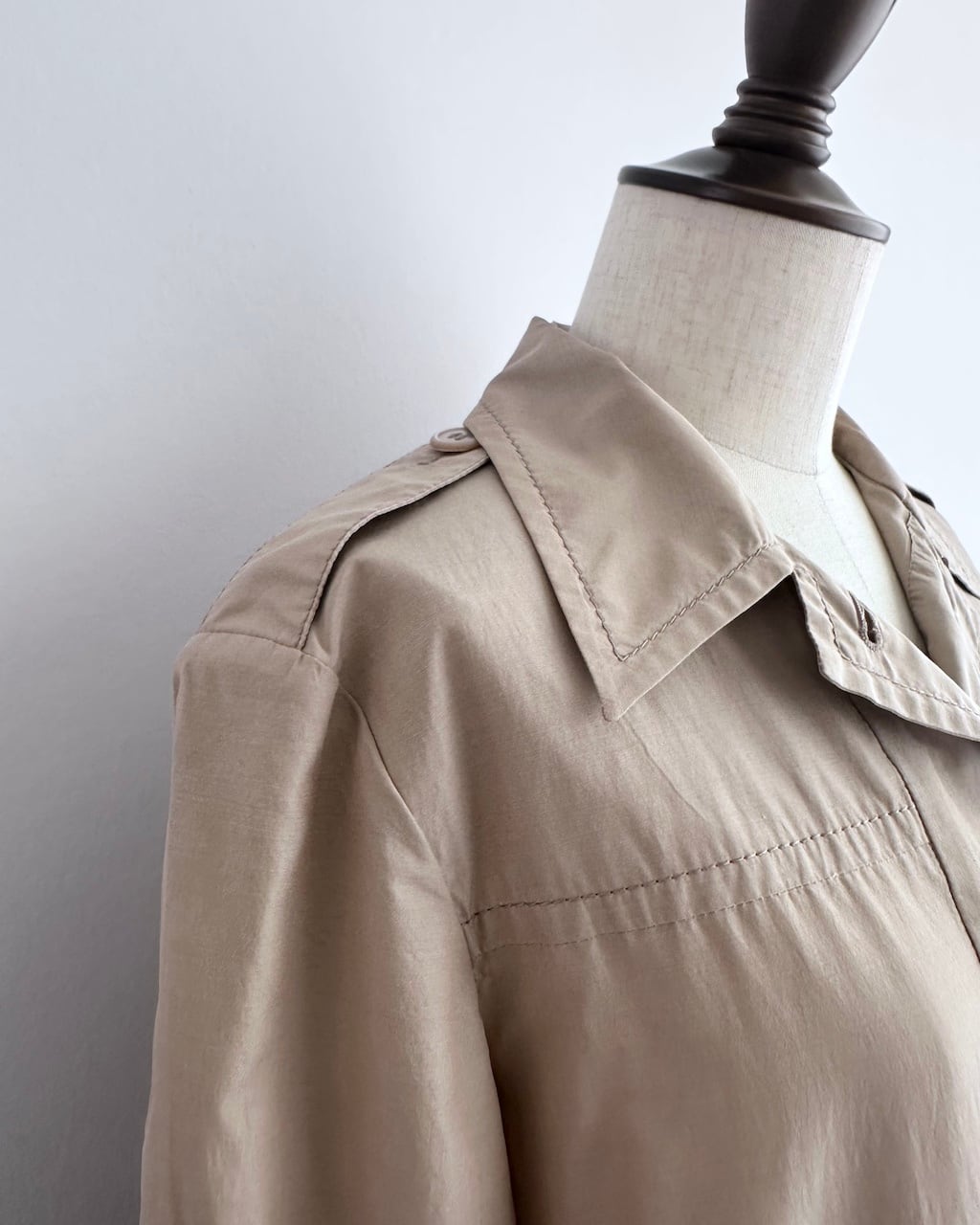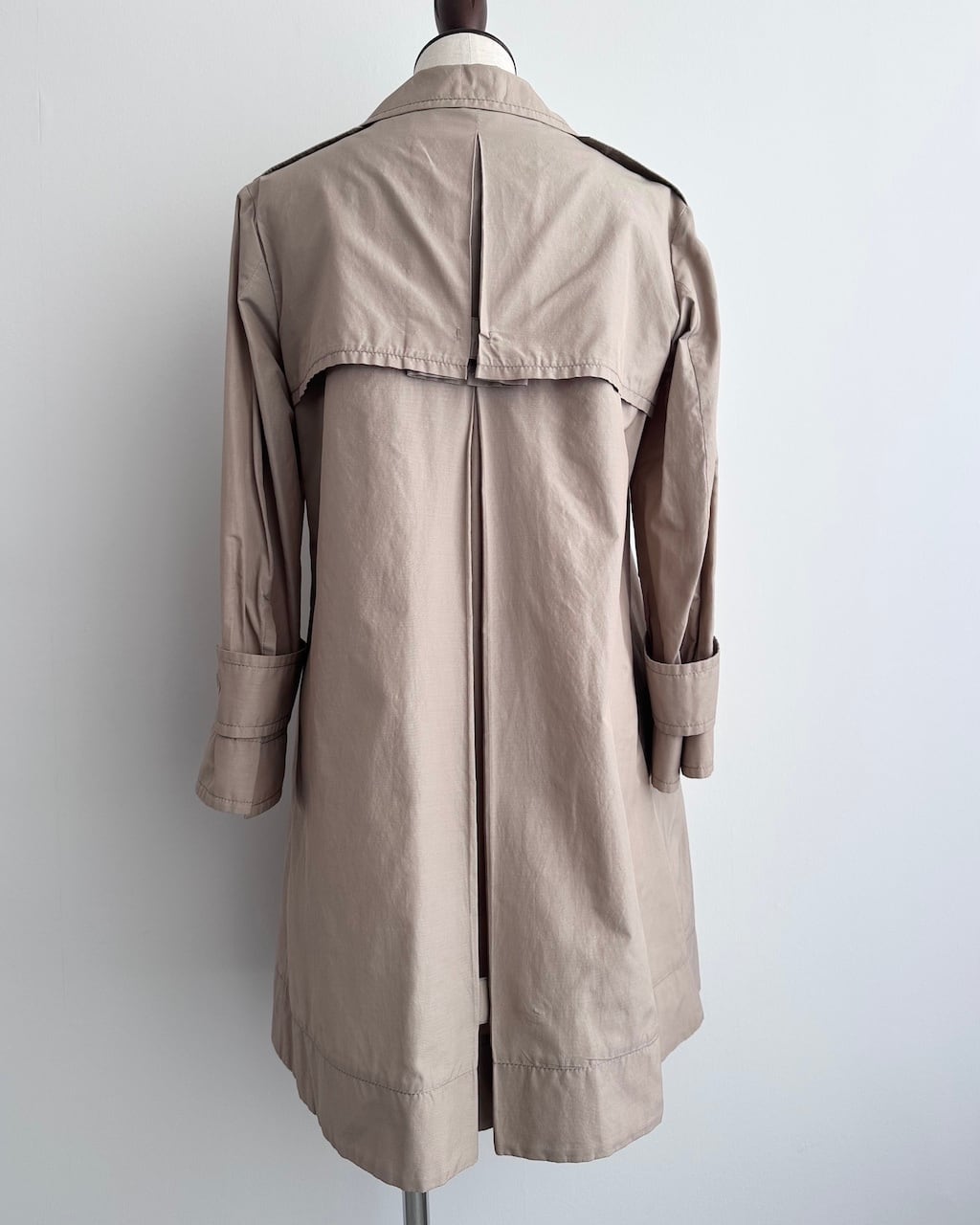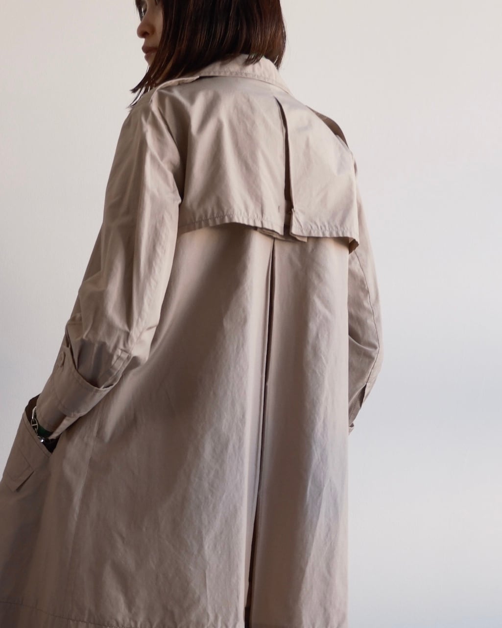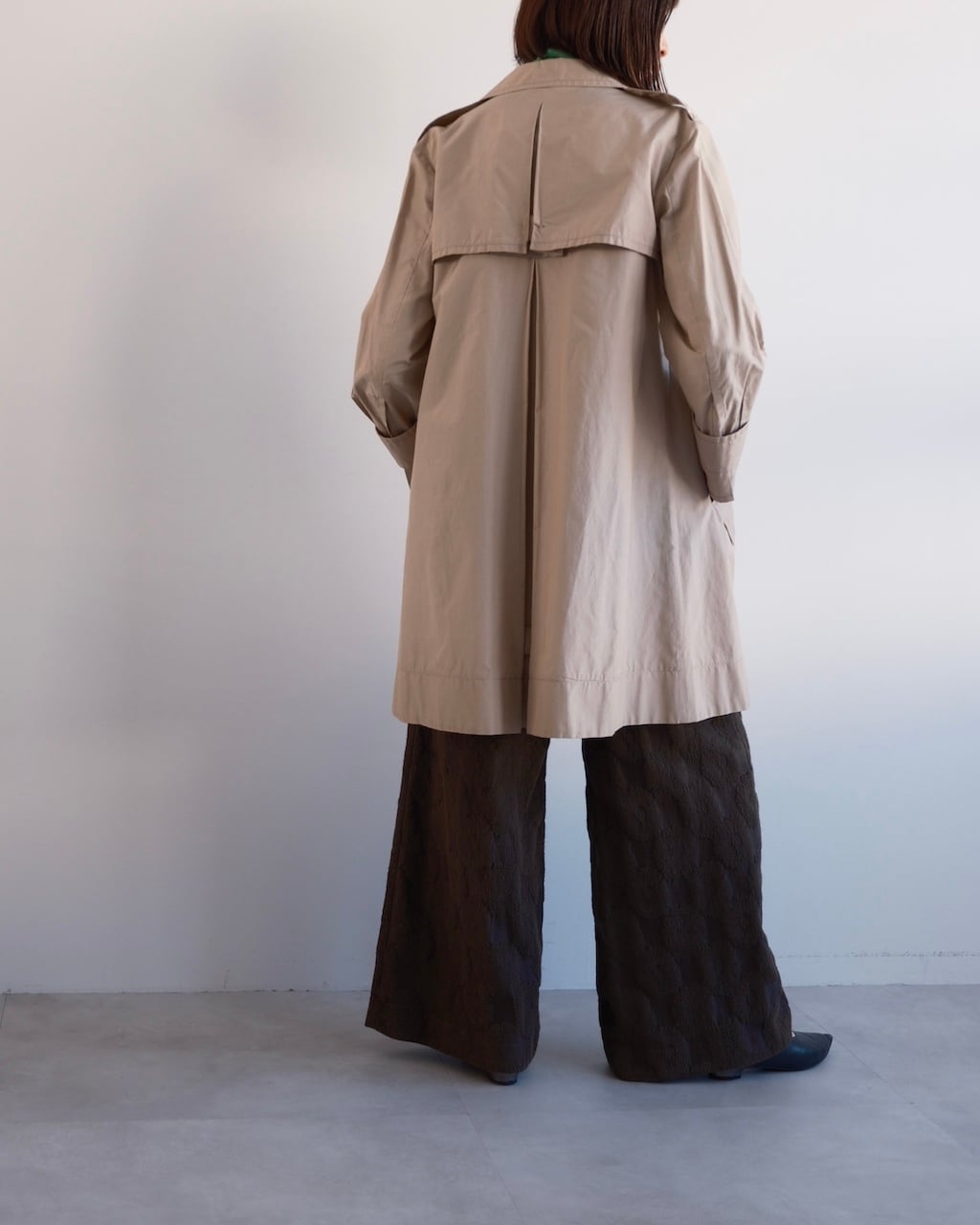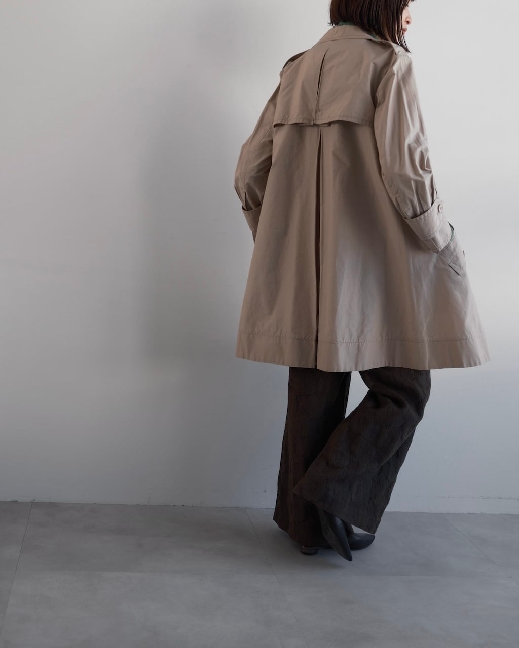 背面にはケープ状のヨークとセンタープリーツが施され、自然な立体感が生まれます。