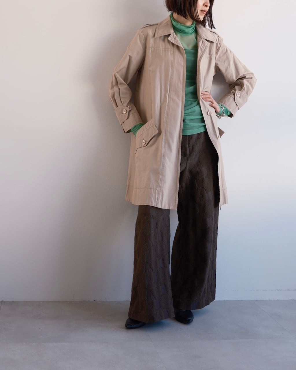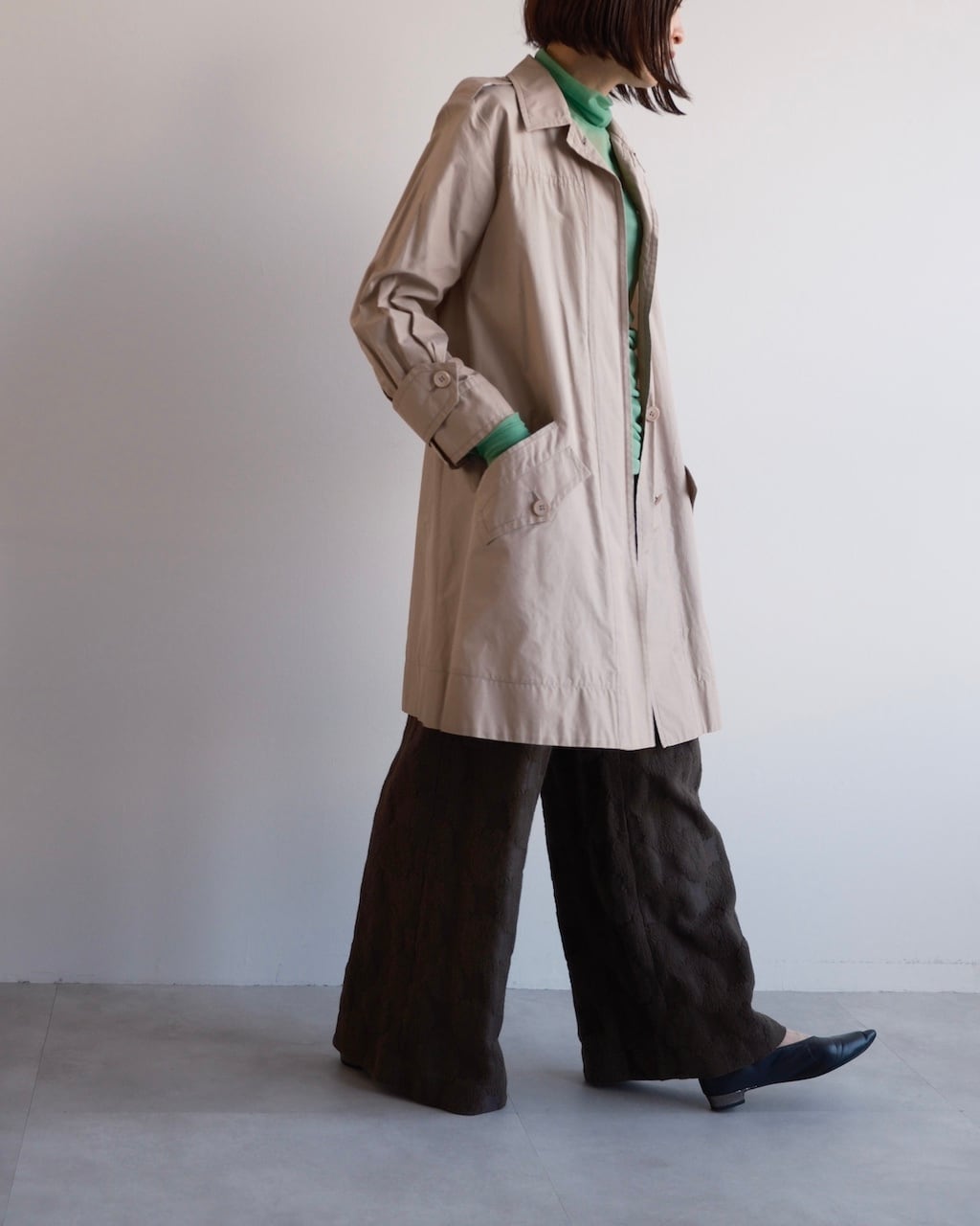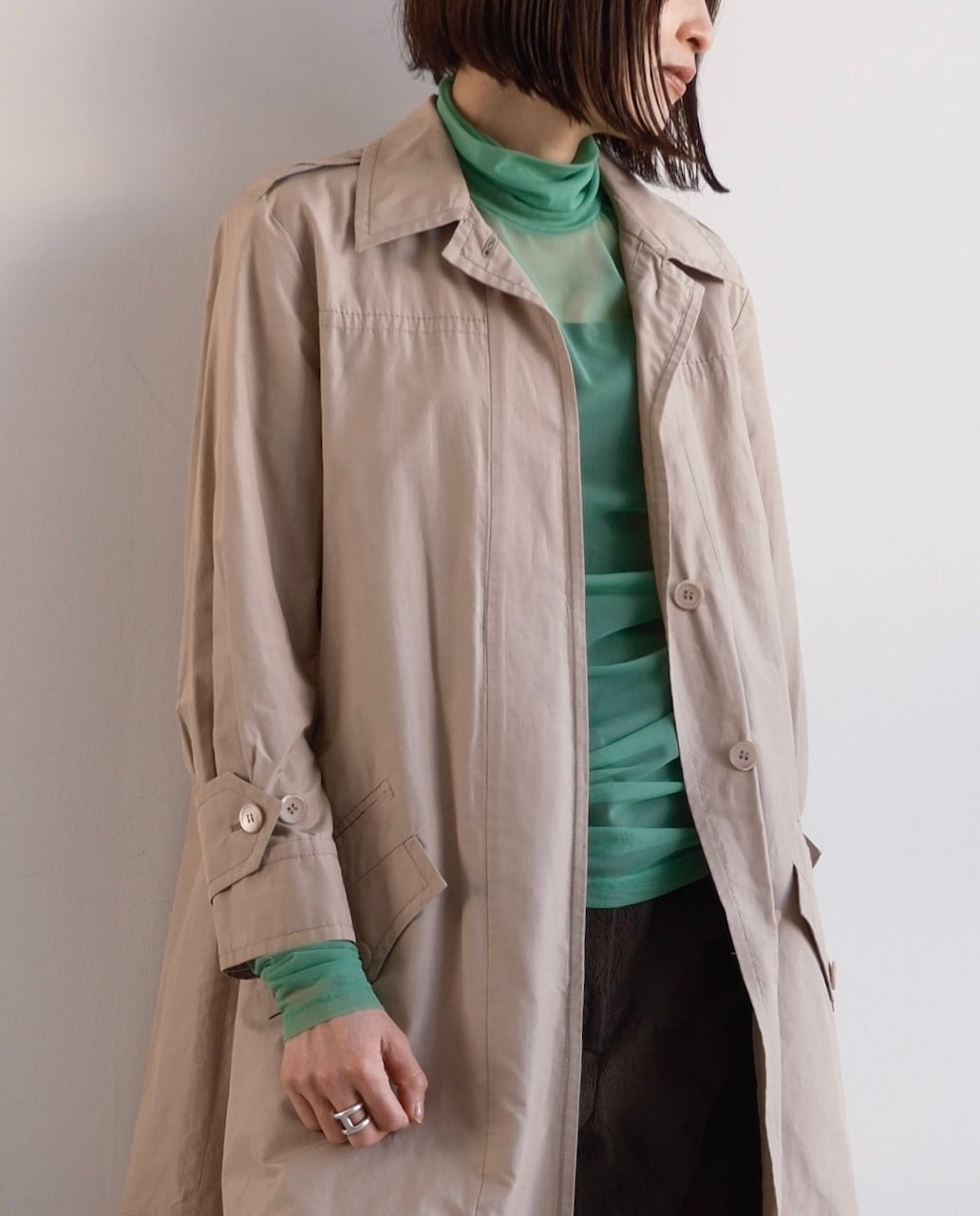 クラシックなトレンチのディテールをベースにしながら、フロントはすっきりとした比翼仕立てに。