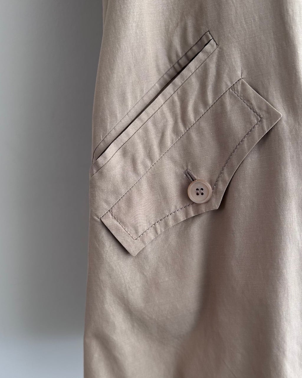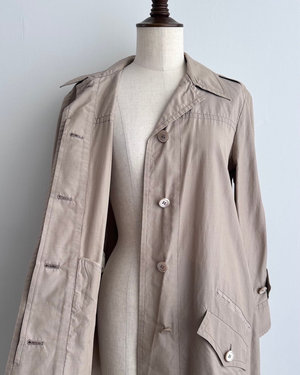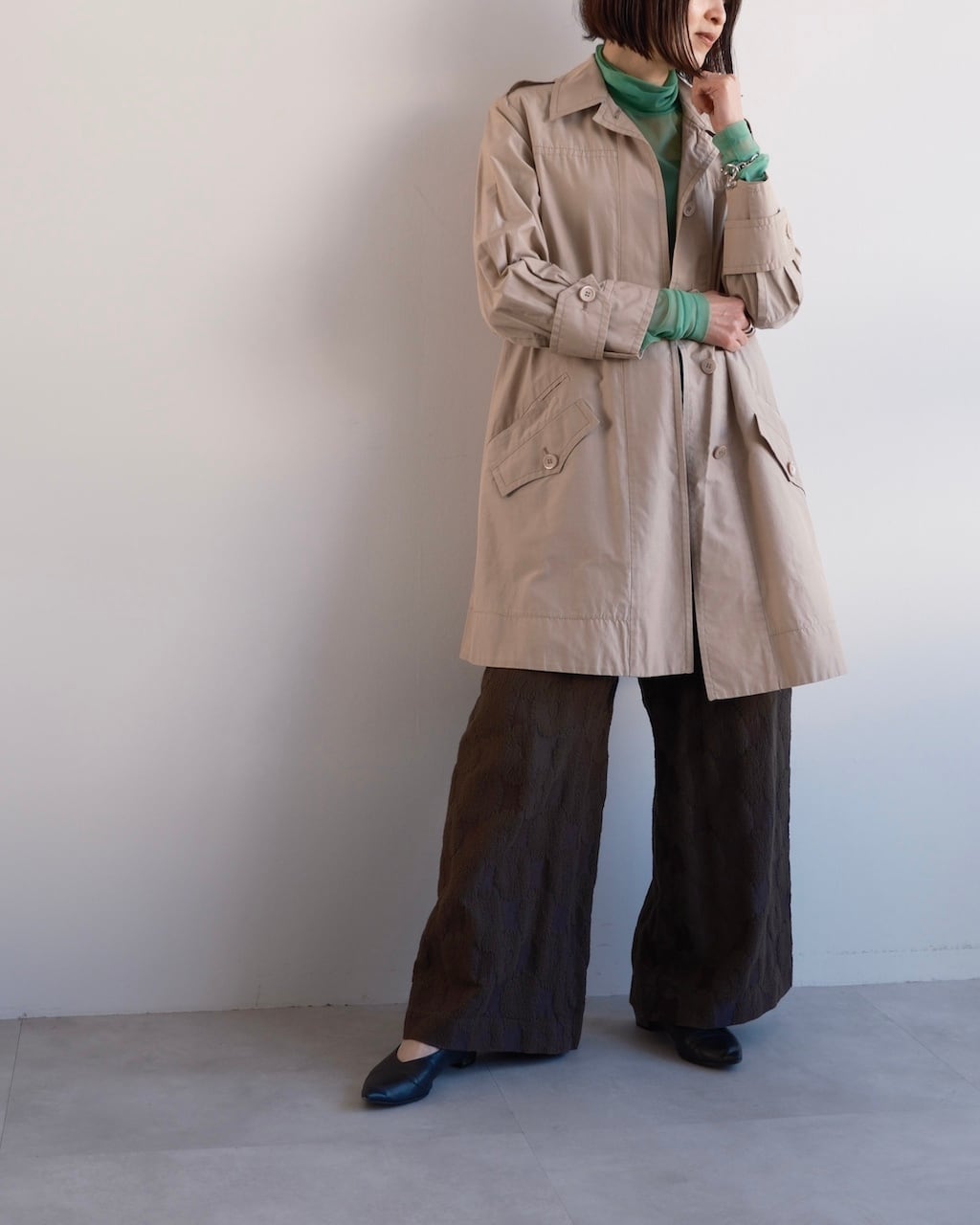 クラシックなトレンチのディテールをベースにしながら、フロントはすっきりとした比翼仕立てに。