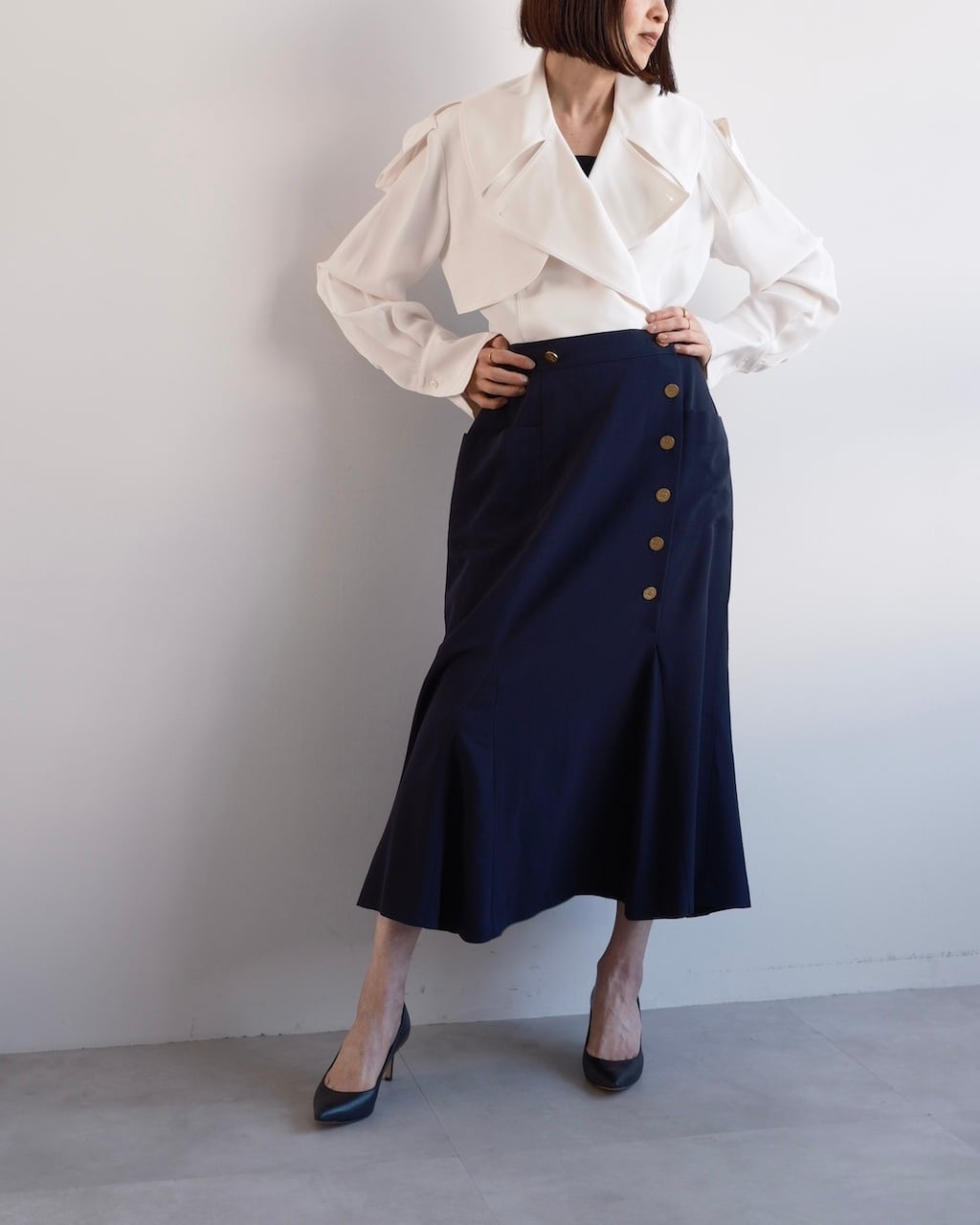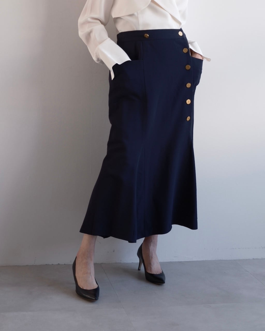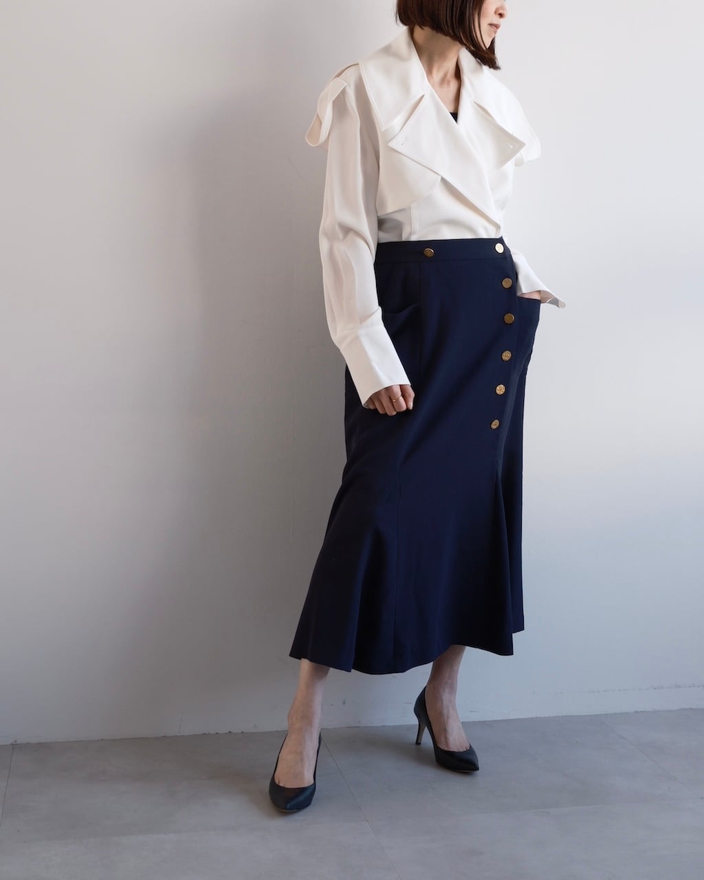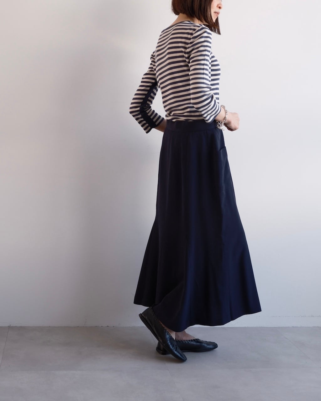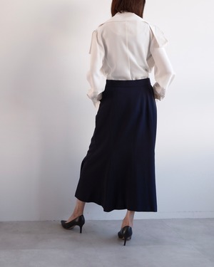 裾にかけて緩やかに広がるマーメイドラインは、動きに合わせてしなやかに揺れ、端正さの中に柔らかさを感じさせるシルエットに。