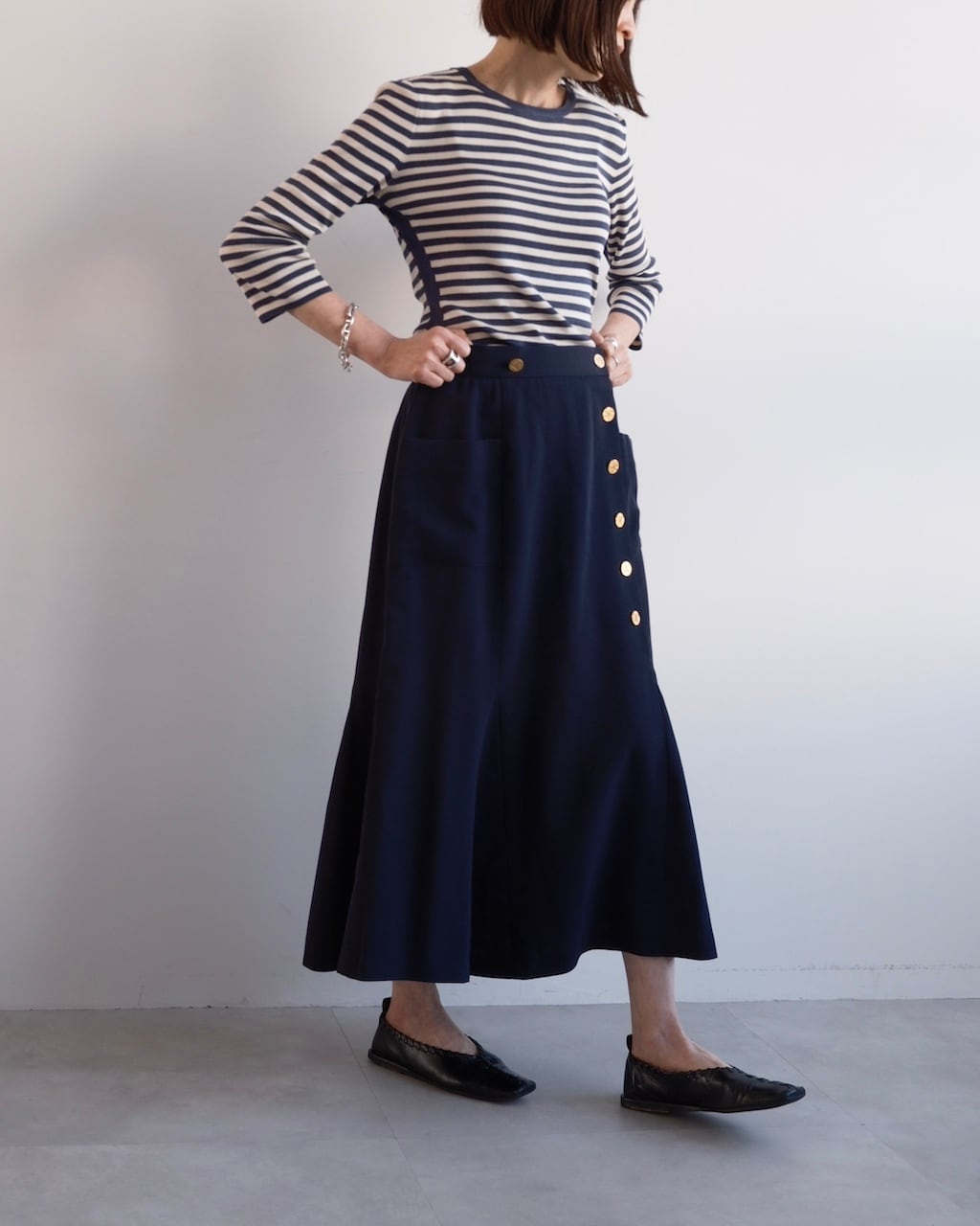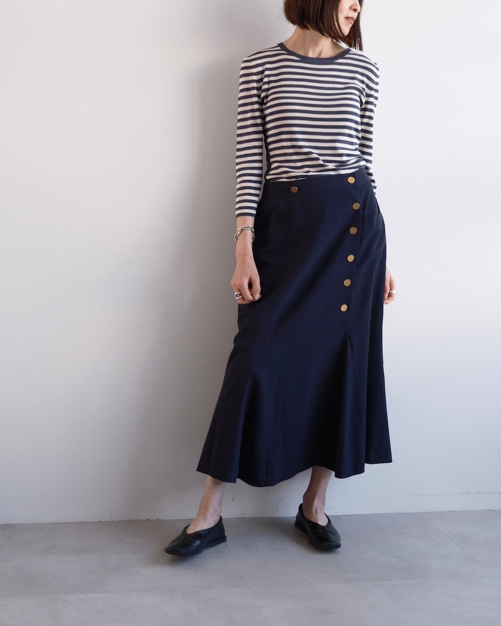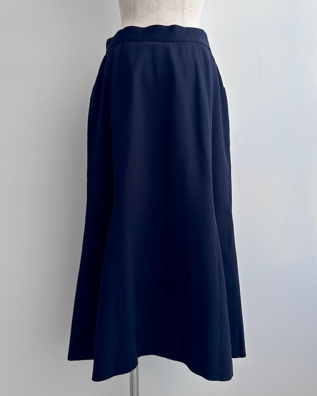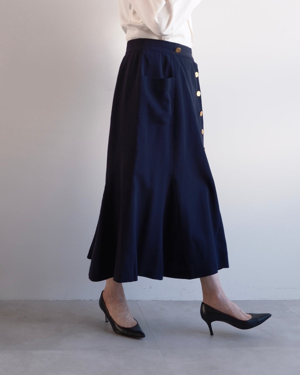 裾にかけて緩やかに広がるマーメイドラインは、動きに合わせてしなやかに揺れ、端正さの中に柔らかさを感じさせるシルエットに。